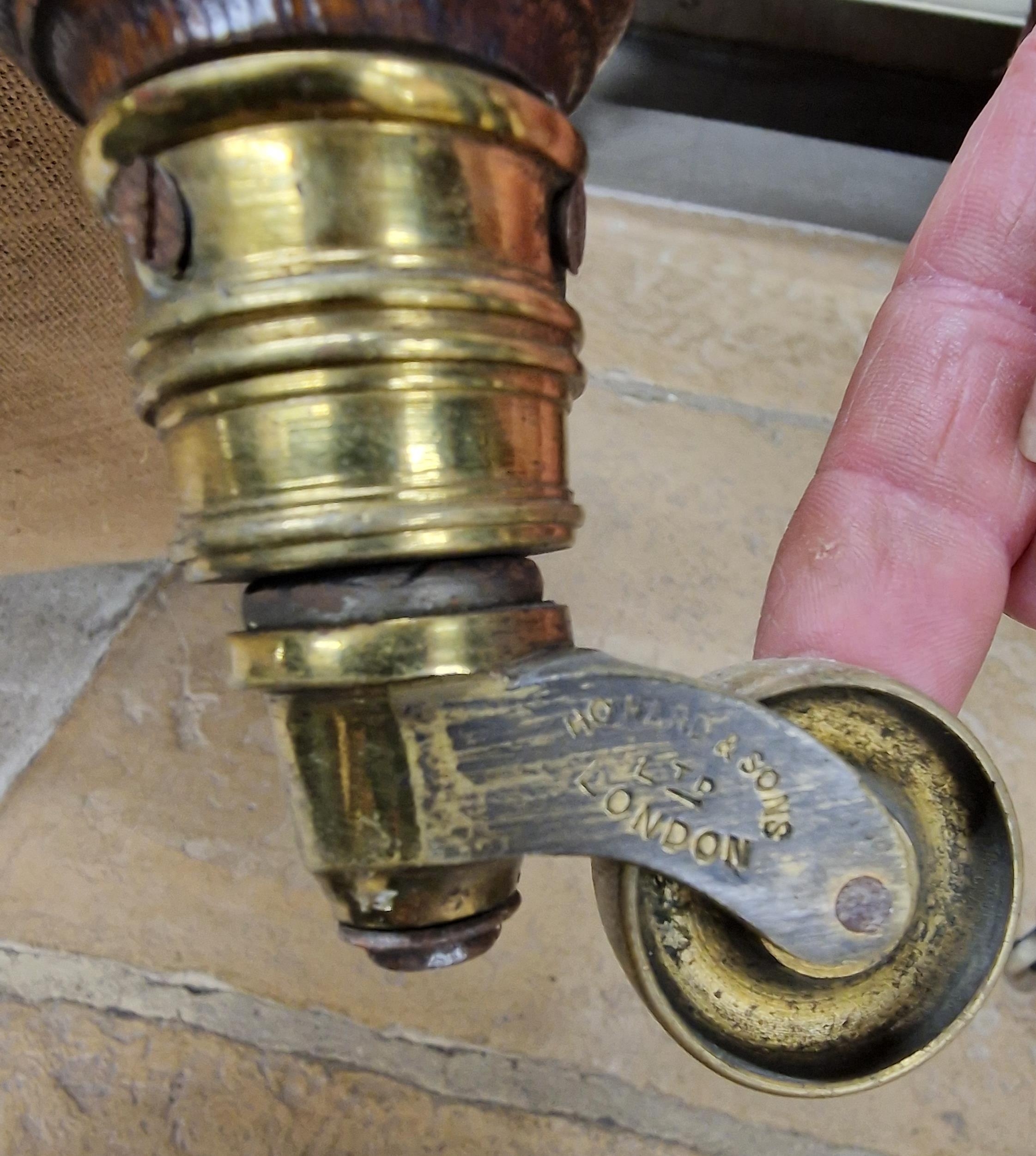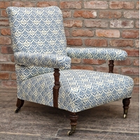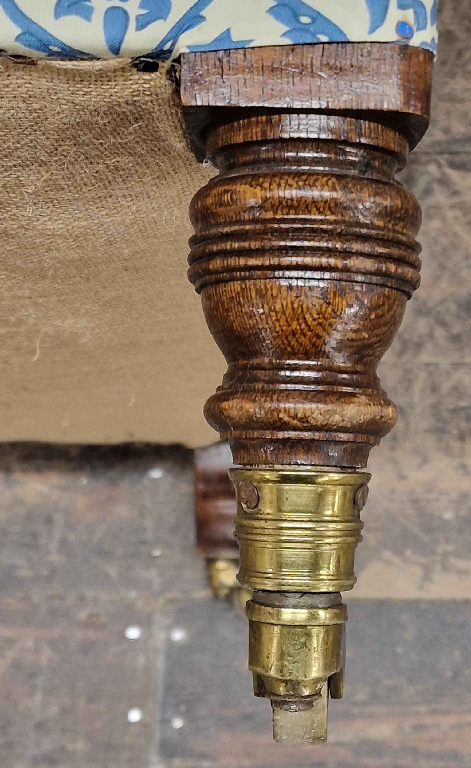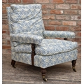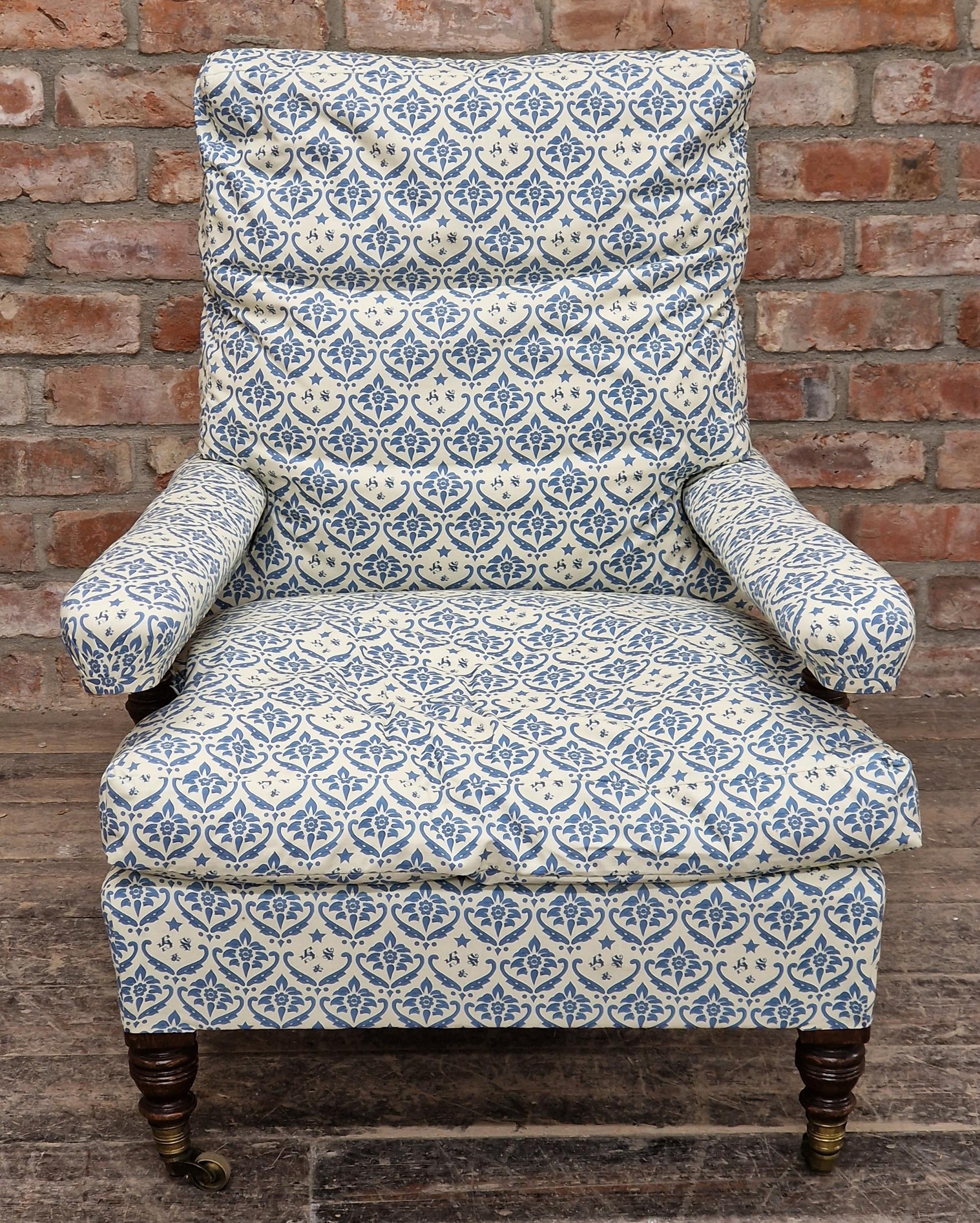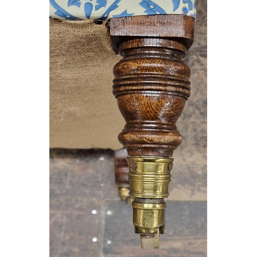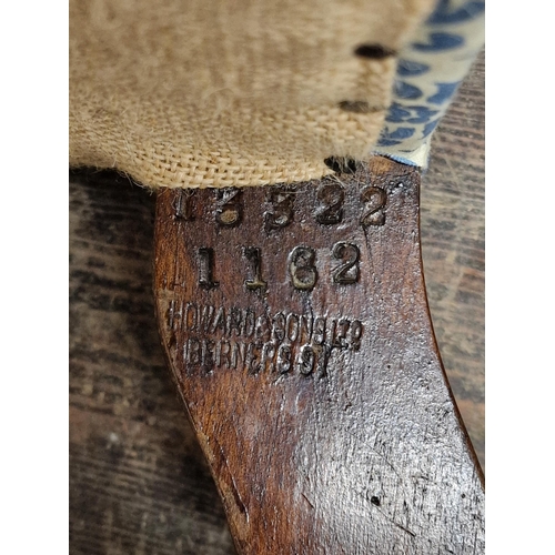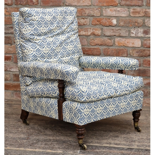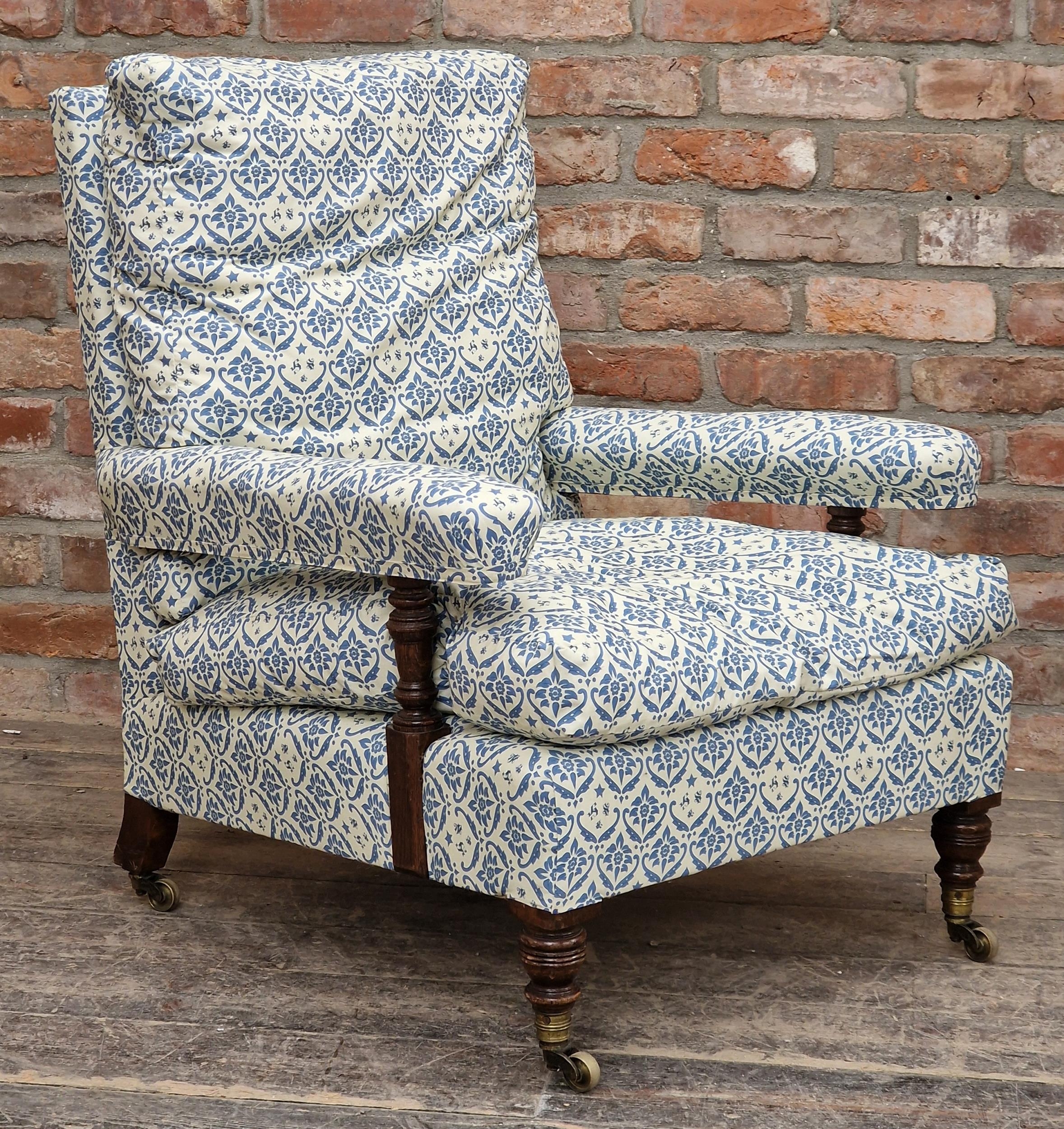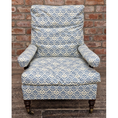 Howard and Sons - Late 19th / early 20th century open armchair, raised on turned forelegs and brass castors, stamped to back leg and castors, H 90cm x W 72cm x D 75cm