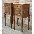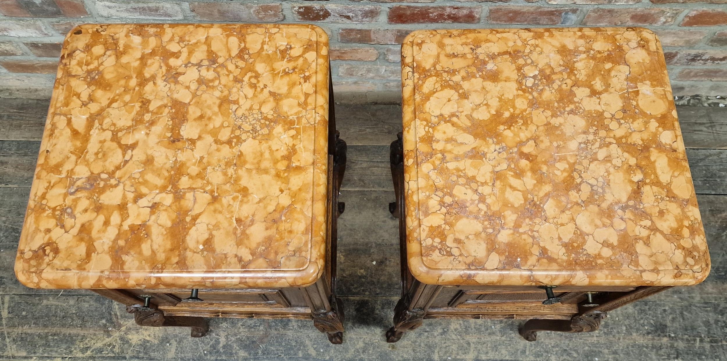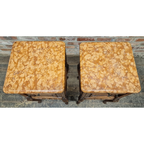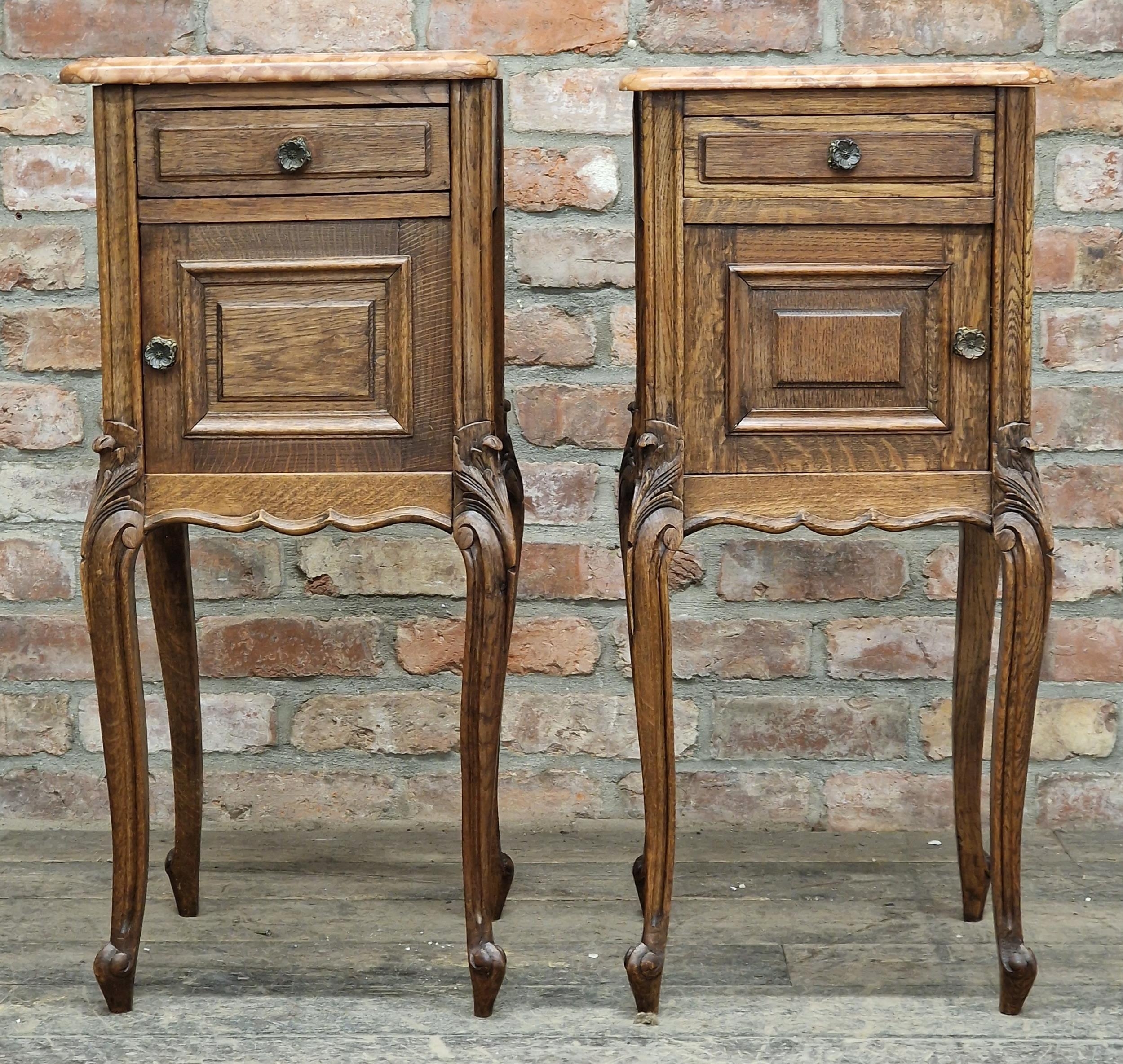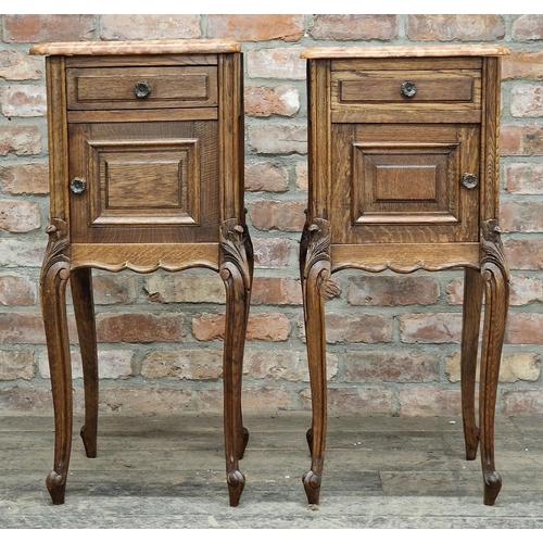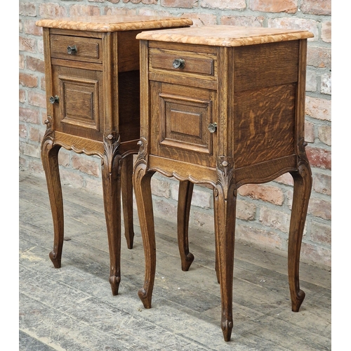 Pair of French oak bedside tables with marble tops, fitted with single drawers and metal lined cupboards, raised on cabriole supports, H 90cm x W 40cm x D 40cm (2)