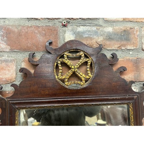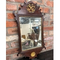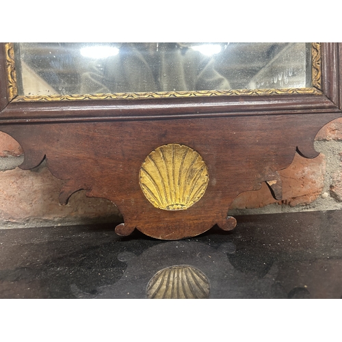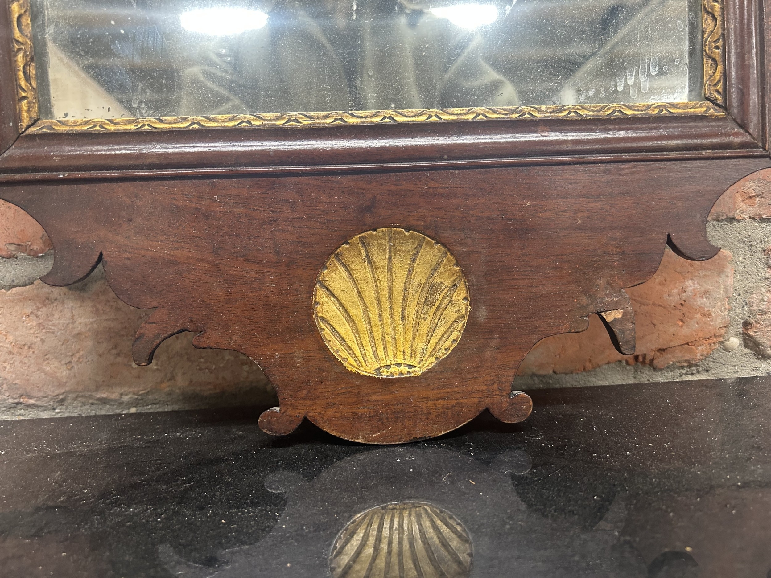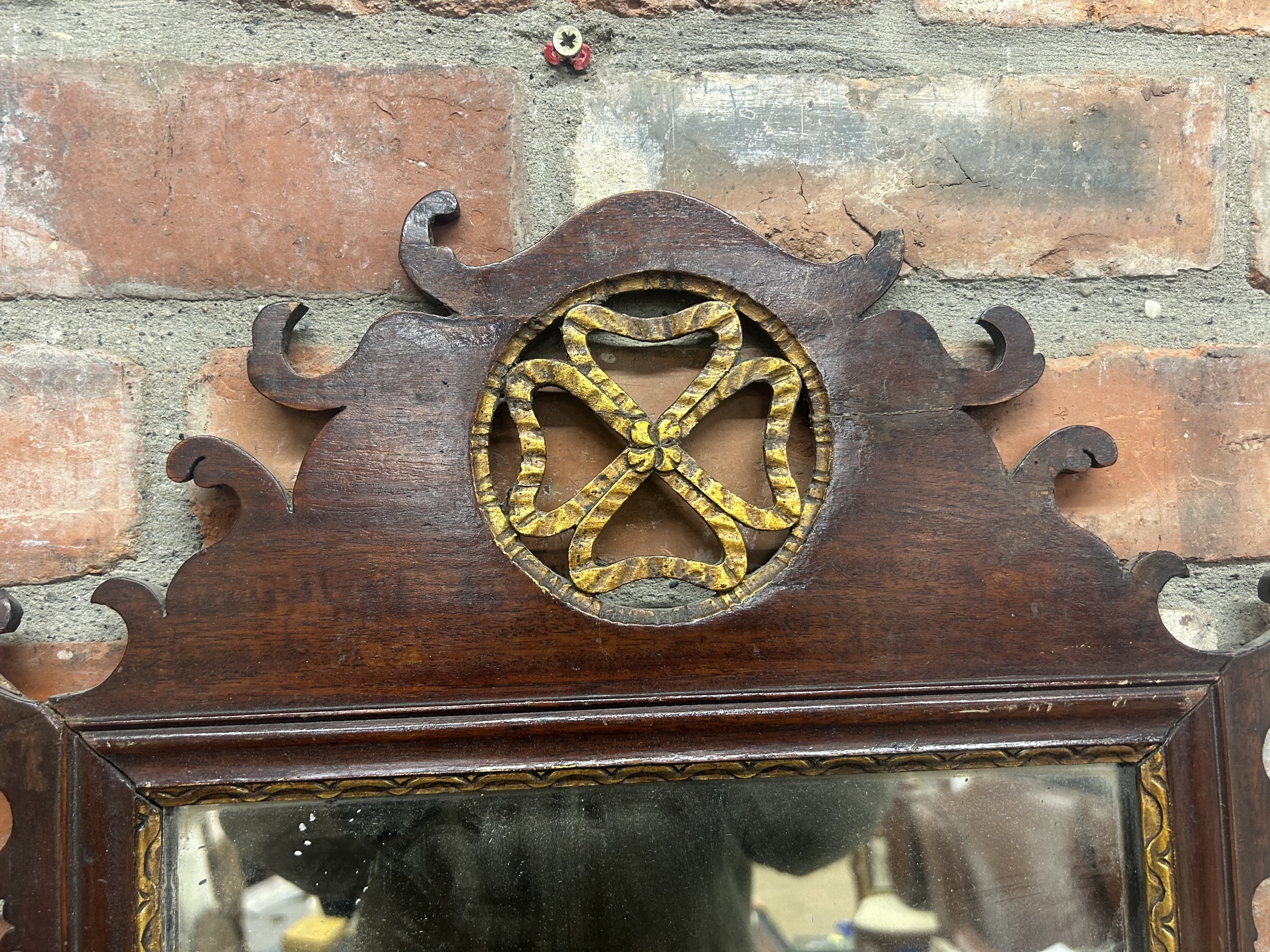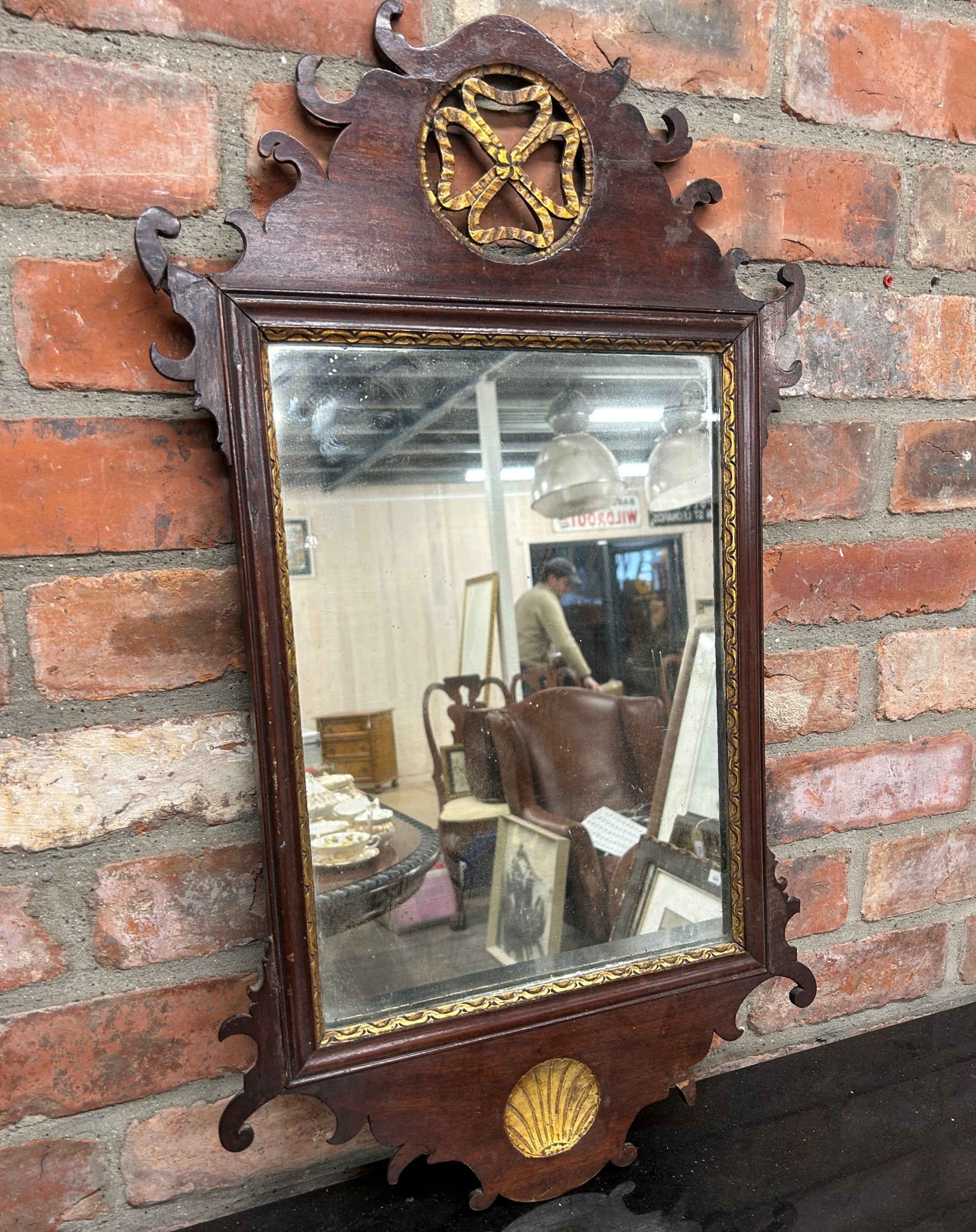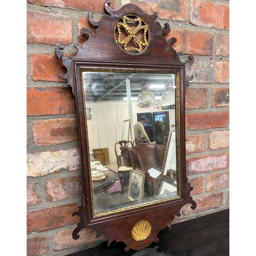 Antique fretwork wall mirror with scrolled gold mirror border, ribbon and scallop shell decoration, H 75cm x W 44cm