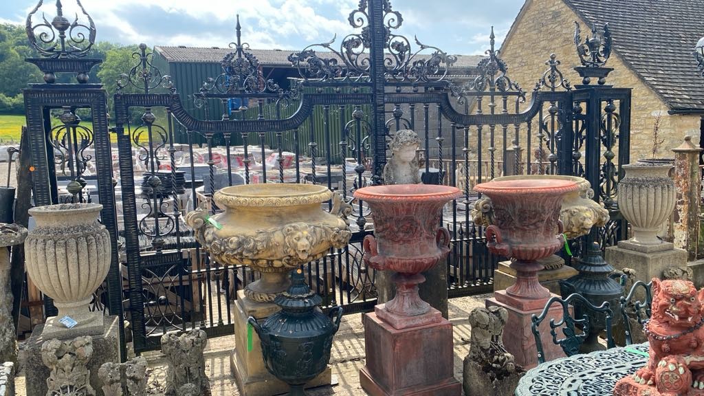 Massive and impressive pair of wrought iron estate gates and posts, 285cm x 500cm the gates themselves are 400cm