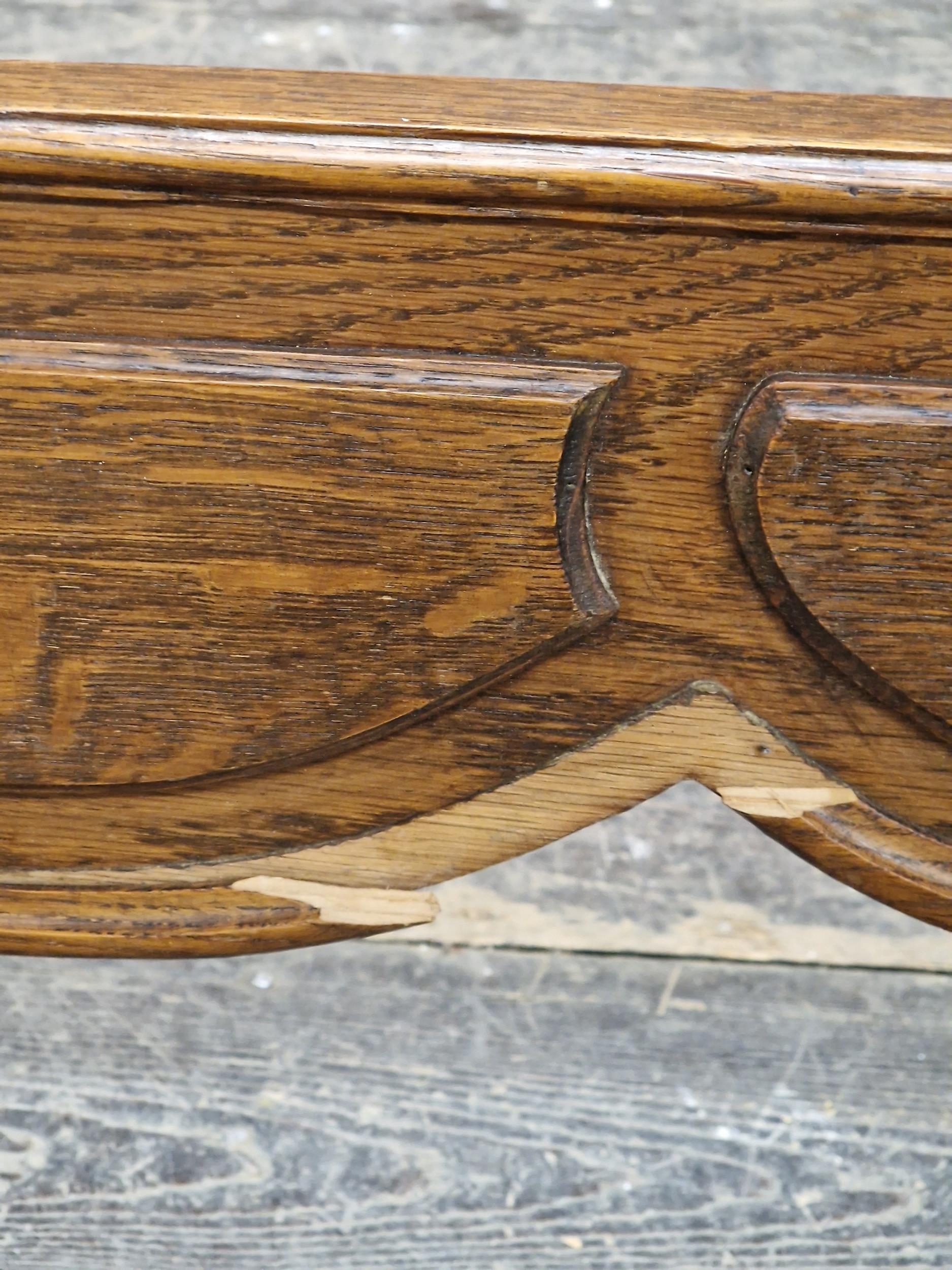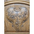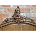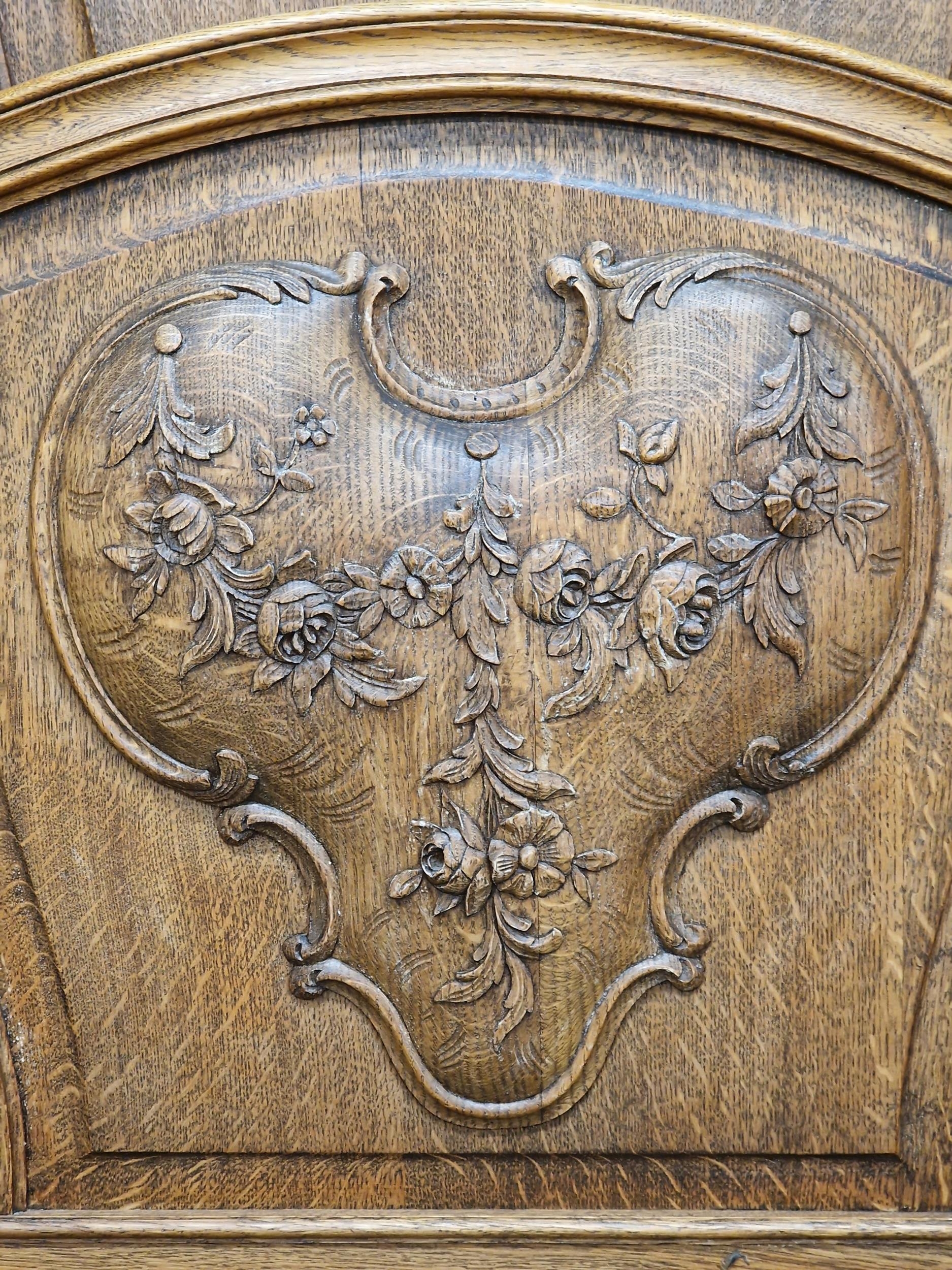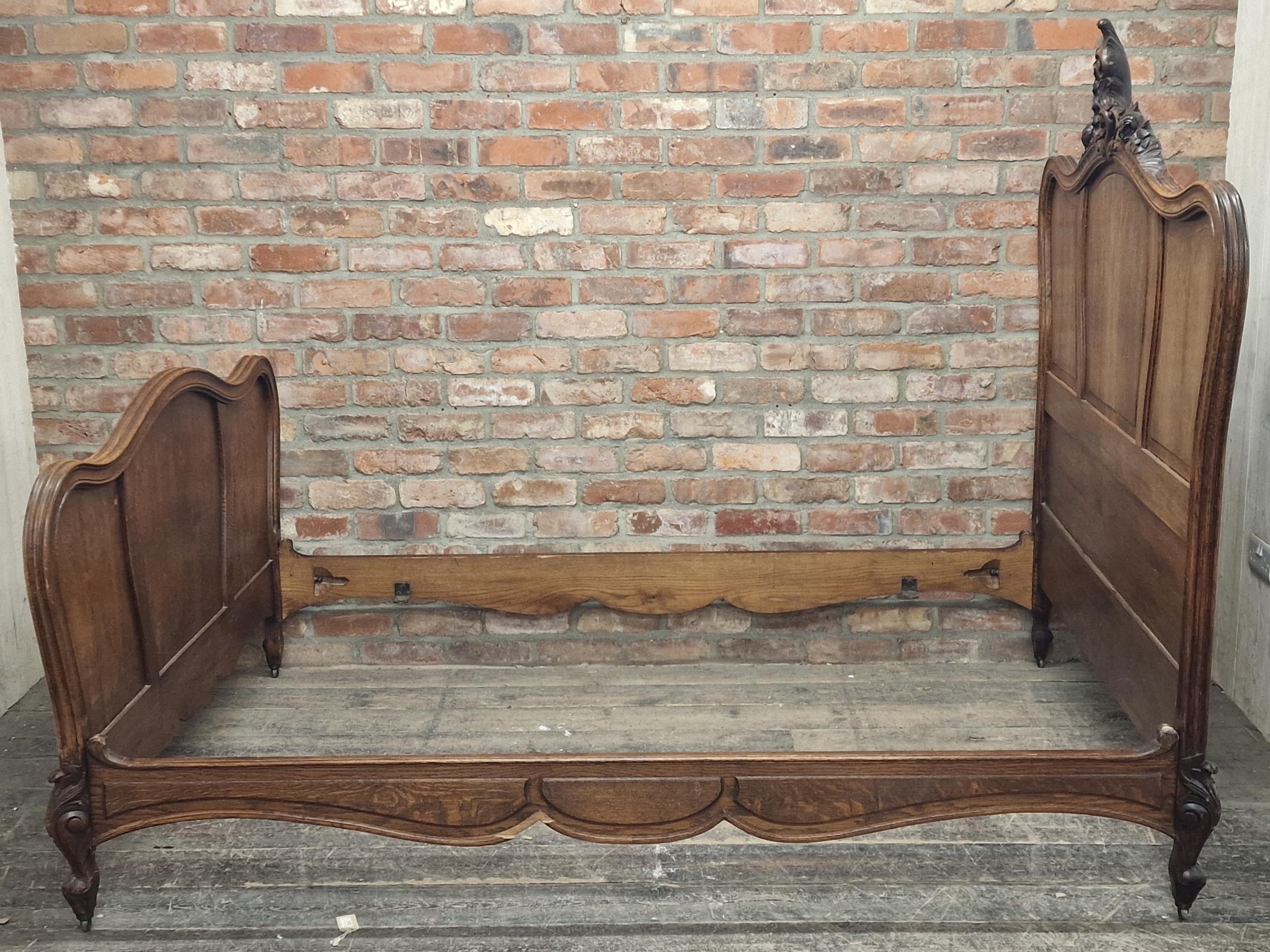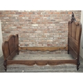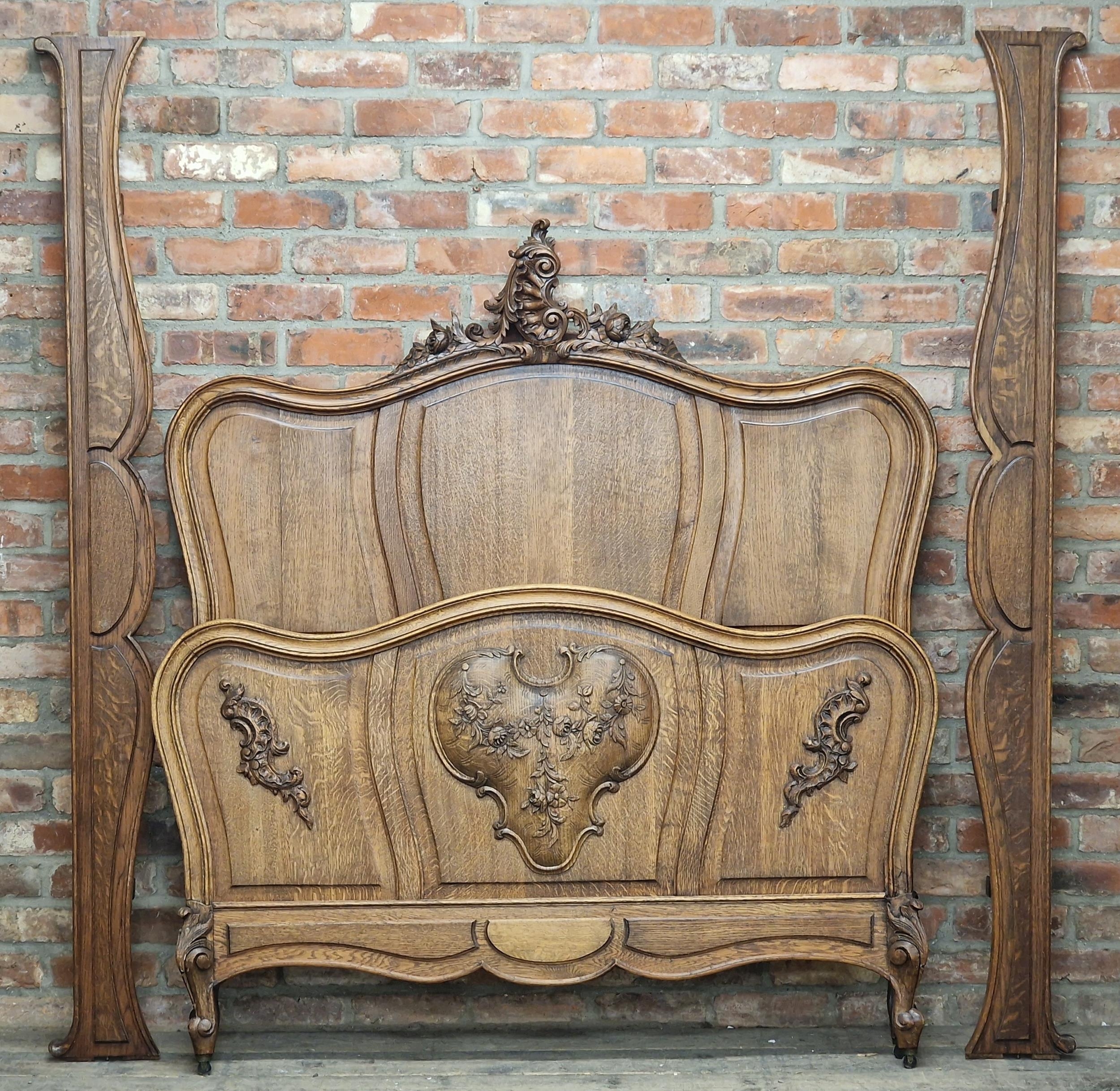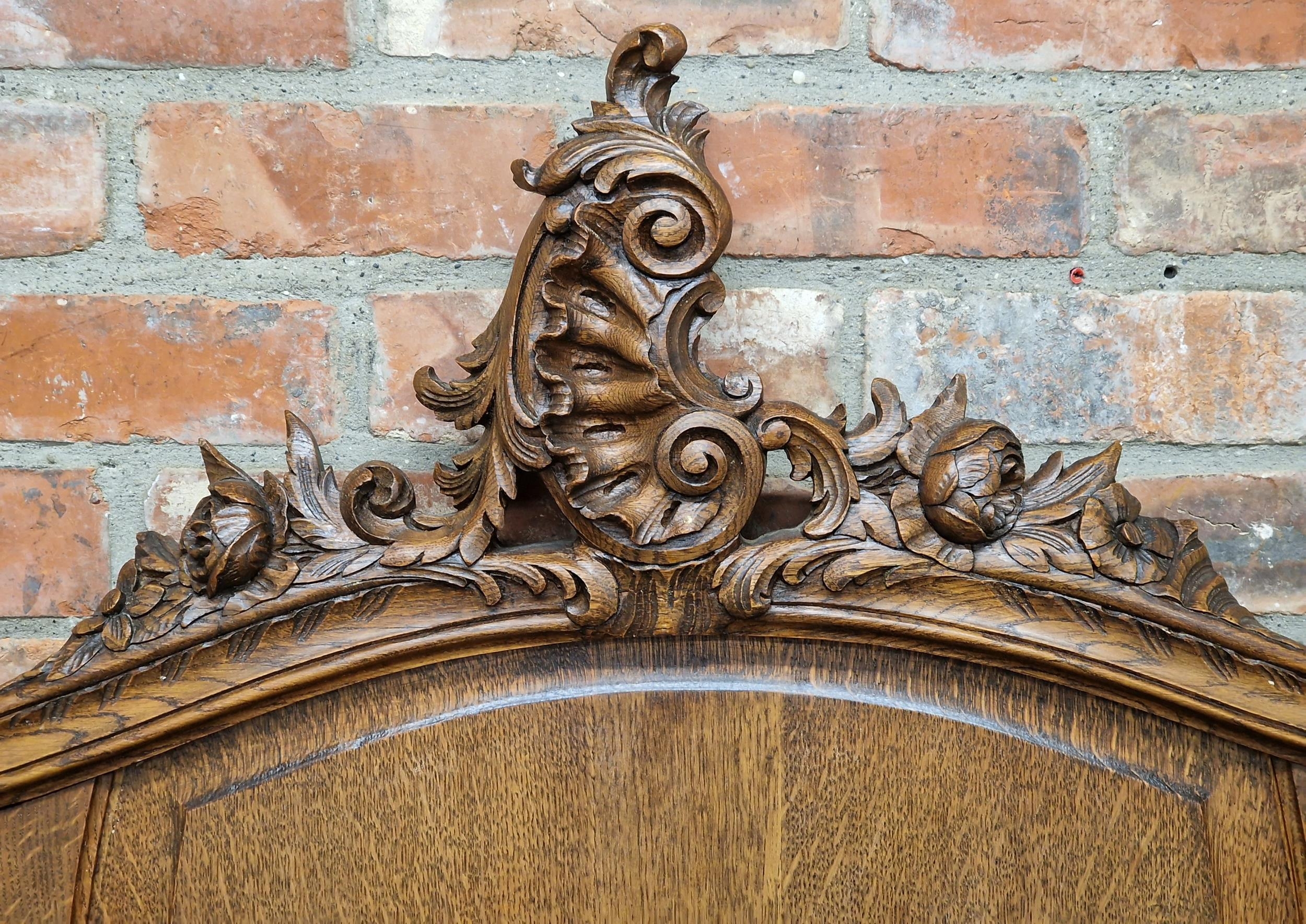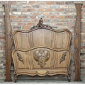19th century French oak bed with carved scrolling detail, H 167cm x W 151cm x D 210cm