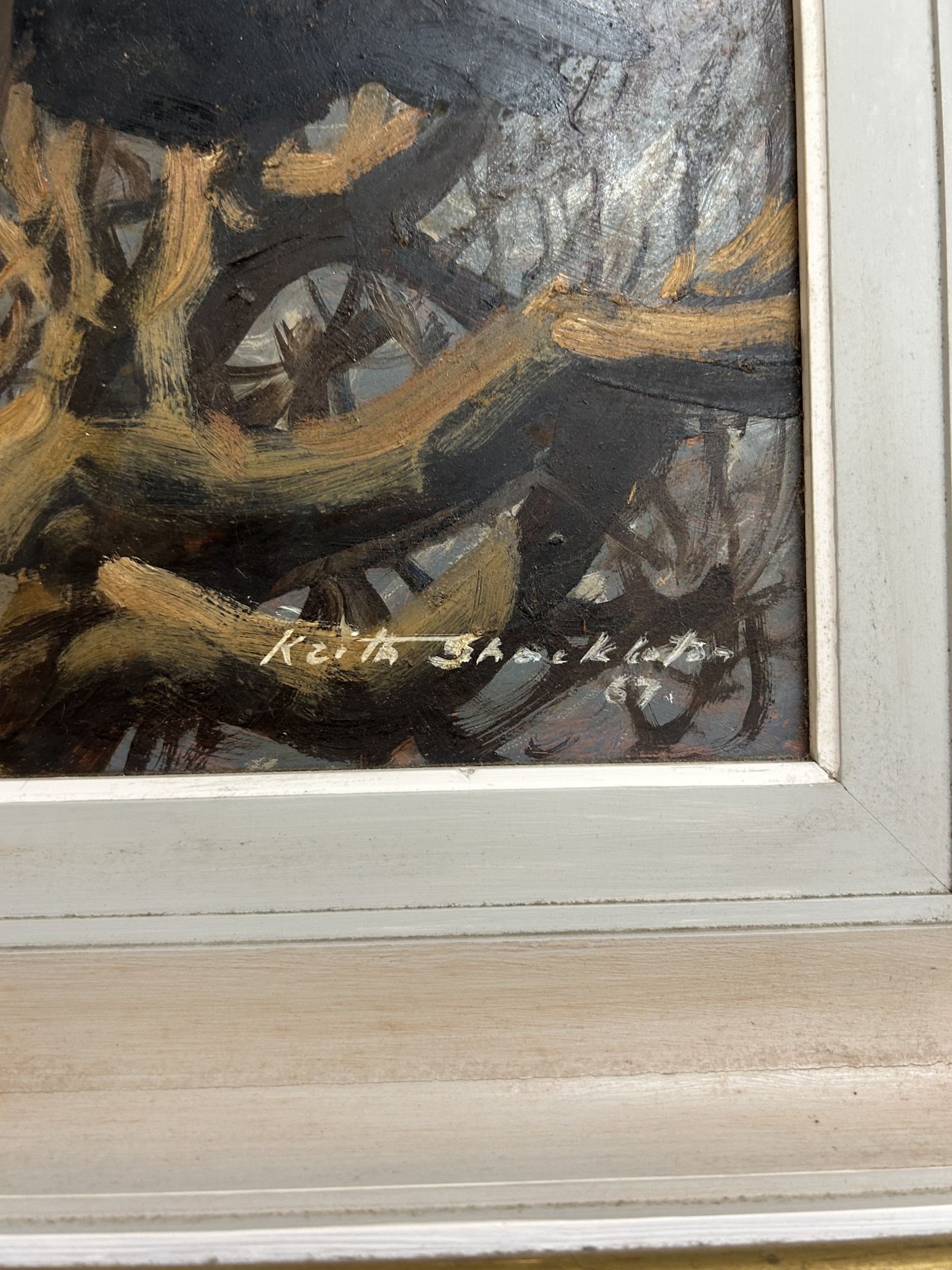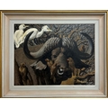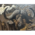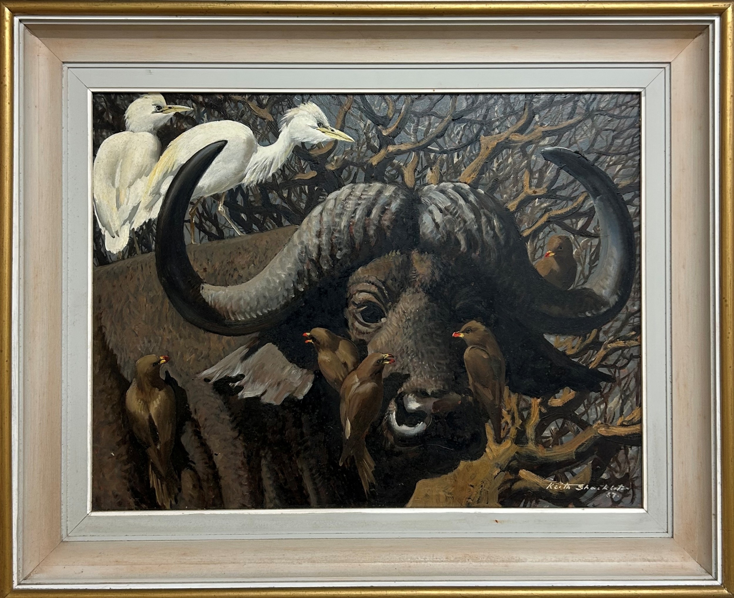 Keith Hope Shackleton (British, 1923-2015) study of a Buffalo ridden by egret and oxpeckers, signed and dated, oil on board, 60cm x 43cm, framed