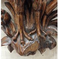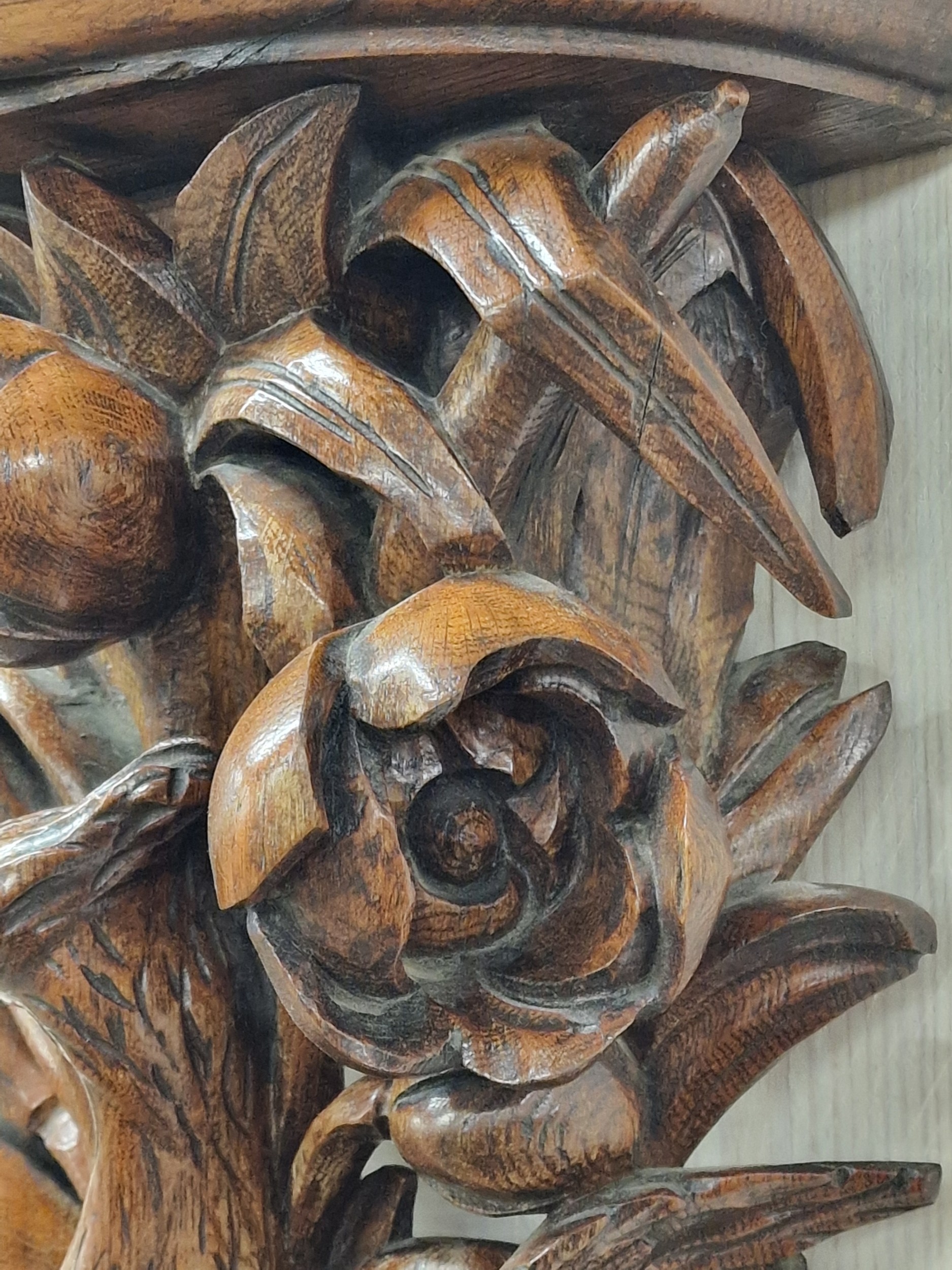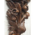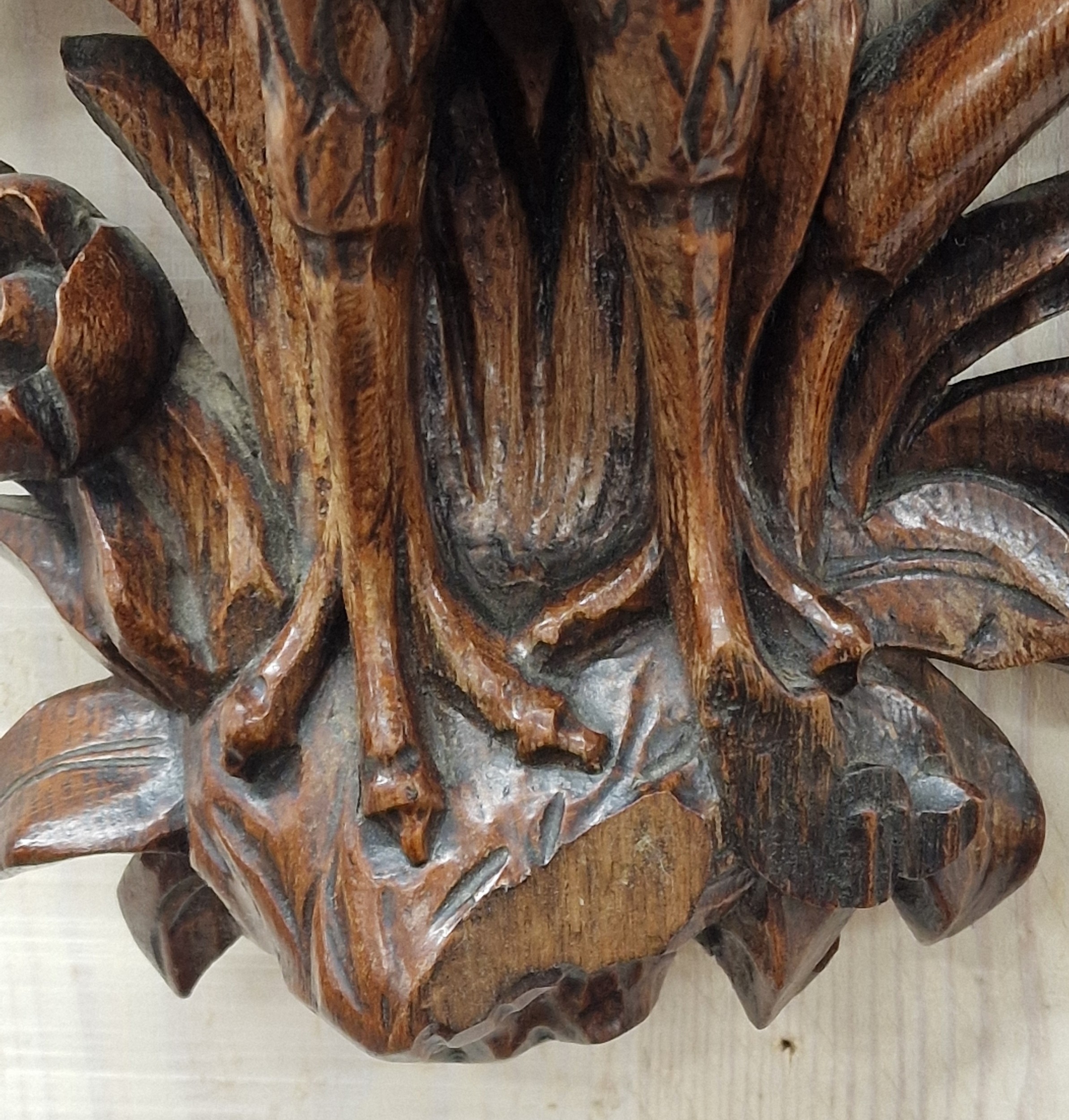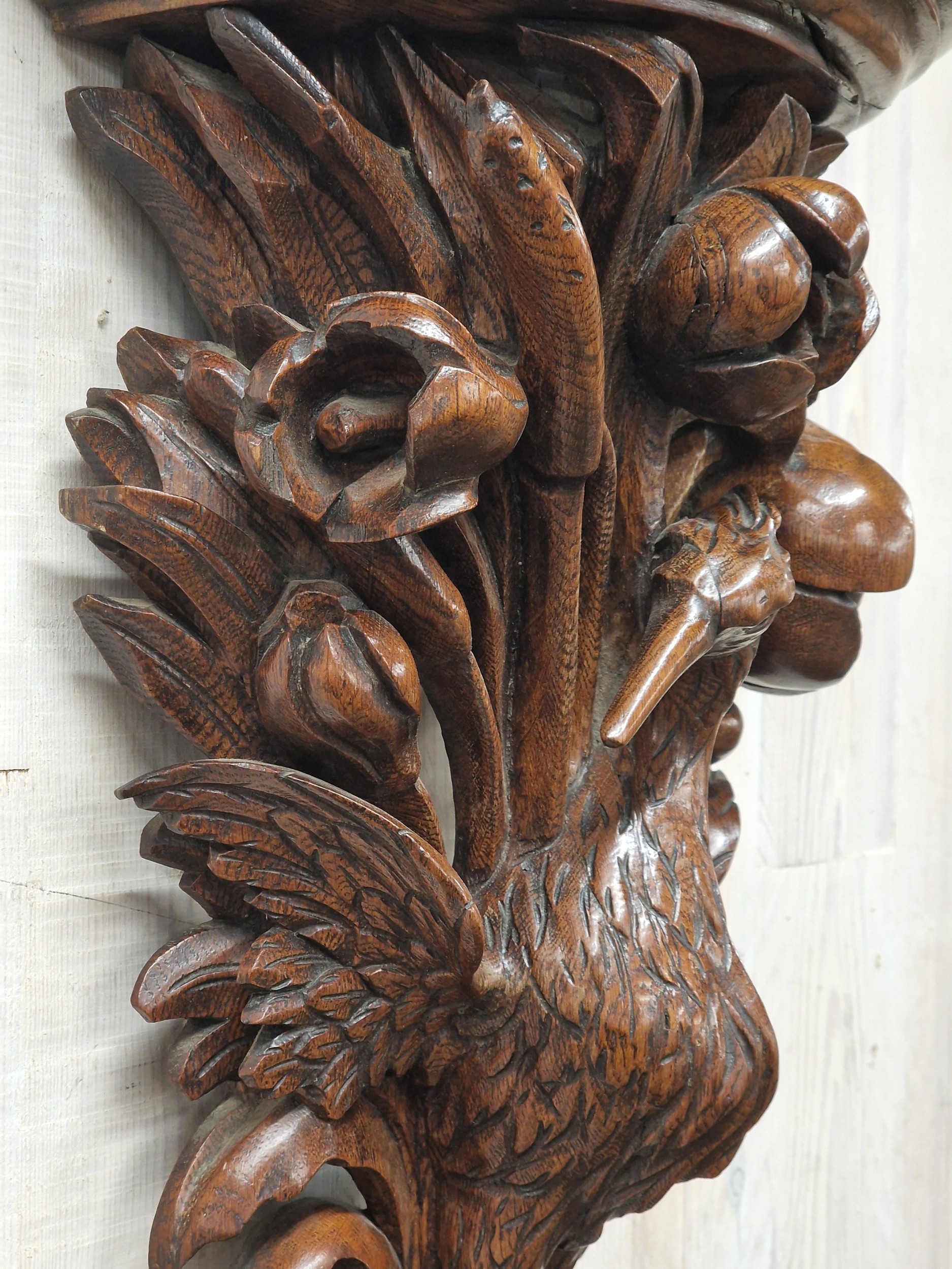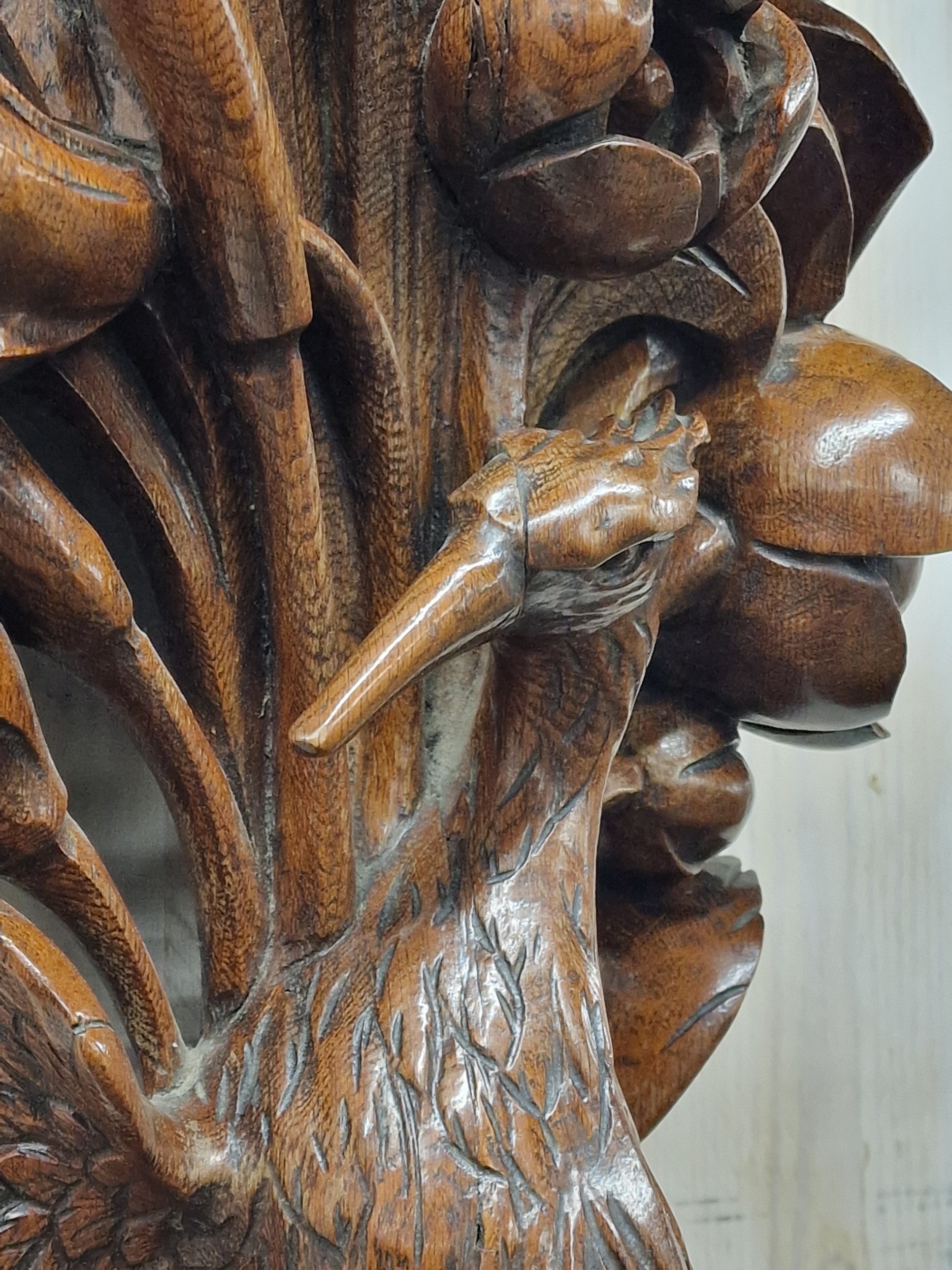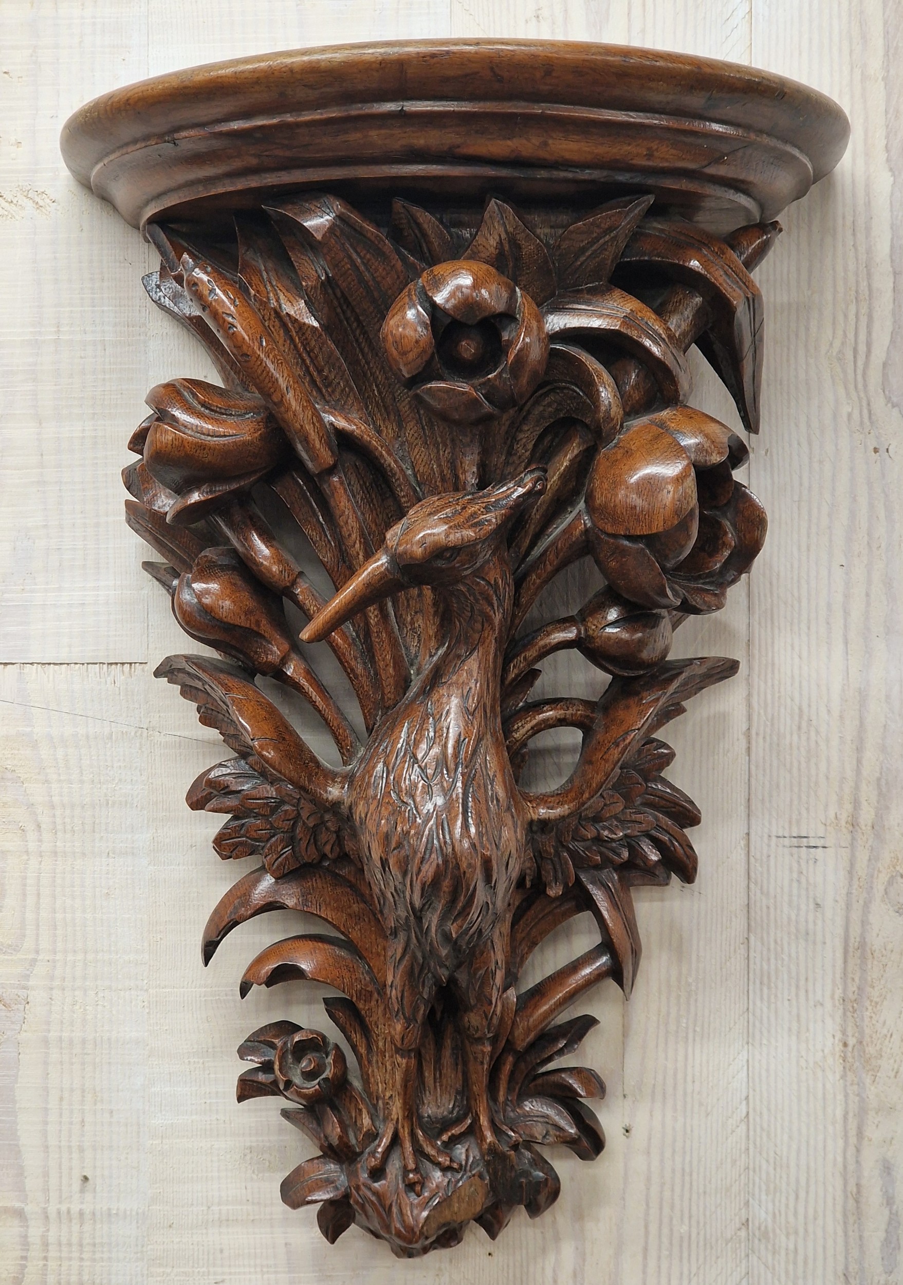 Well crafted 19th century carved oak wall bracket in the Black Forest manner, modelled as a heron or hoho bird amidst reeds, the top inscribed 'J & L TRUEMAN MANUFACTUERS DONCASTER', H 50 x W 35 x D 19cm (piece missing at base under the birds feet)