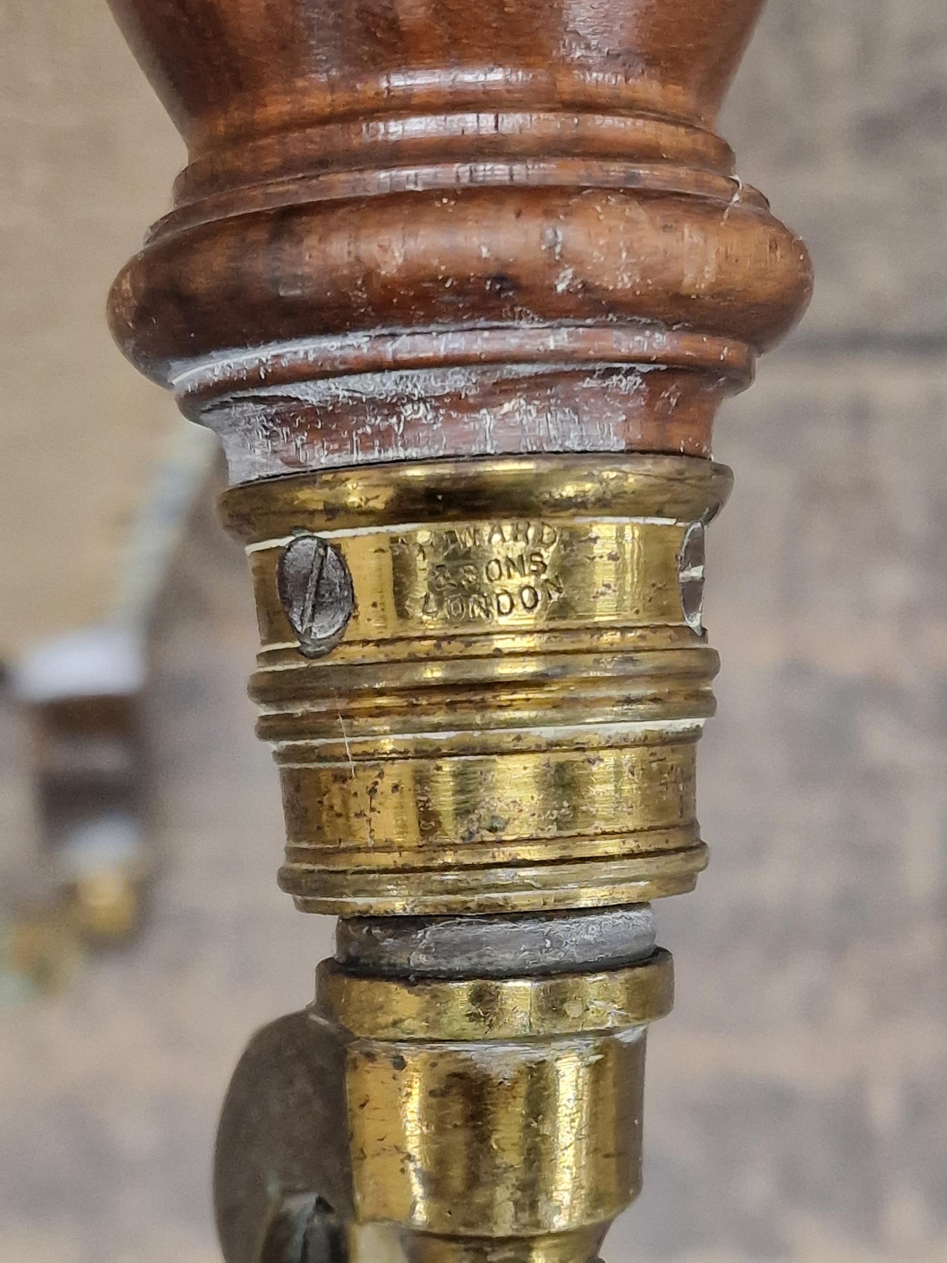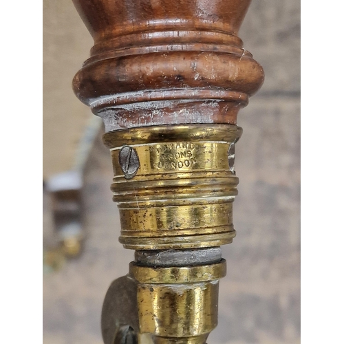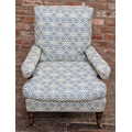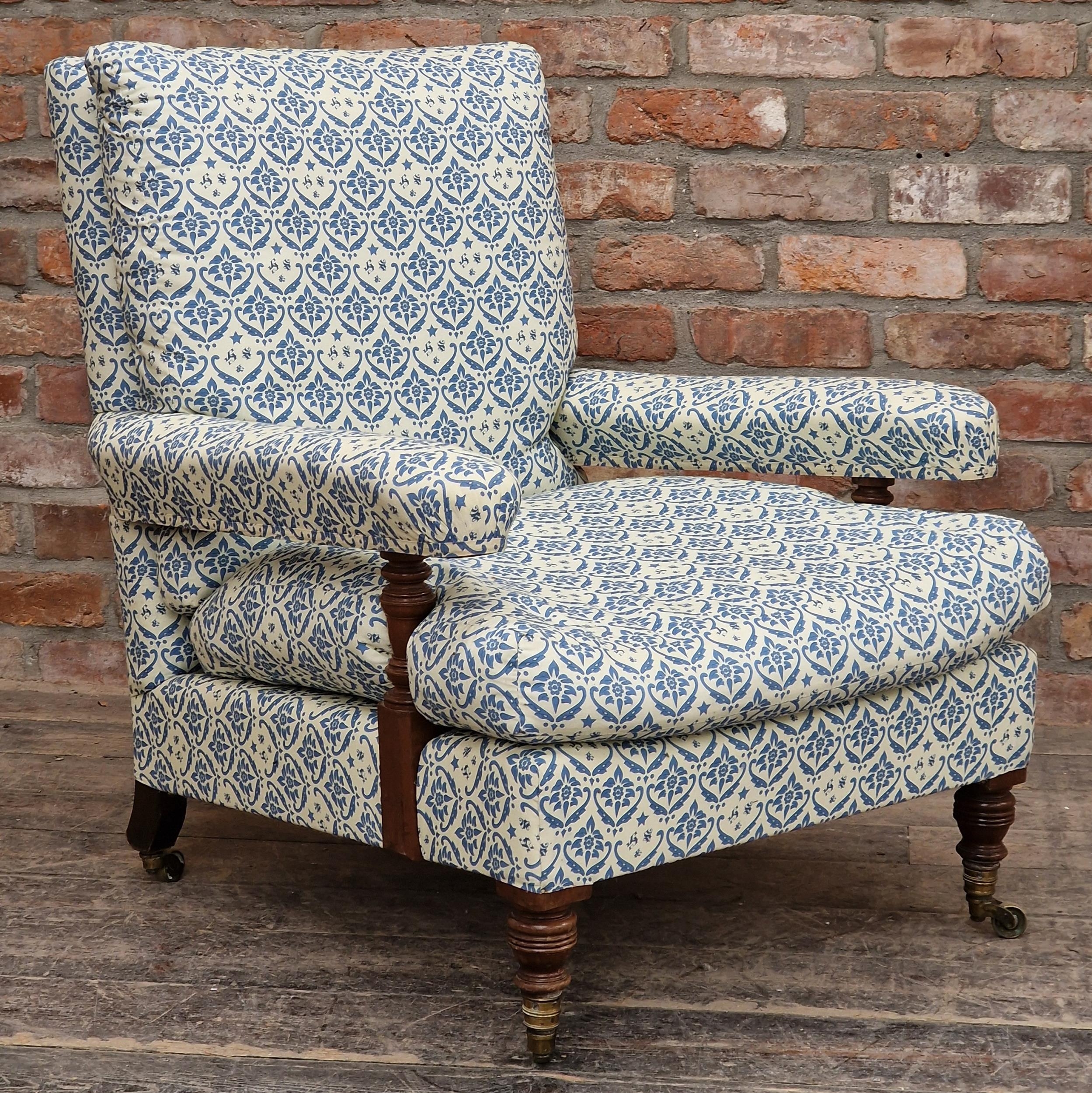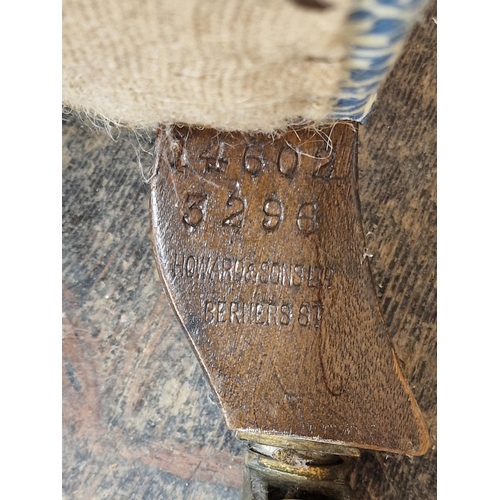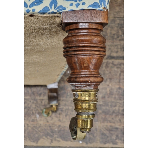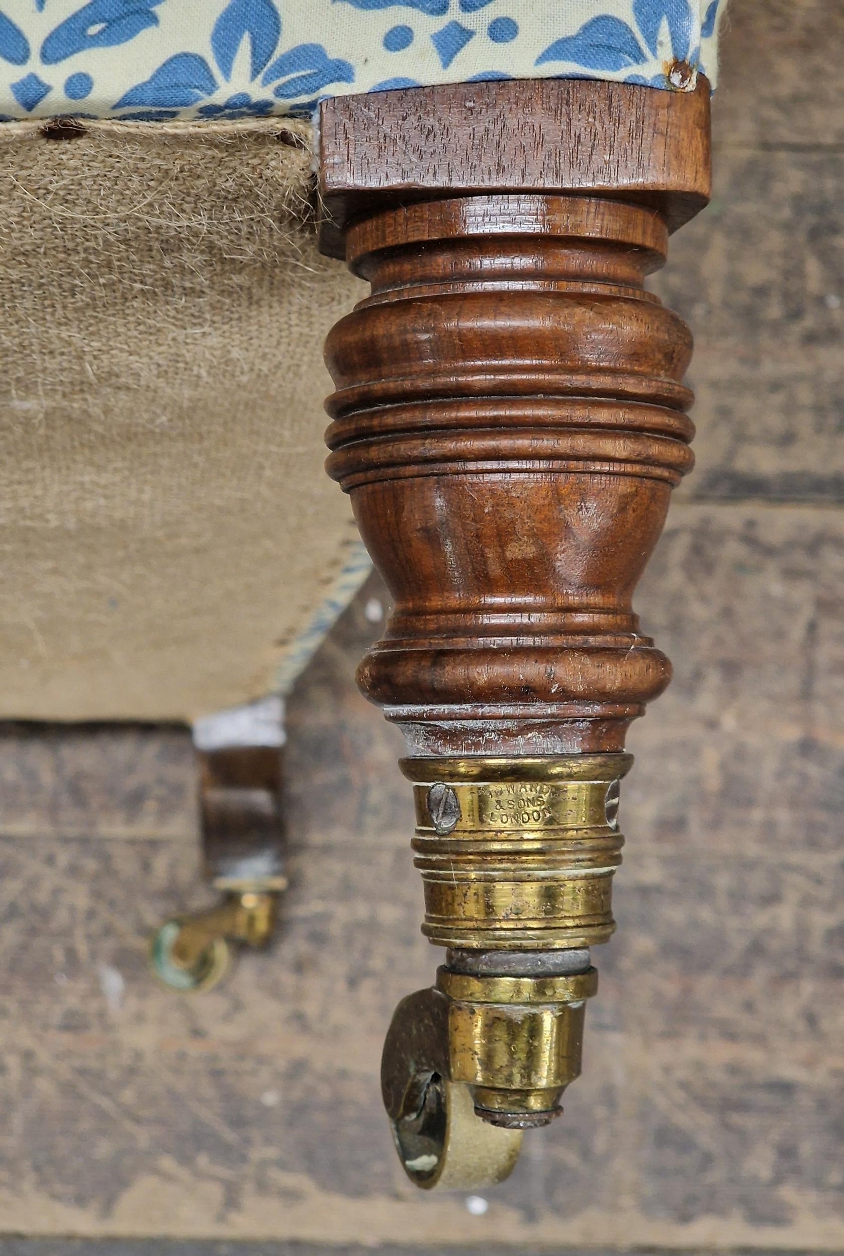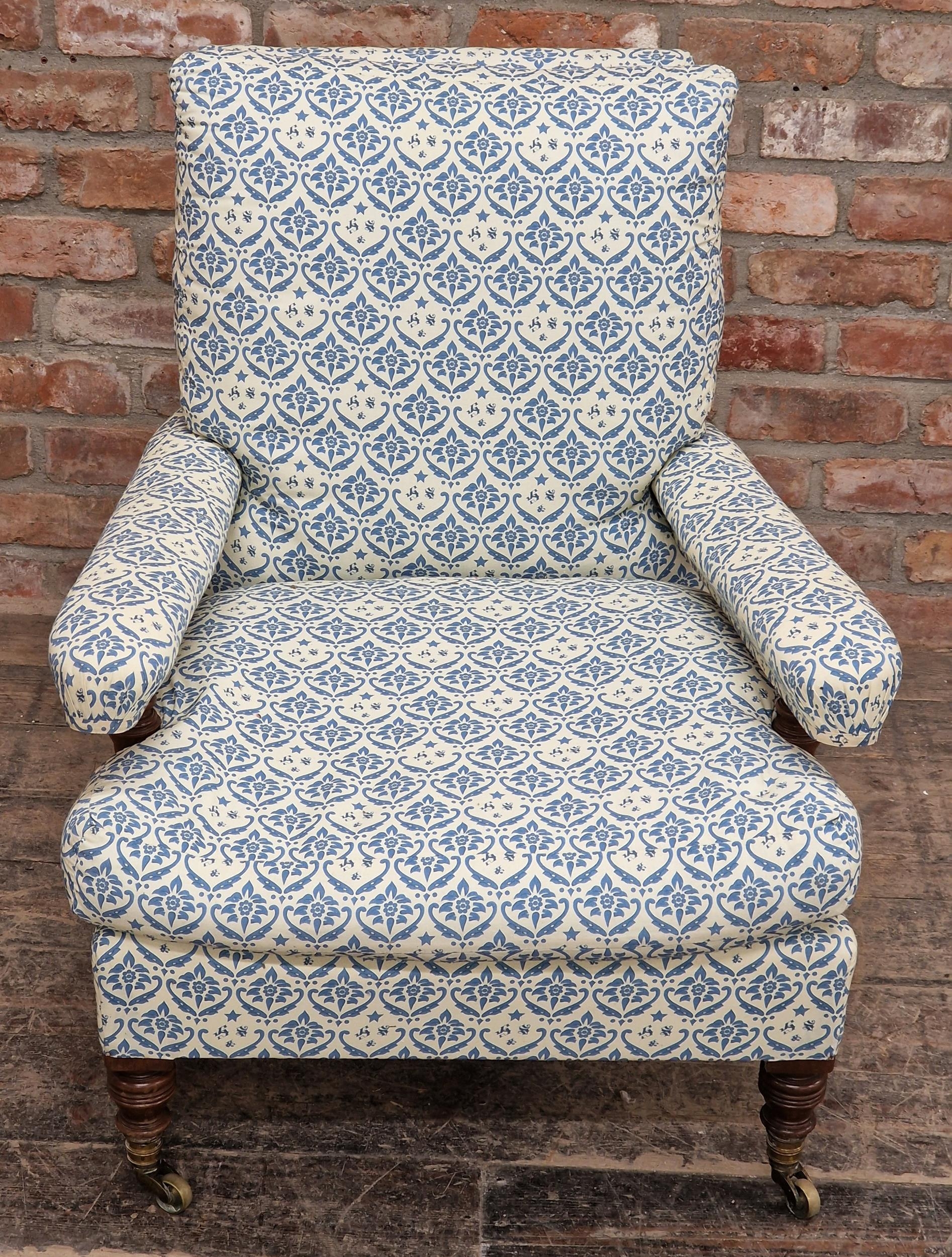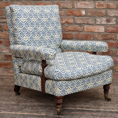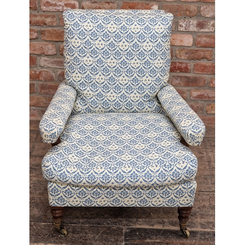 Howard and Sons - Late 19th / early 20th century open armchair, raised on turned forelegs and brass castors, stamped to back leg and castors, H 90cm x W 72cm x D 75cm
