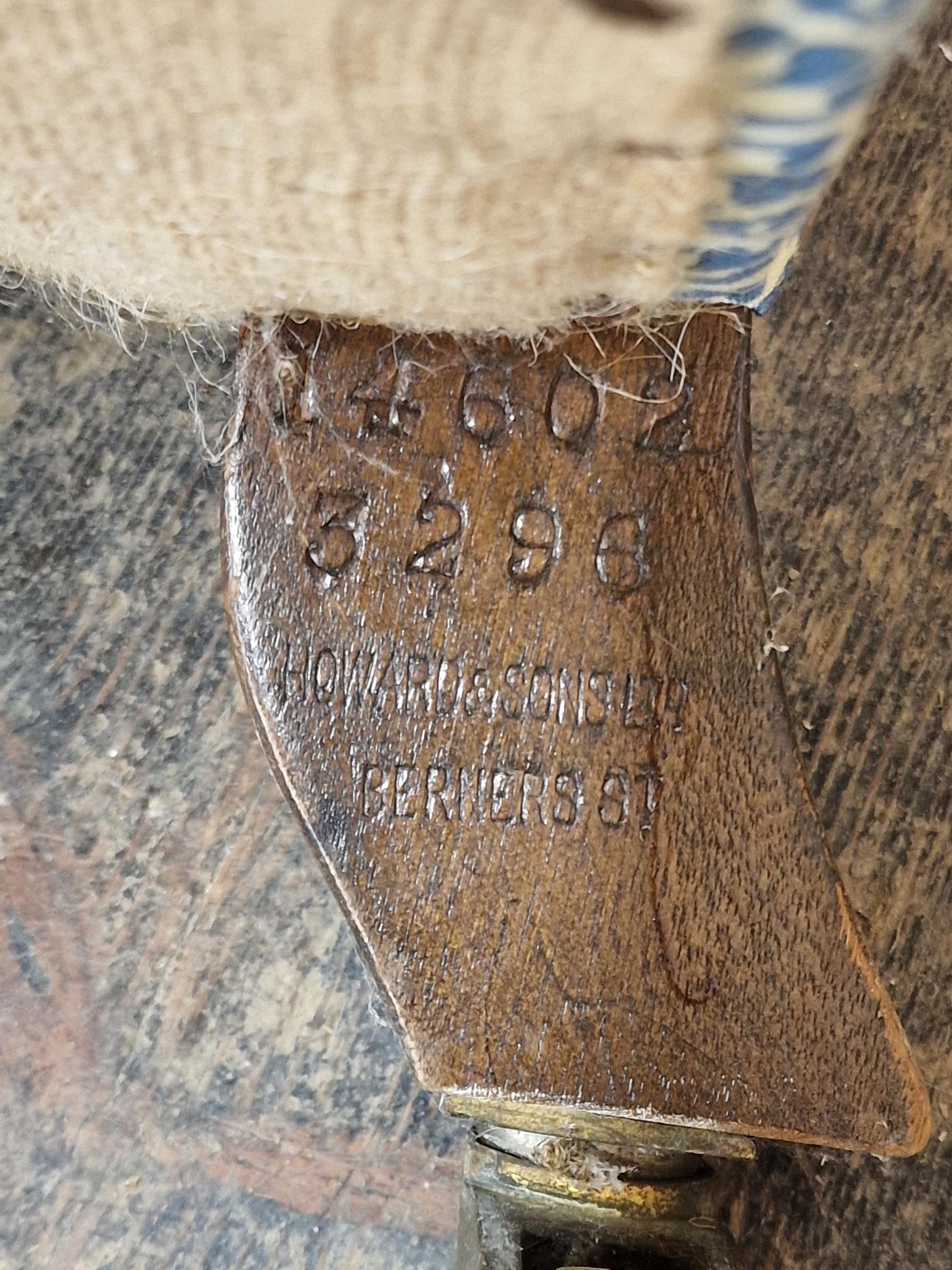 A collective report on the four Howard Chairs - condition is very good, no signs of repairs and no major faults or defects to report. The upholstery is clean and free of stains, tears or rips. There is some minor wear to the wooden frame and legs but this is minimal and to be expected with a piece of this age. Please see attached pictures of the chairs below.