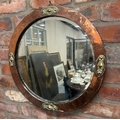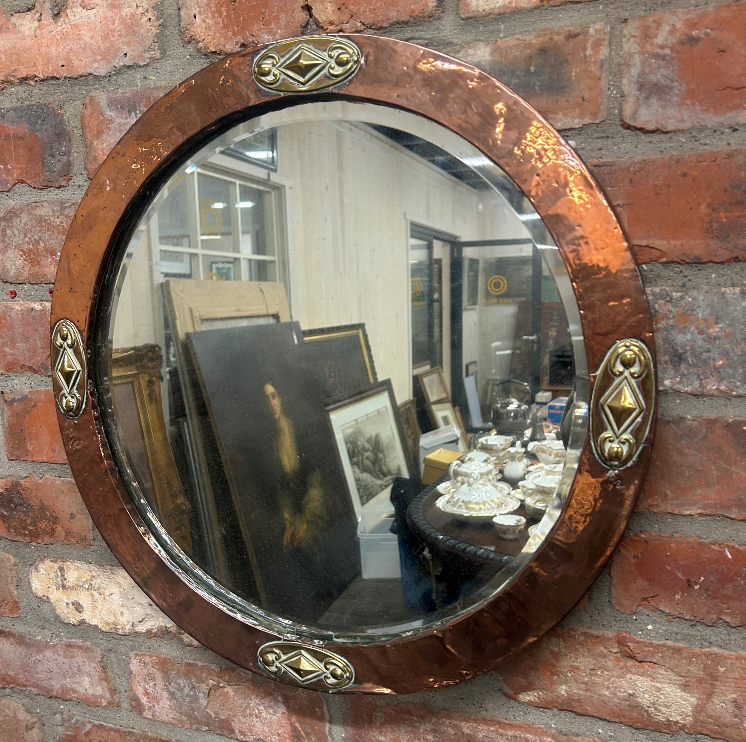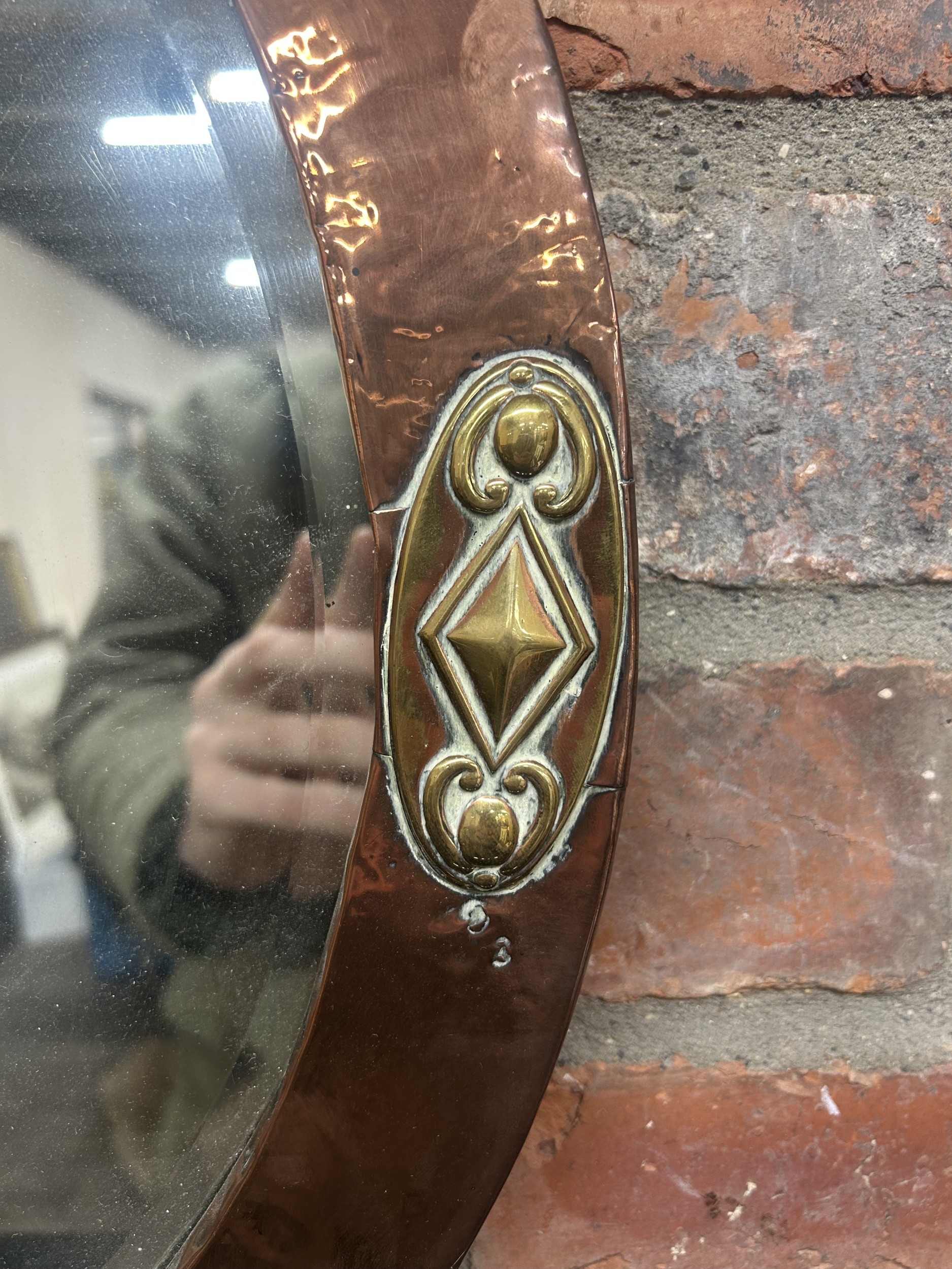 Antique Liberty style copper and brass circular wall mirror, D 53cm