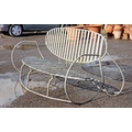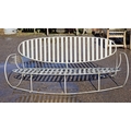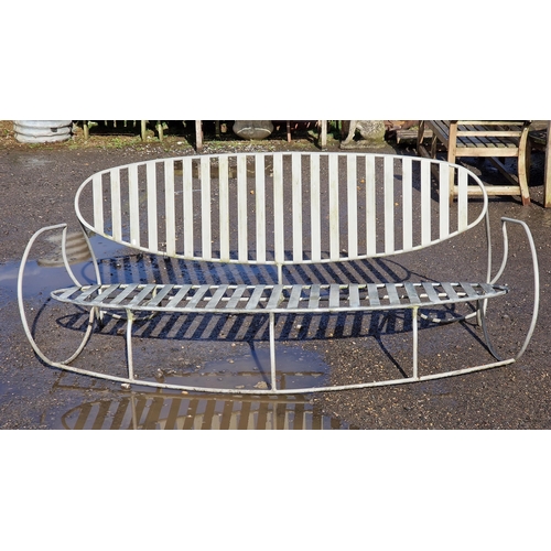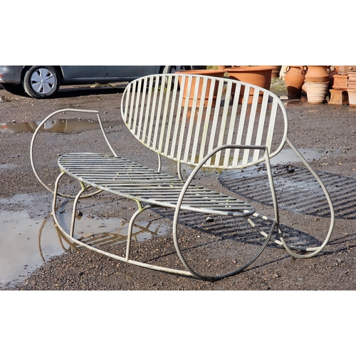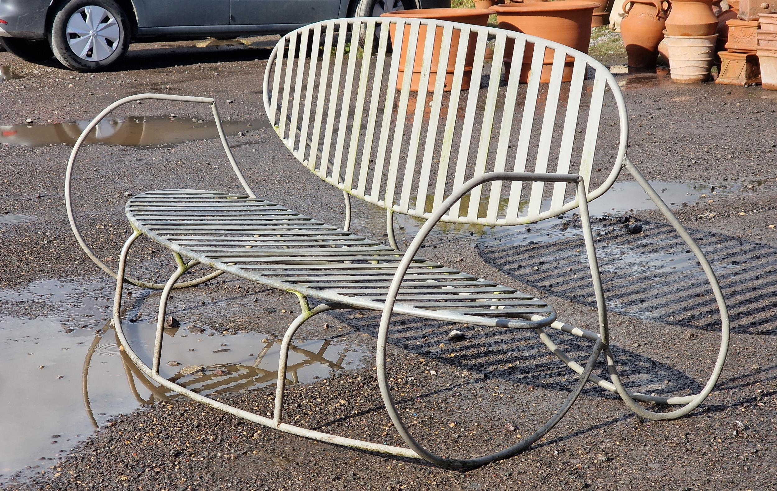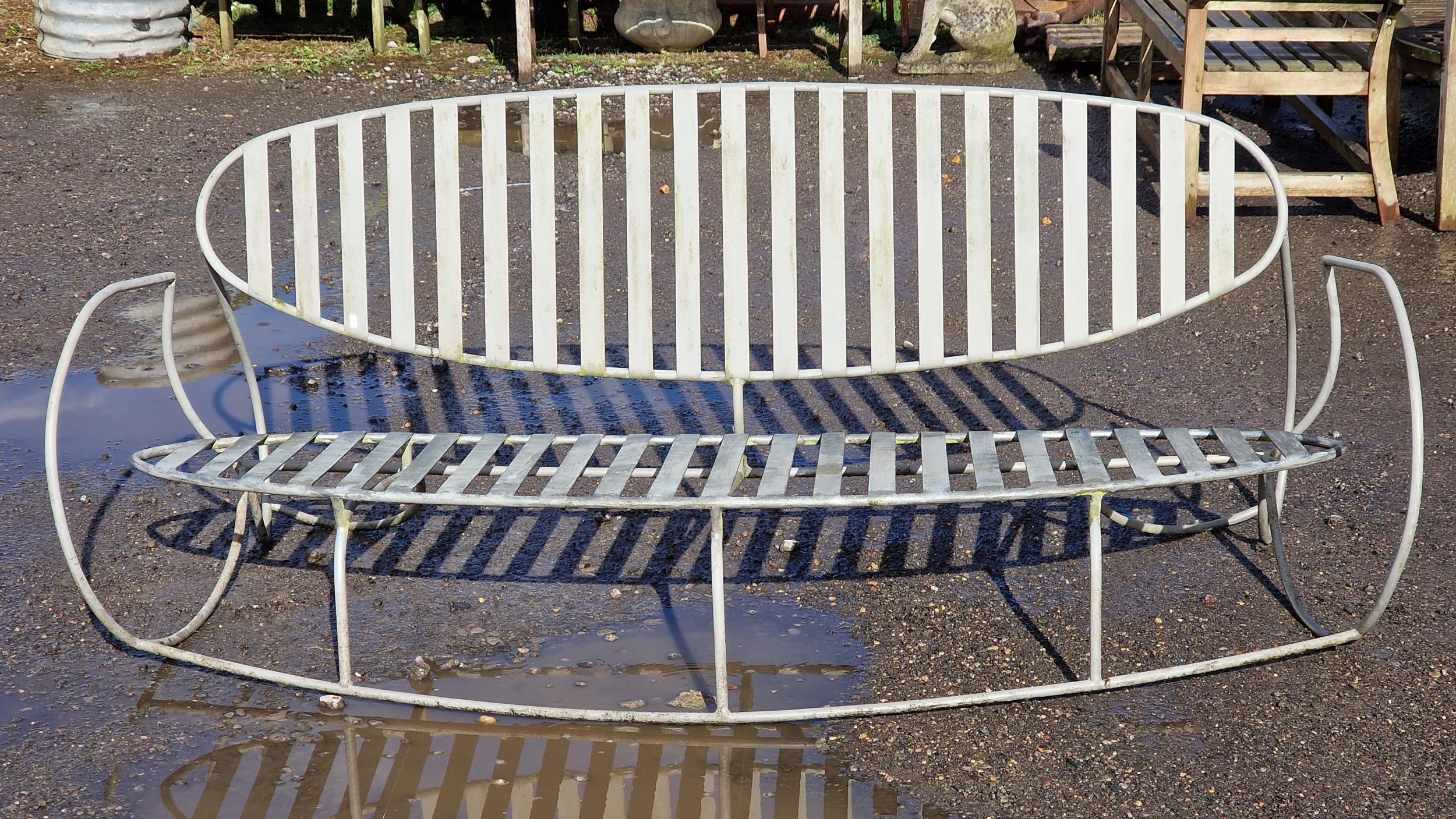 Contemporary scrollwork metal bench with slatted seat and back, H 83cm x W 200cm x D 92cm