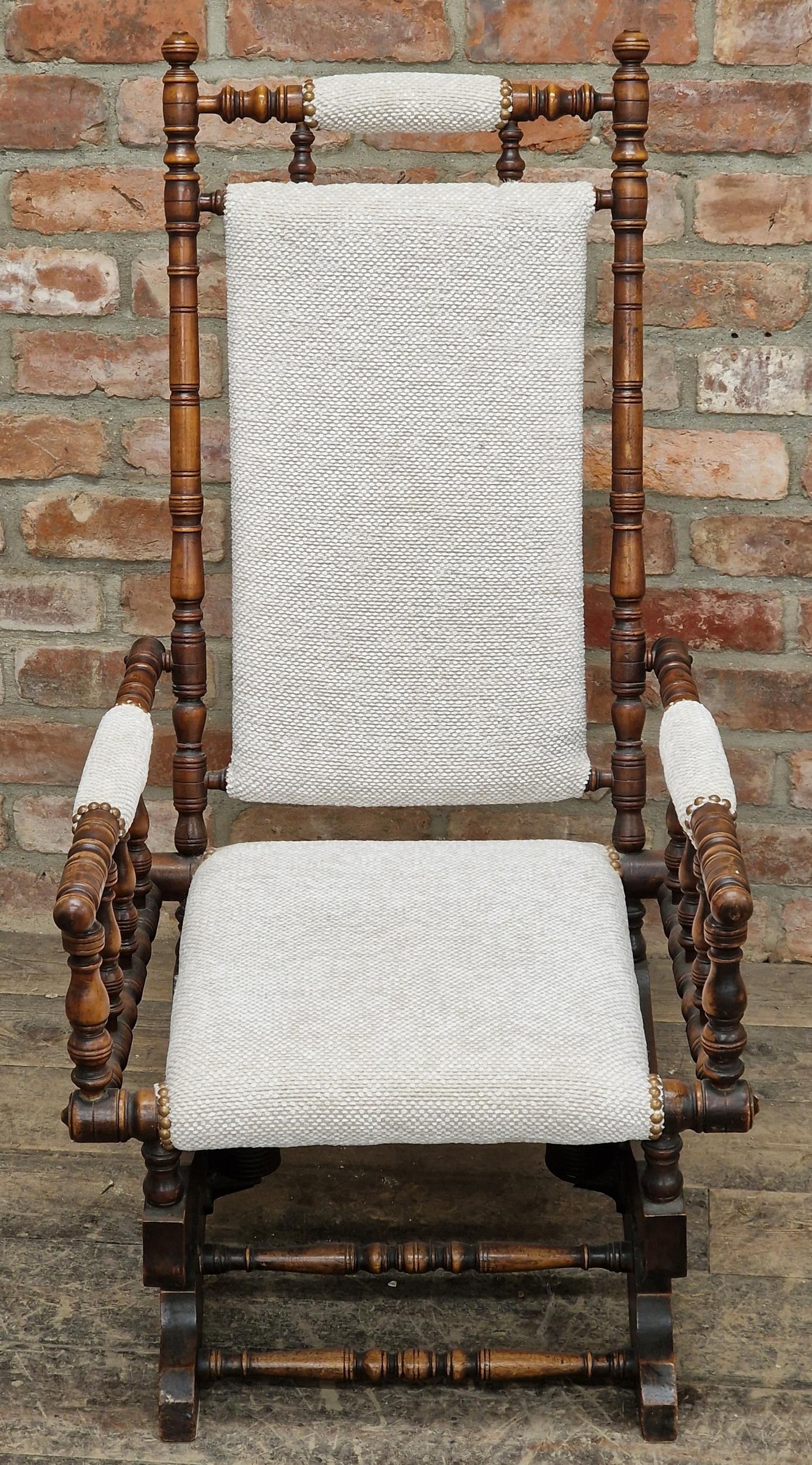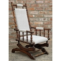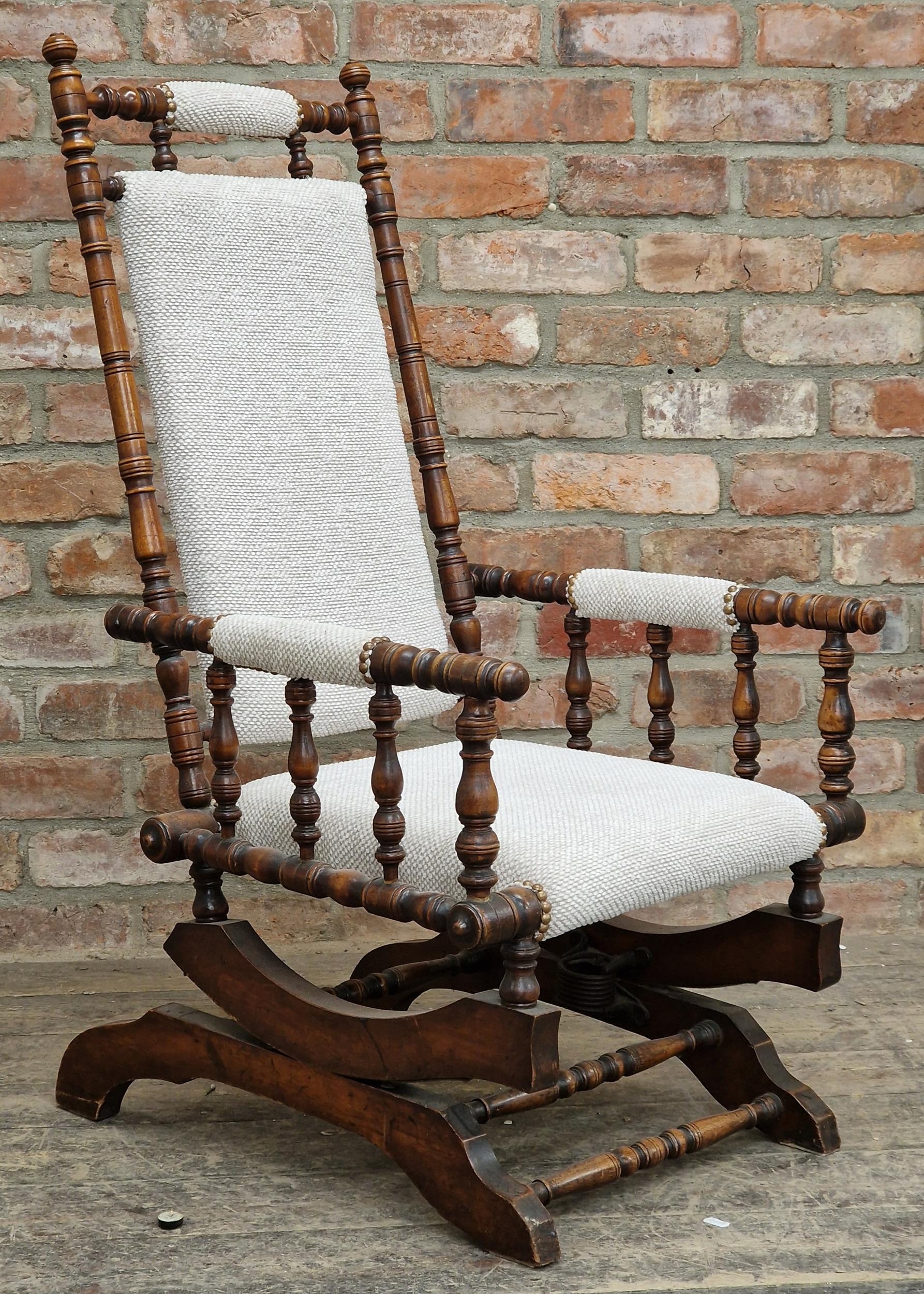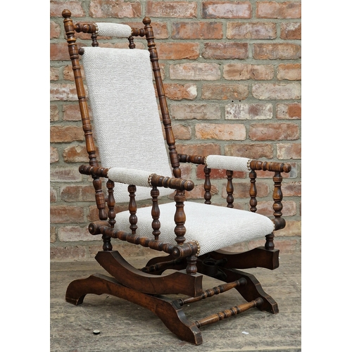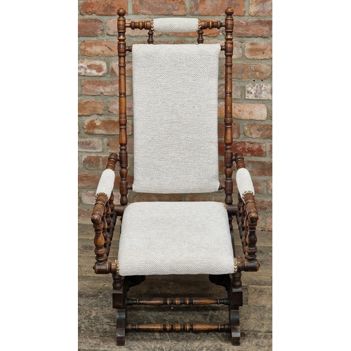 Edwardian American style rocking chair with turned baluster supports and upholstered seat and back, H 108cm x W 55cm x D 67cm