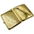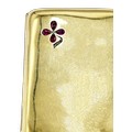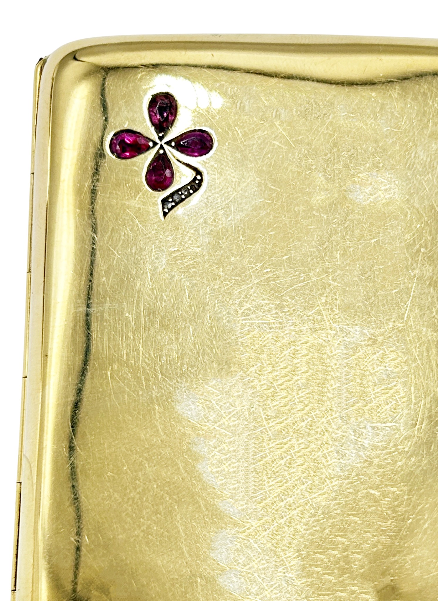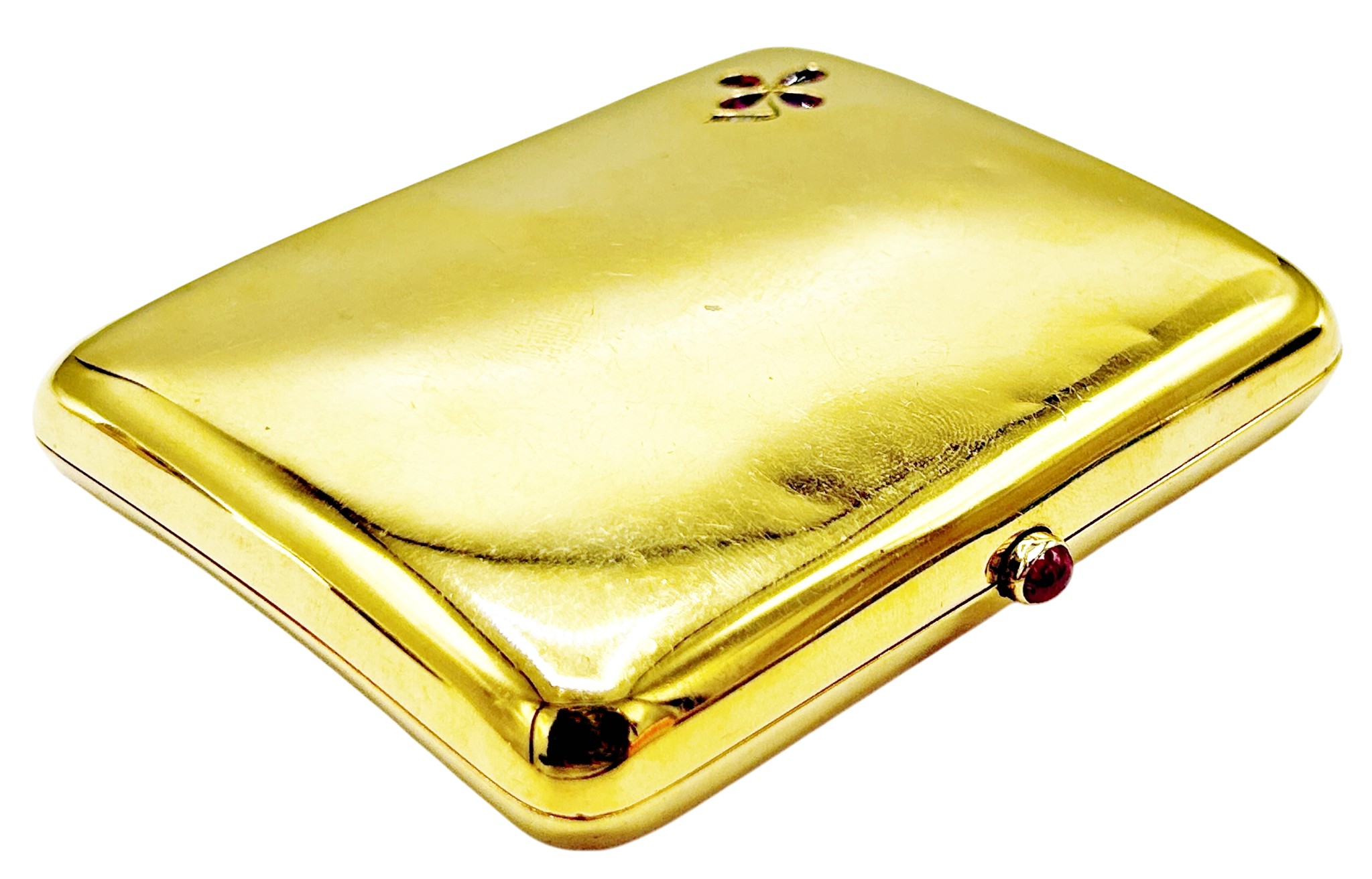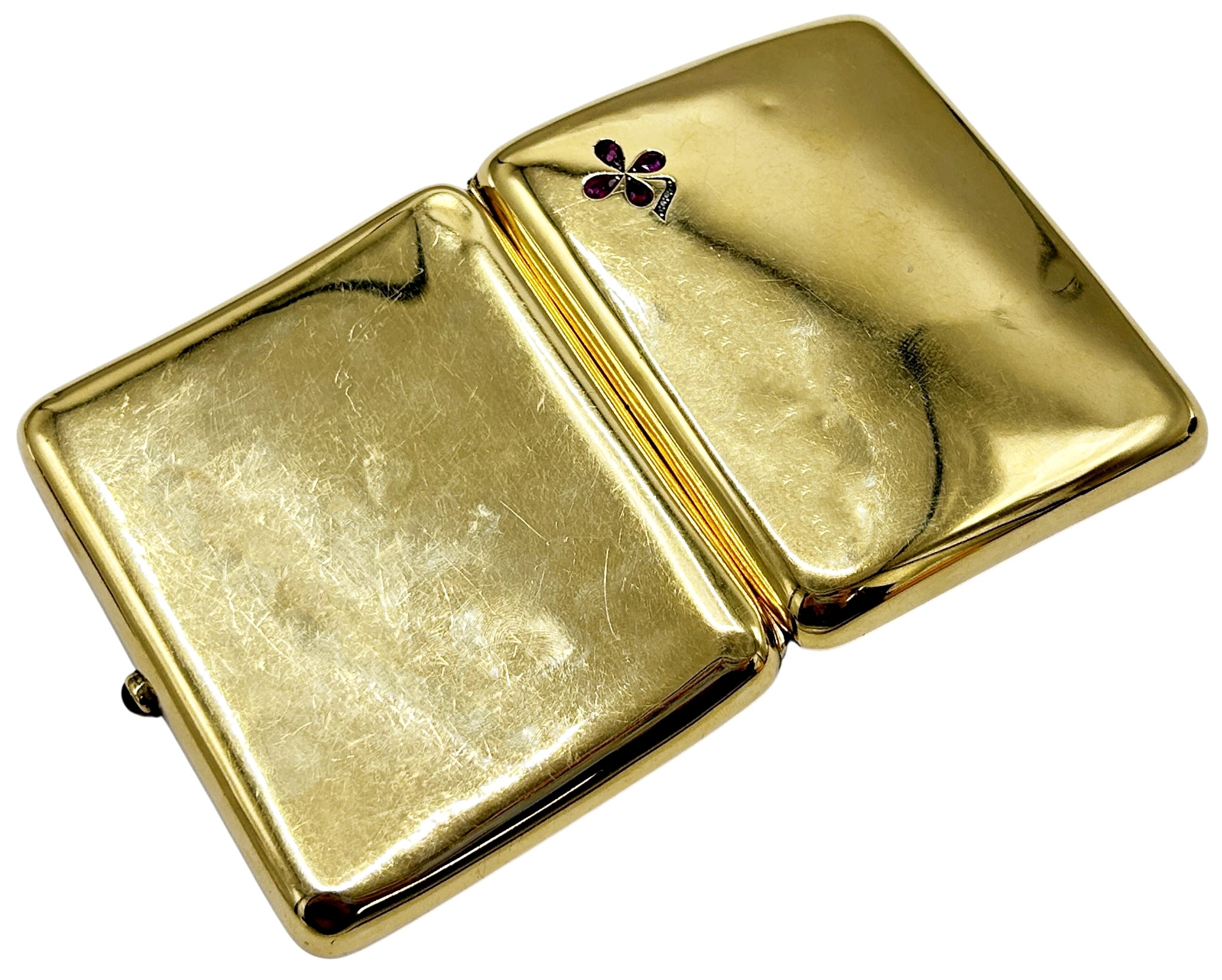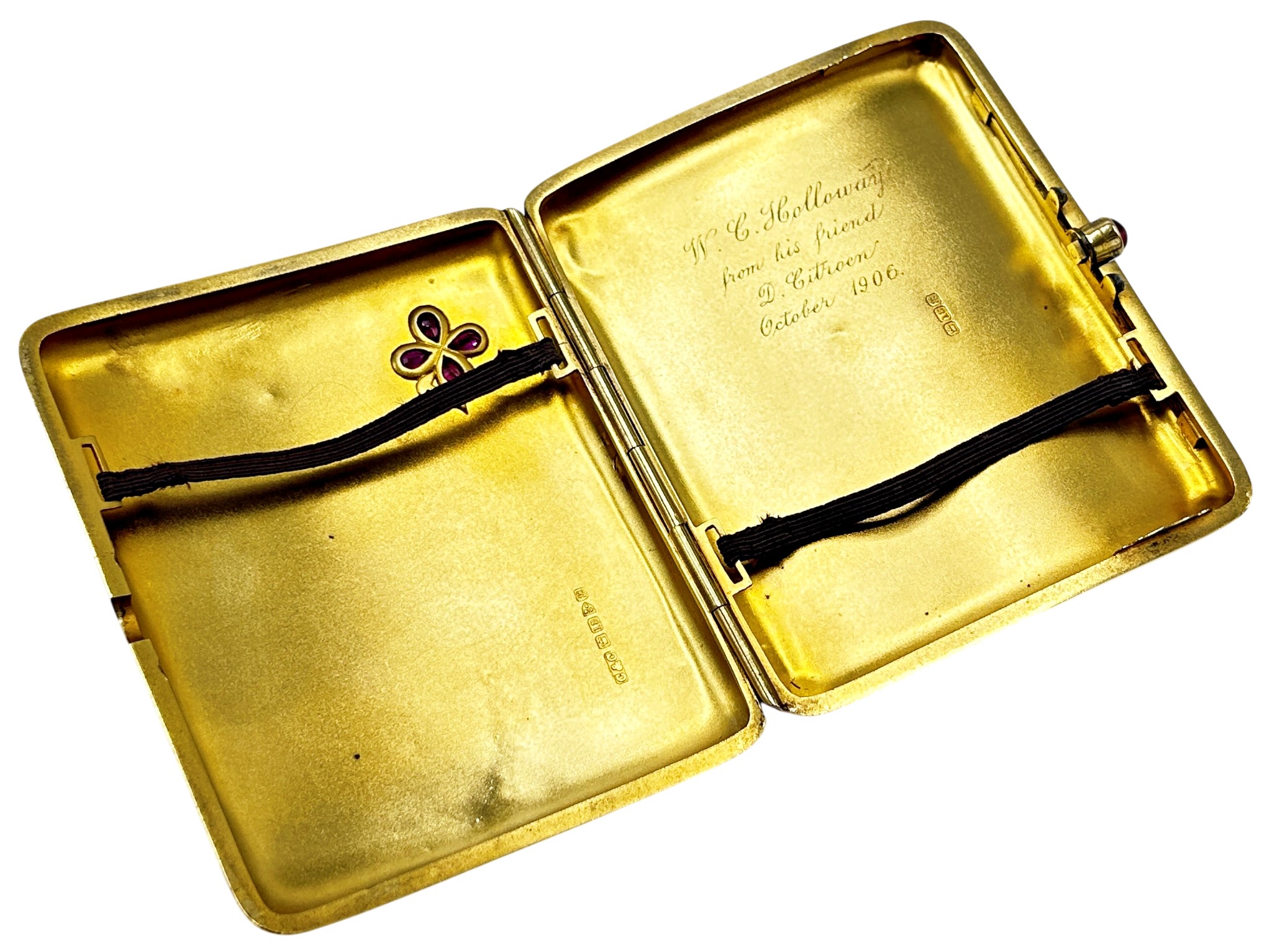 An Edwardian 18ct gold, ruby and diamond concave rectangular cigarette case, with a ruby cabochon thumb-piece, the front corner with a pear-shaped ruby quatrefoil flower and rose diamond stem, the inside engraved 'W.C. Holloway from his friend D Citroen, October 1906', hallmarks for Cohen & Charles, Chester 1902, approx. 1.5cm deep, 9cm wide, 7cm deep overall, approx. 95.7g gross including the steel thumb-piece spring, hinge and internal elastic holders