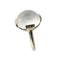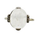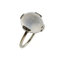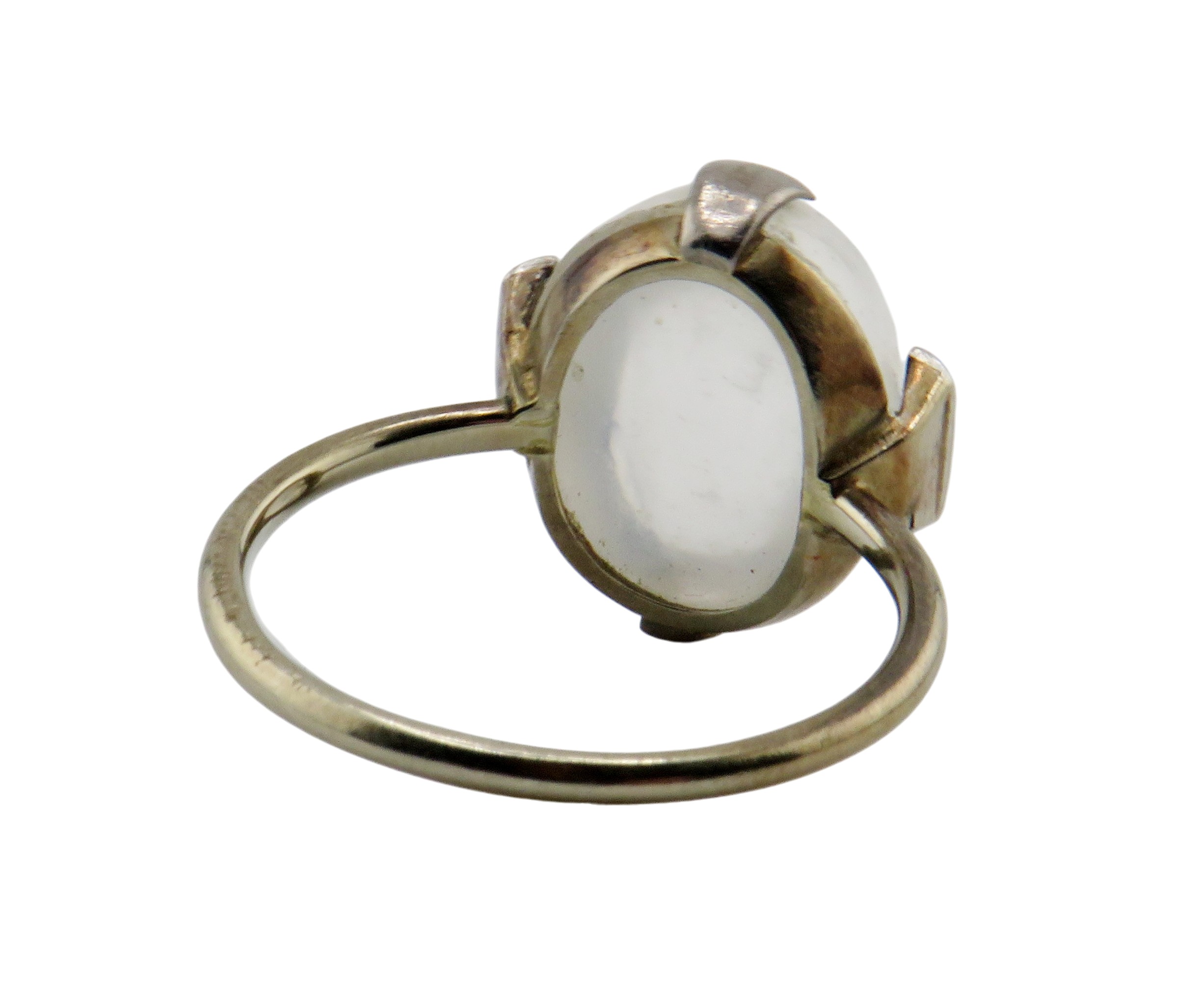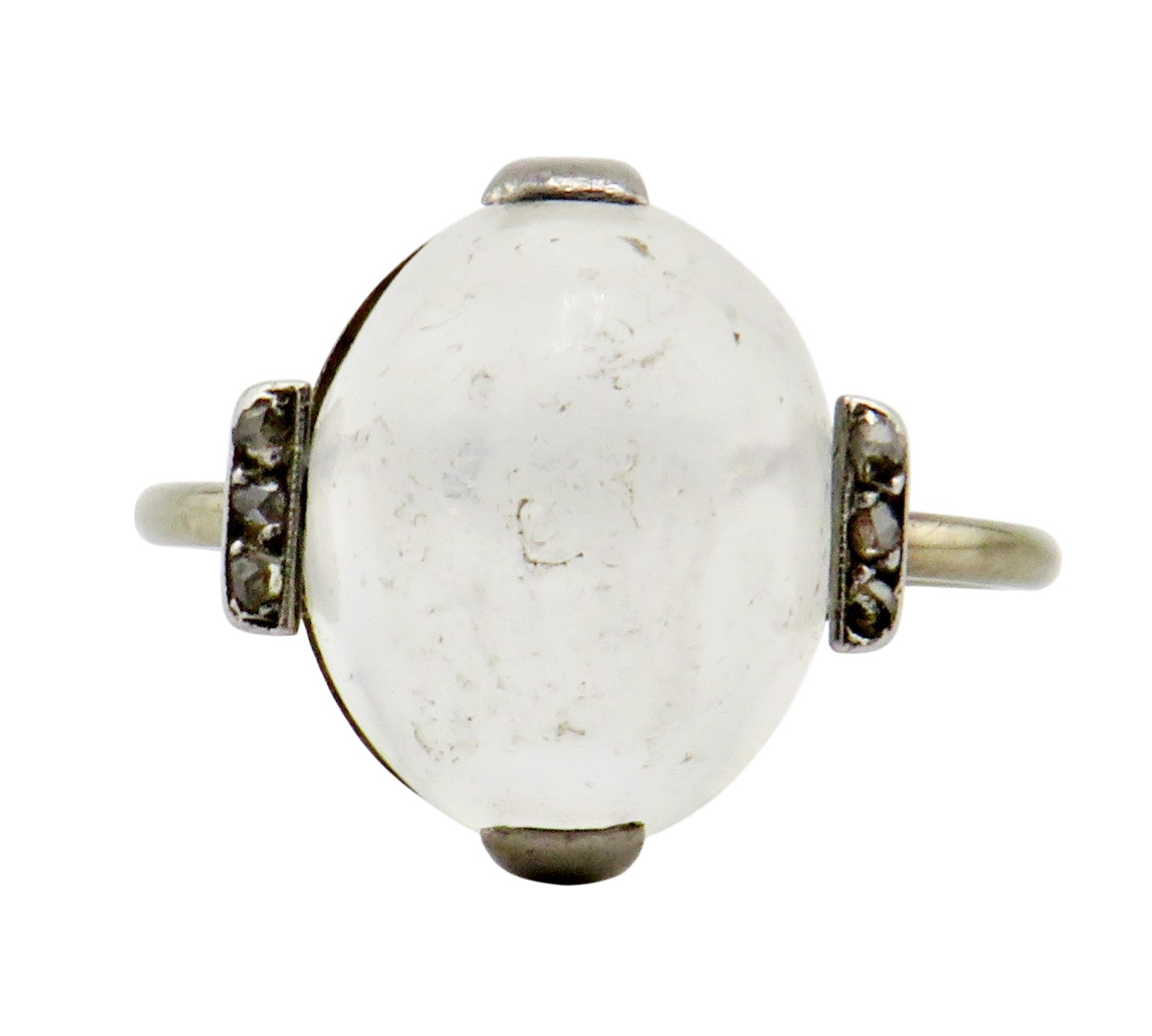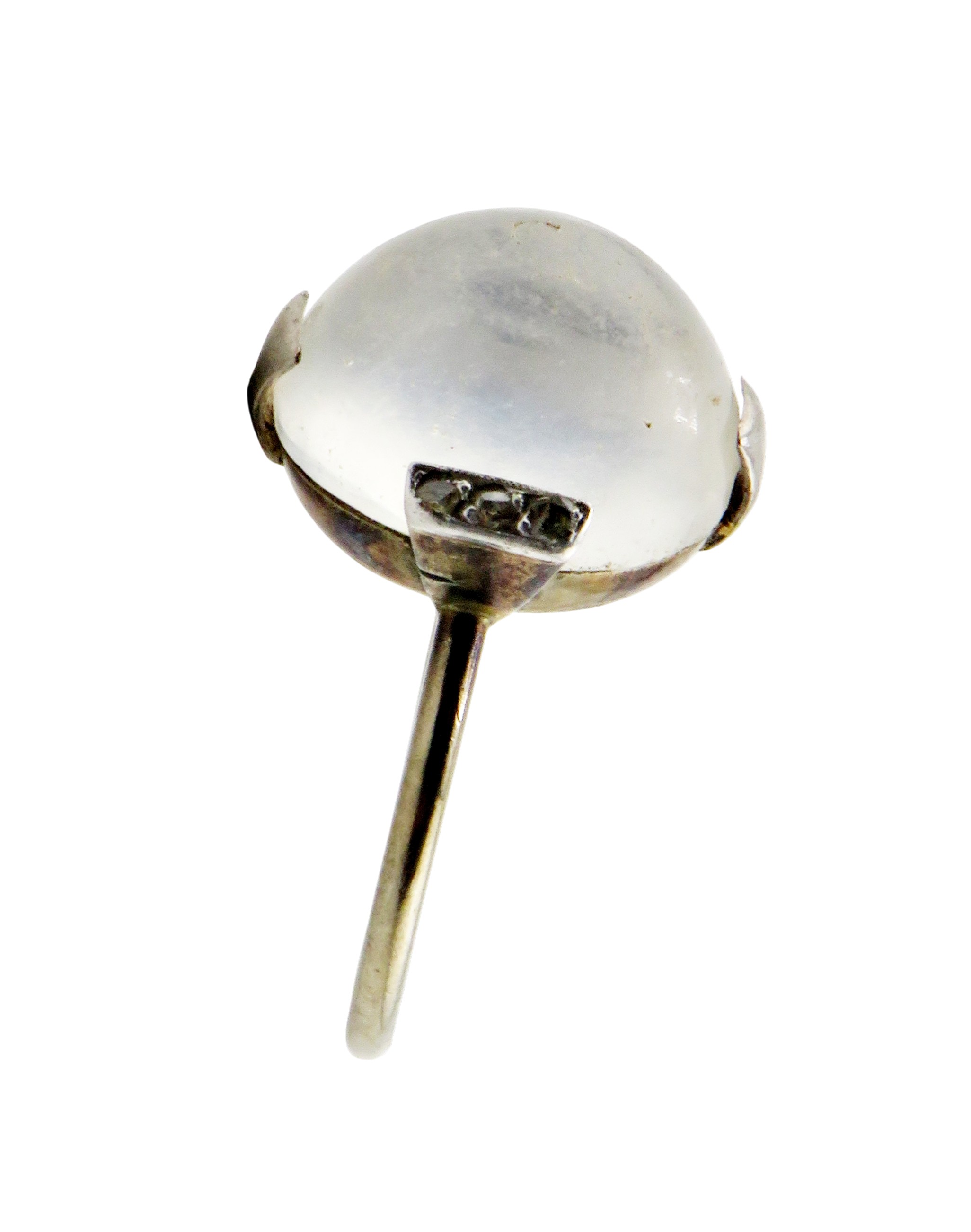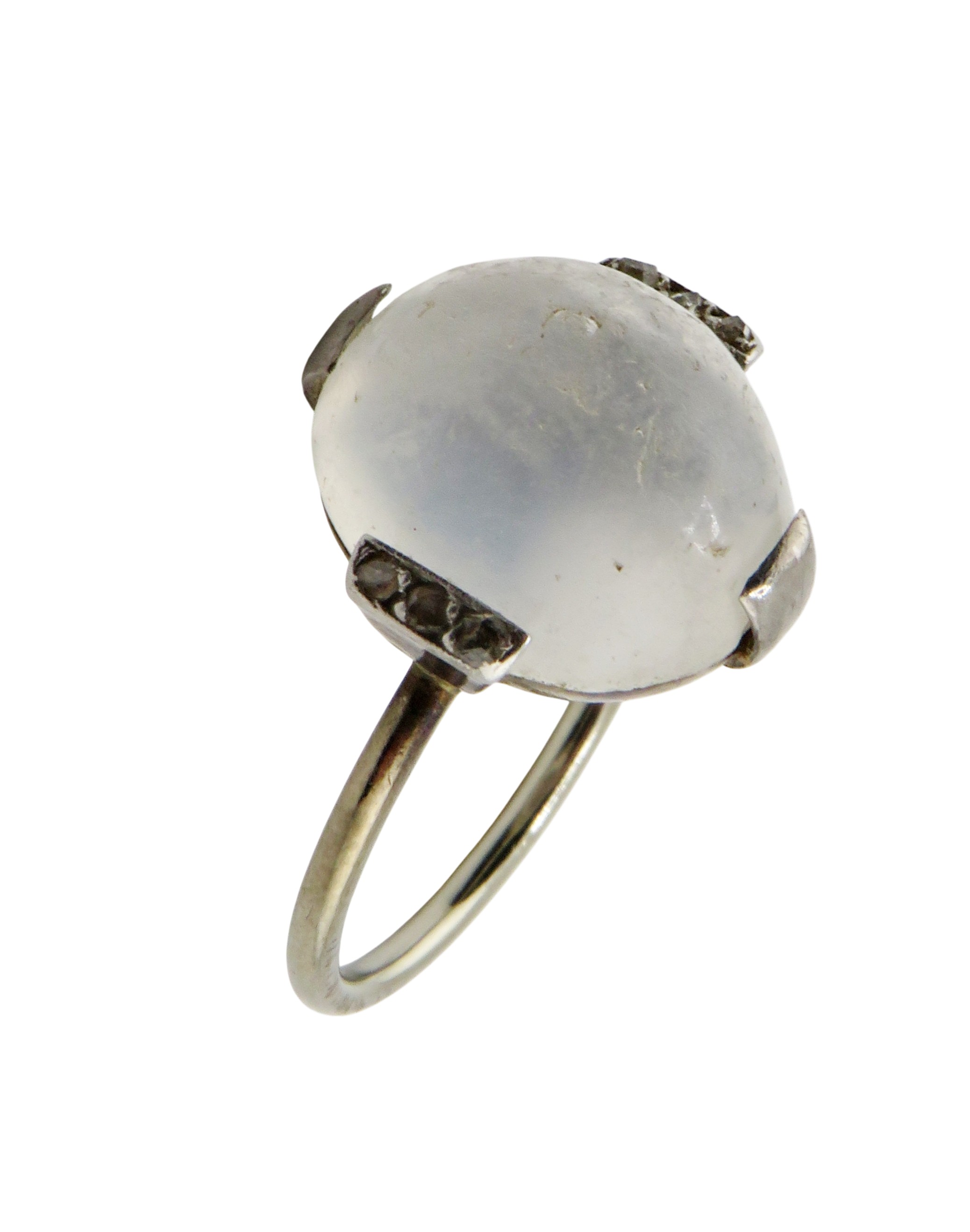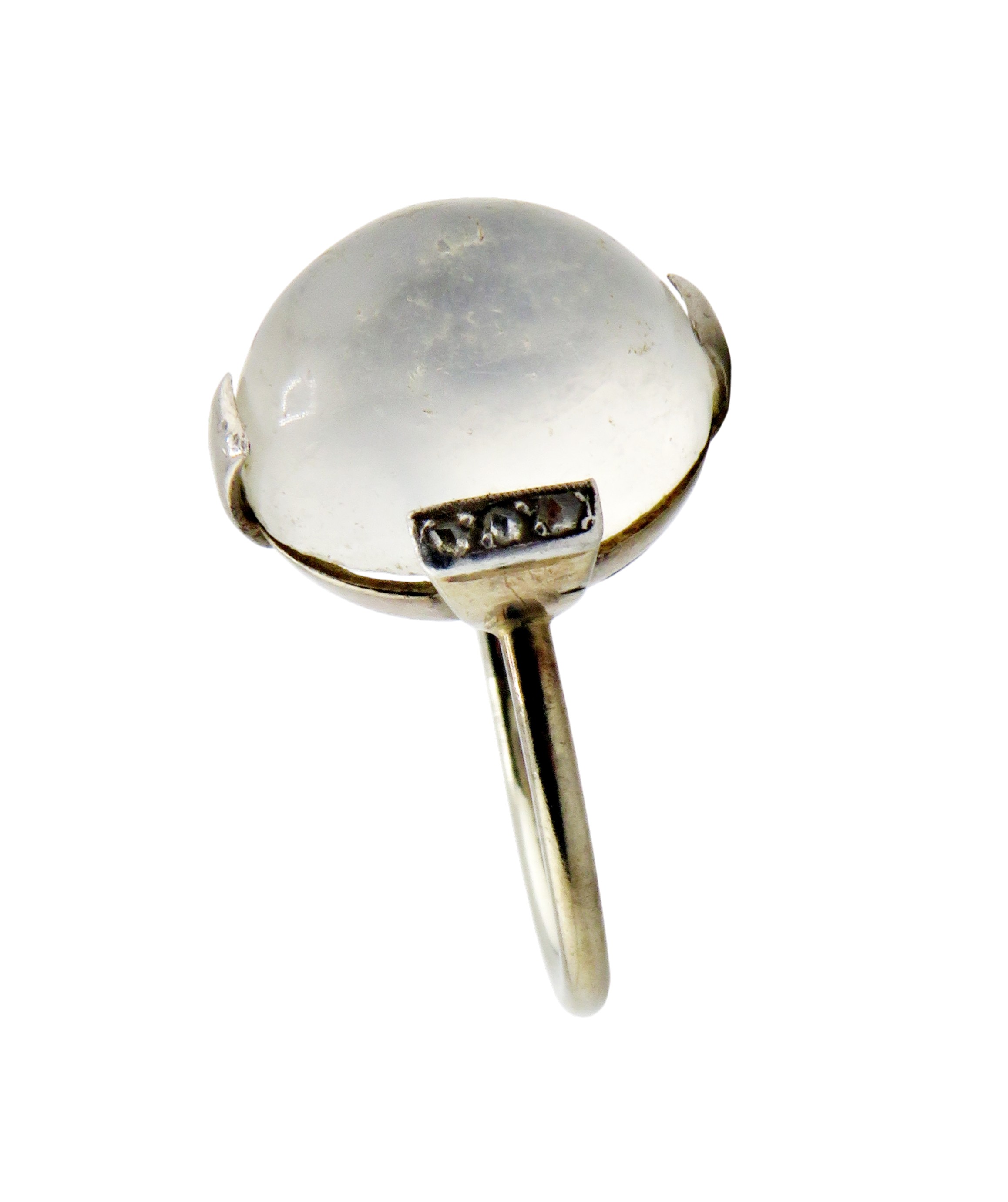 A mid-20th century platinum, moonstone and tiny diamond ring, the oval moonstone measures approx. 13.5mm x 10mm x 7.4mm, in a broad-four-claw mount two of which are each set with three small rose diamonds, on a white round-section shank, unmarked, size L+, 3.8g gross