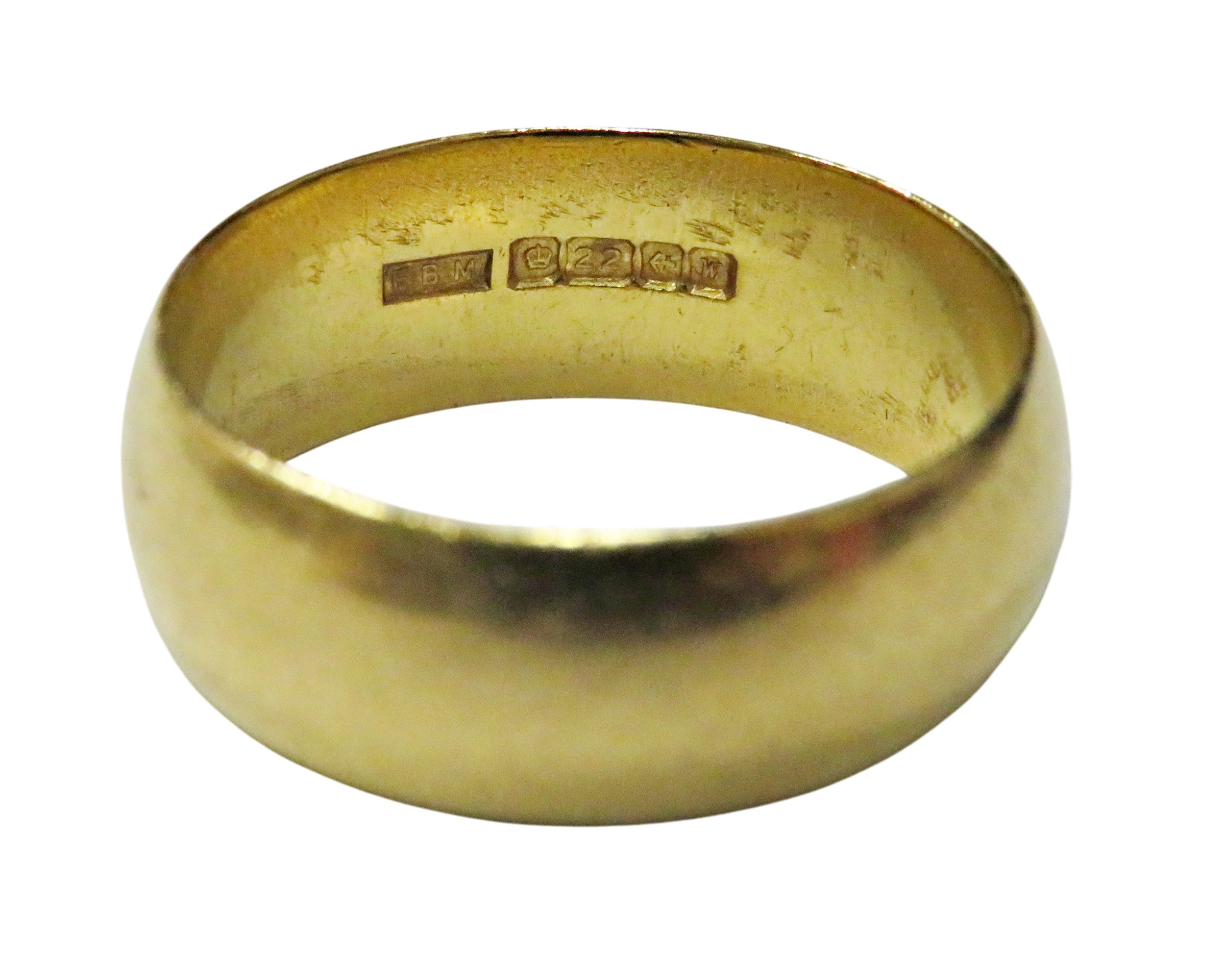 A vintage 22ct gold broad wedding band, hallmarks for Birmingham 1971, 7.7mm wide, size leading-edge U, 9.7g