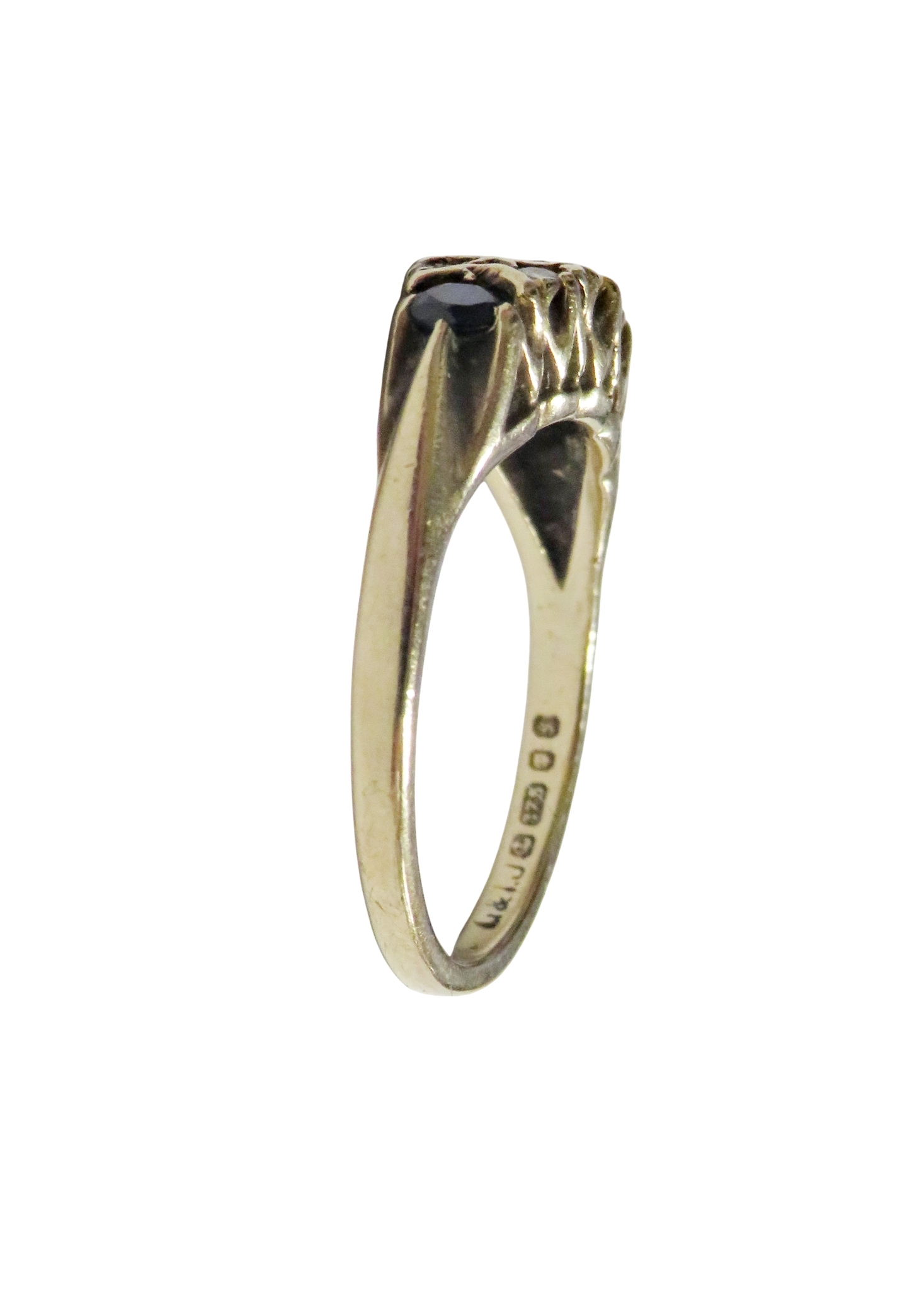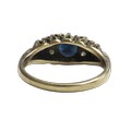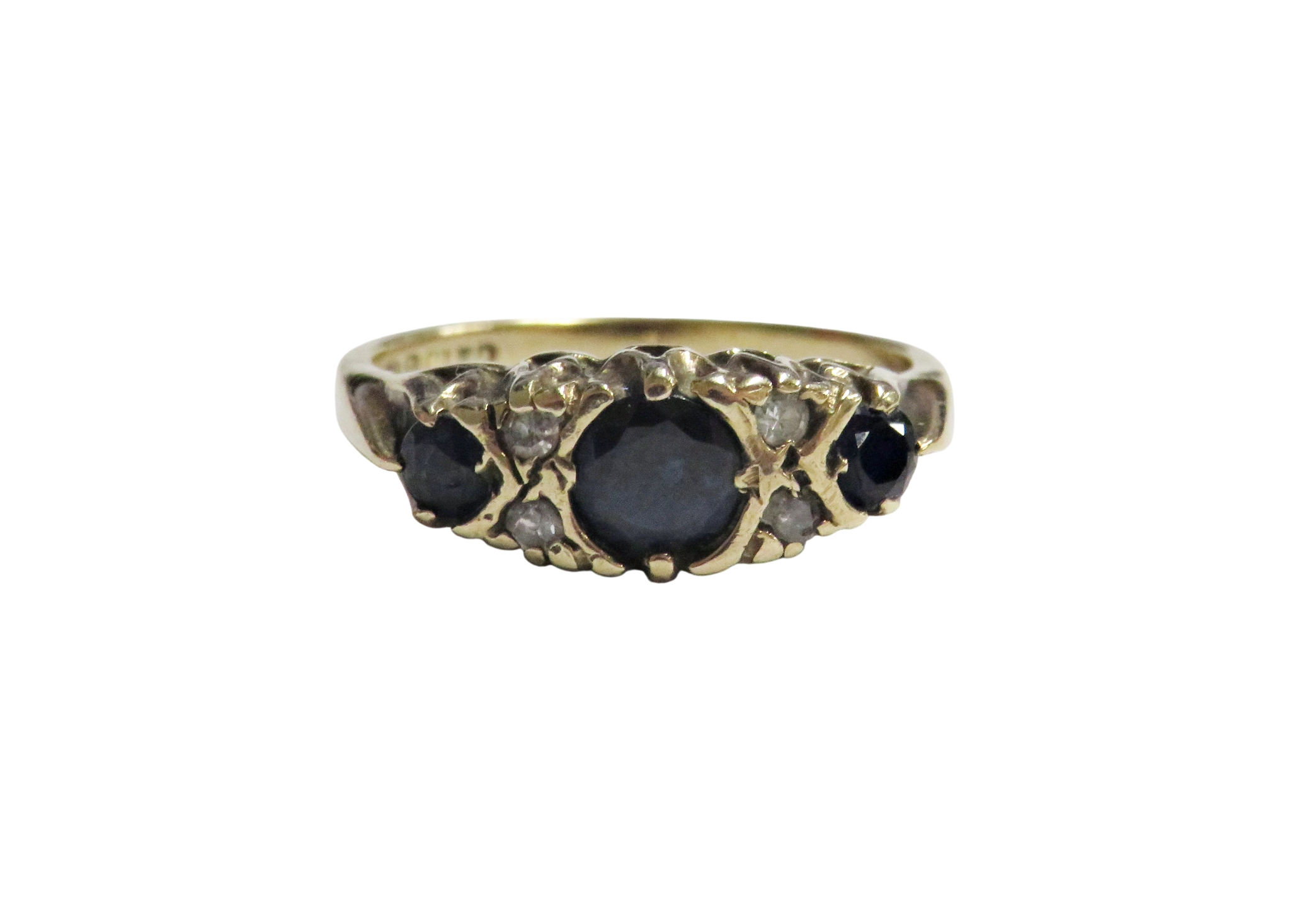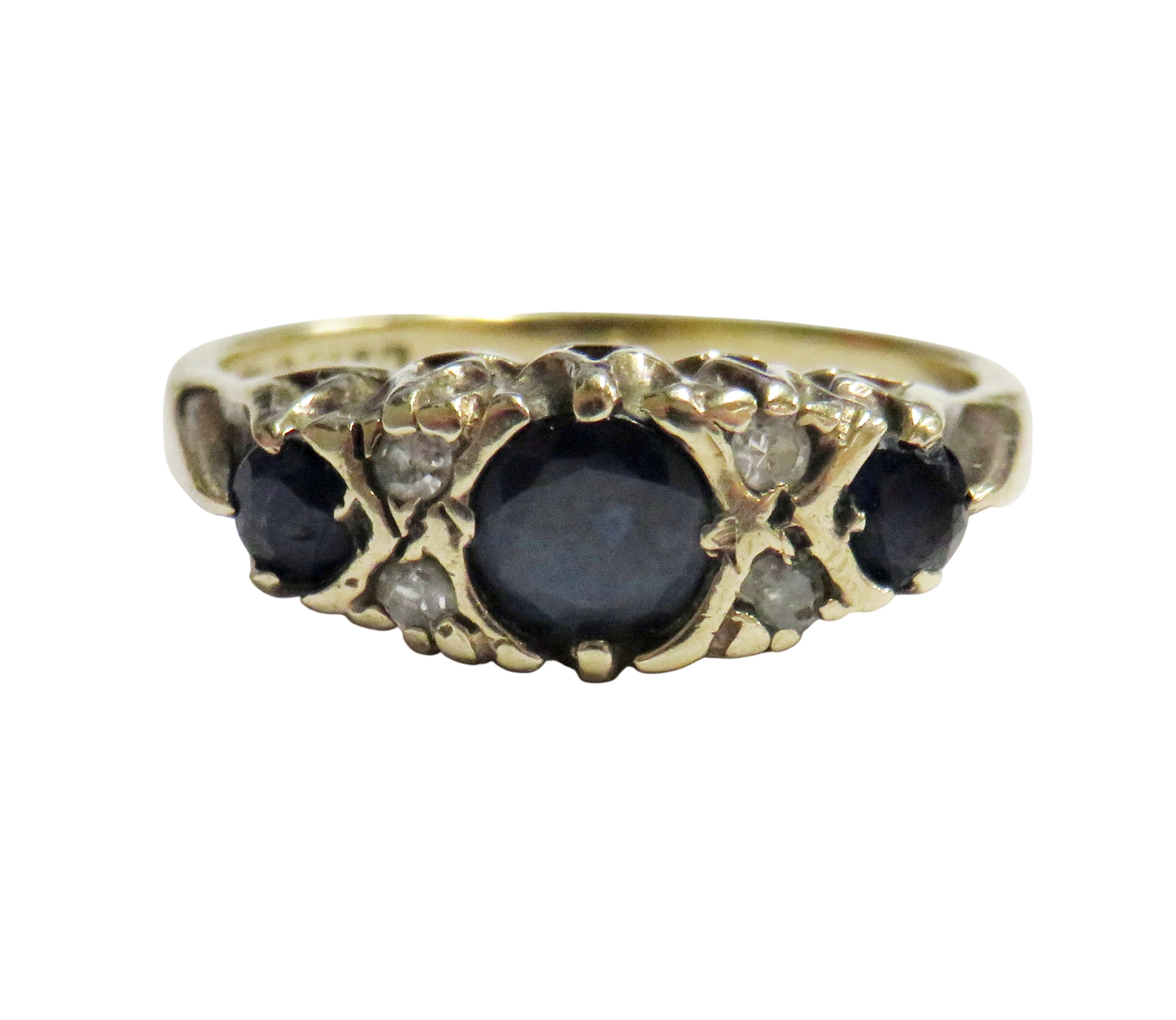 A vintage 9ct gold, sapphire and diamond dress ring, the three graduated oval and round dark-blue/black sapphire spaced by pairs of small eight-cut diamonds, on a D-section shank with hallmarks for London 1981, size M, 3.1g gross