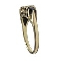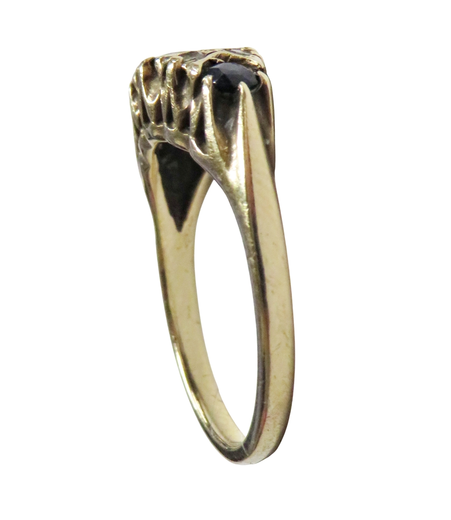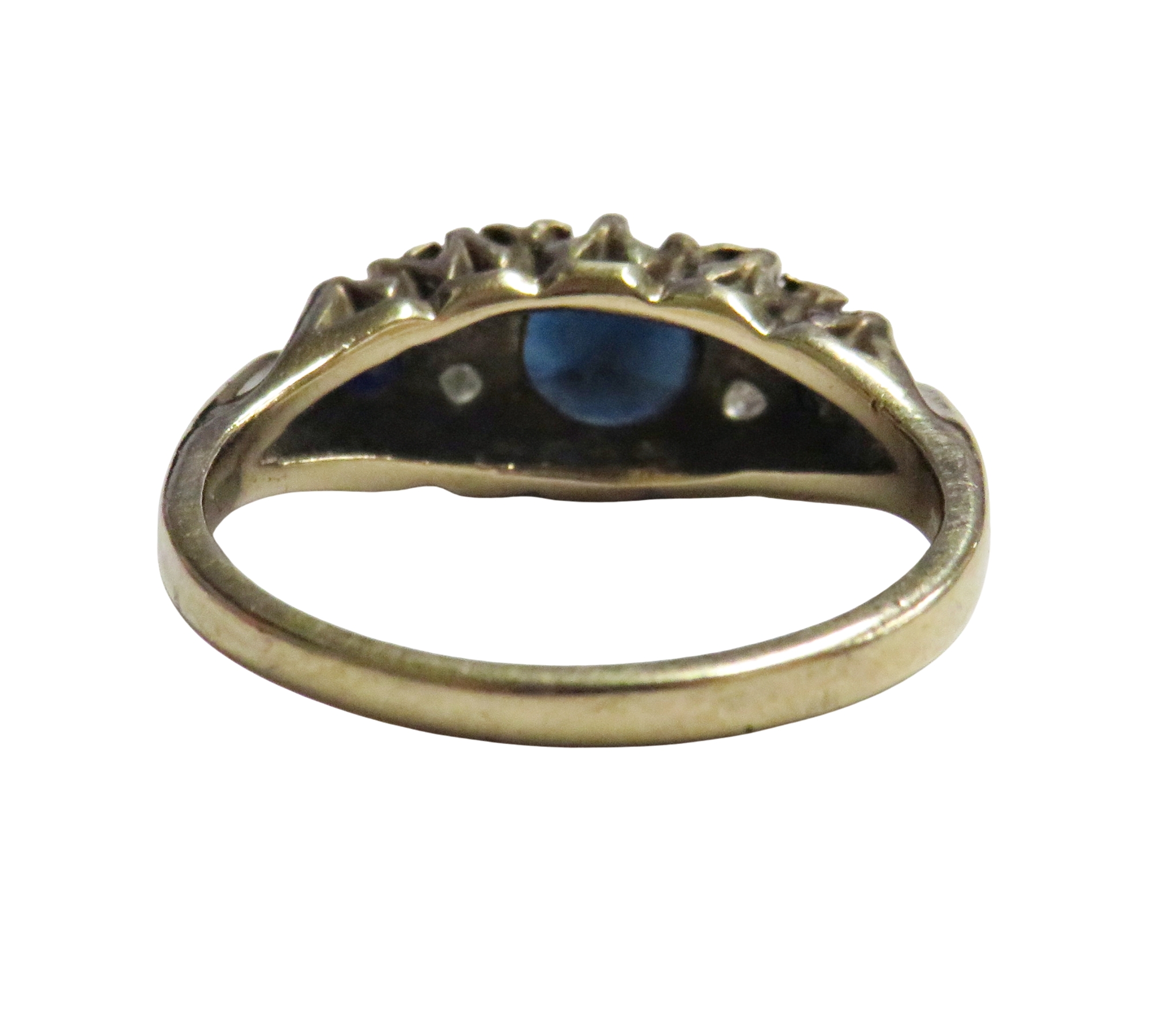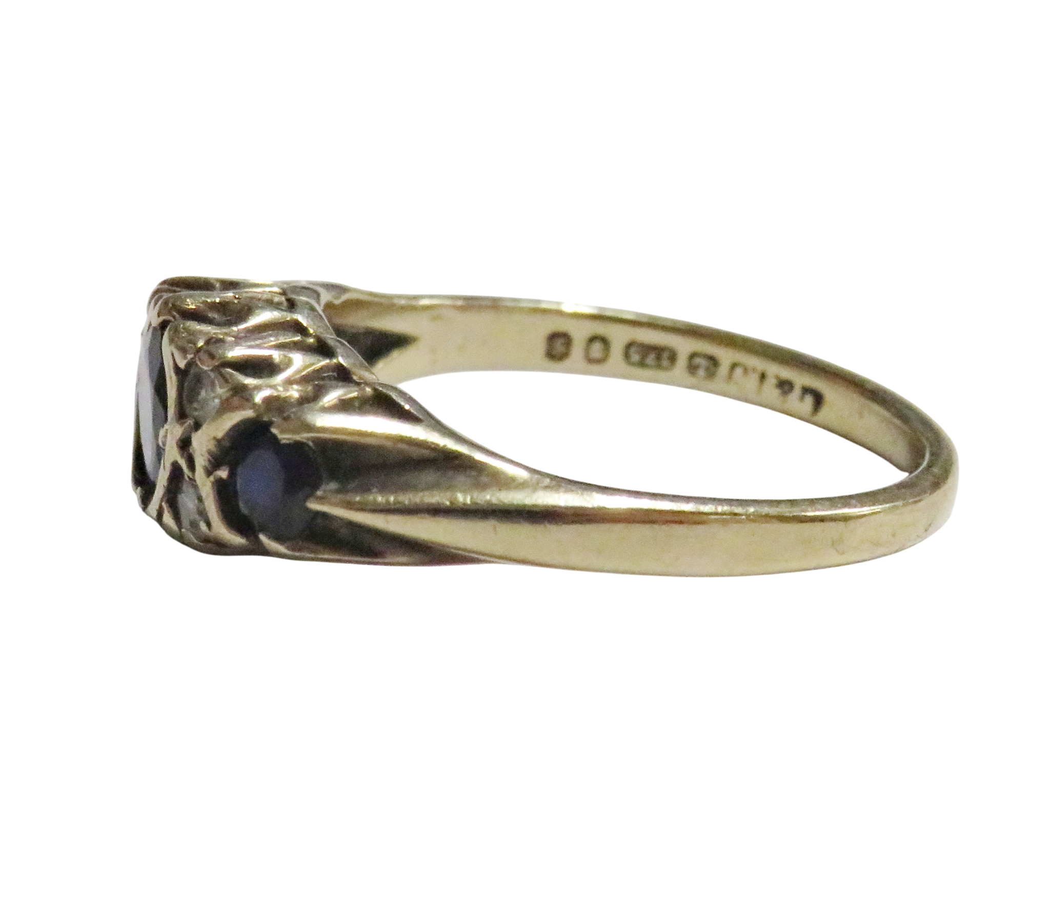 A vintage 9ct gold, sapphire and diamond dress ring, the three graduated oval and round dark-blue/black sapphire spaced by pairs of small eight-cut diamonds, on a D-section shank with hallmarks for London 1981, size M, 3.1g gross