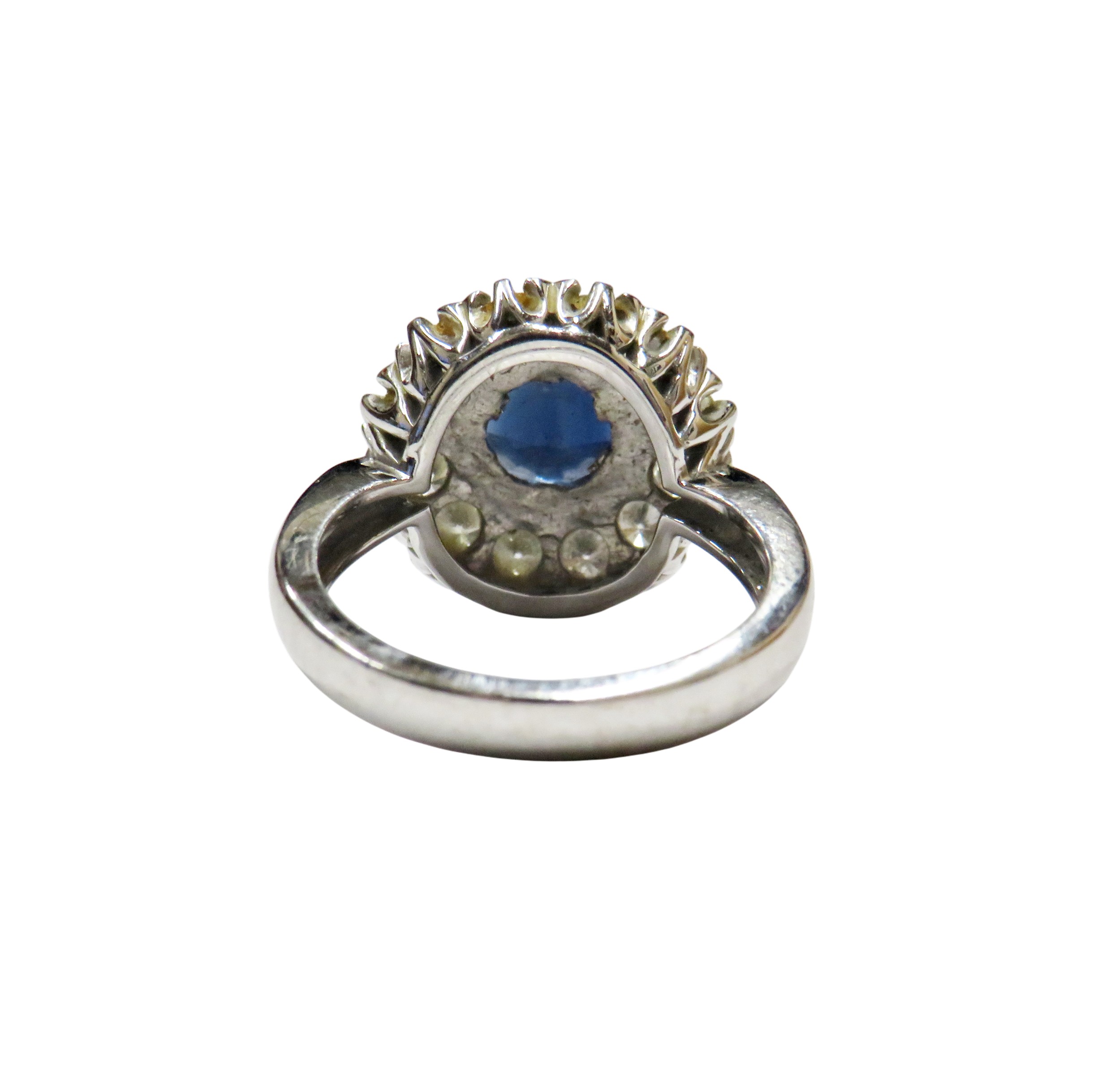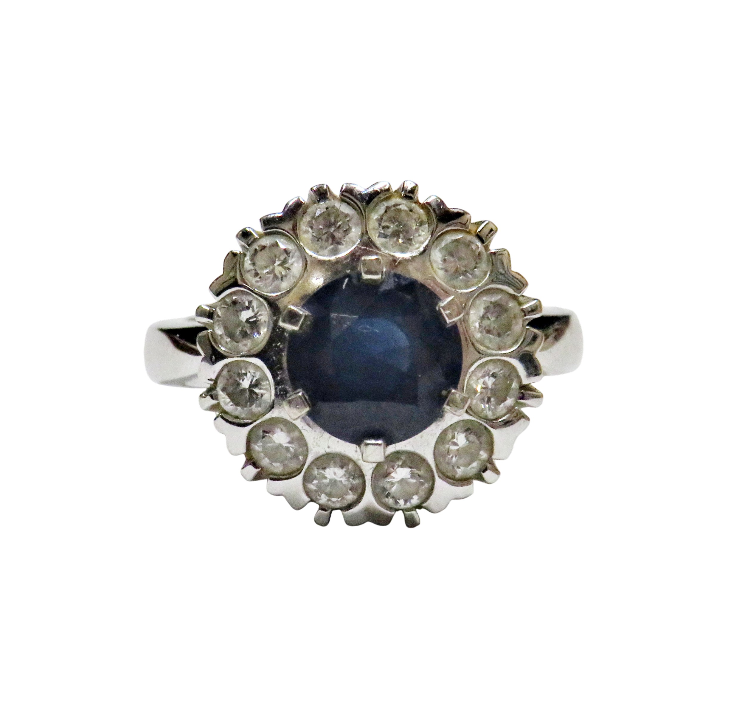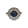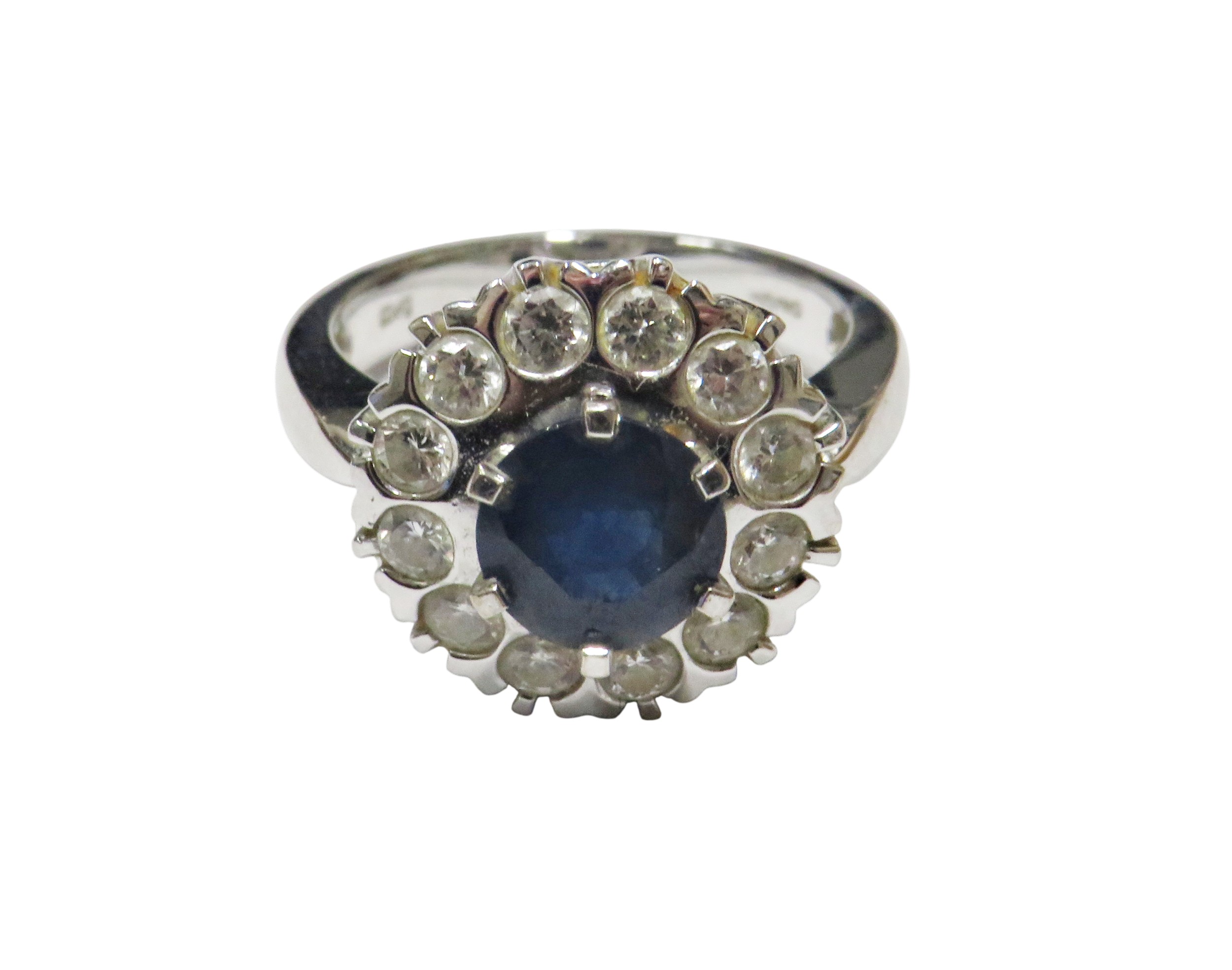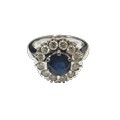 An 18ct white gold, sapphire and diamond cluster ring, centred with a round mixed-cut sapphire approx. 1.85cts, claw set within a round brilliant diamond 12 stone border, approx. 0.84cts total, on a D-section shank with post 2000 London convention hallmarks, size L+, approx. 6.7g gross