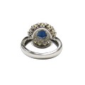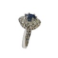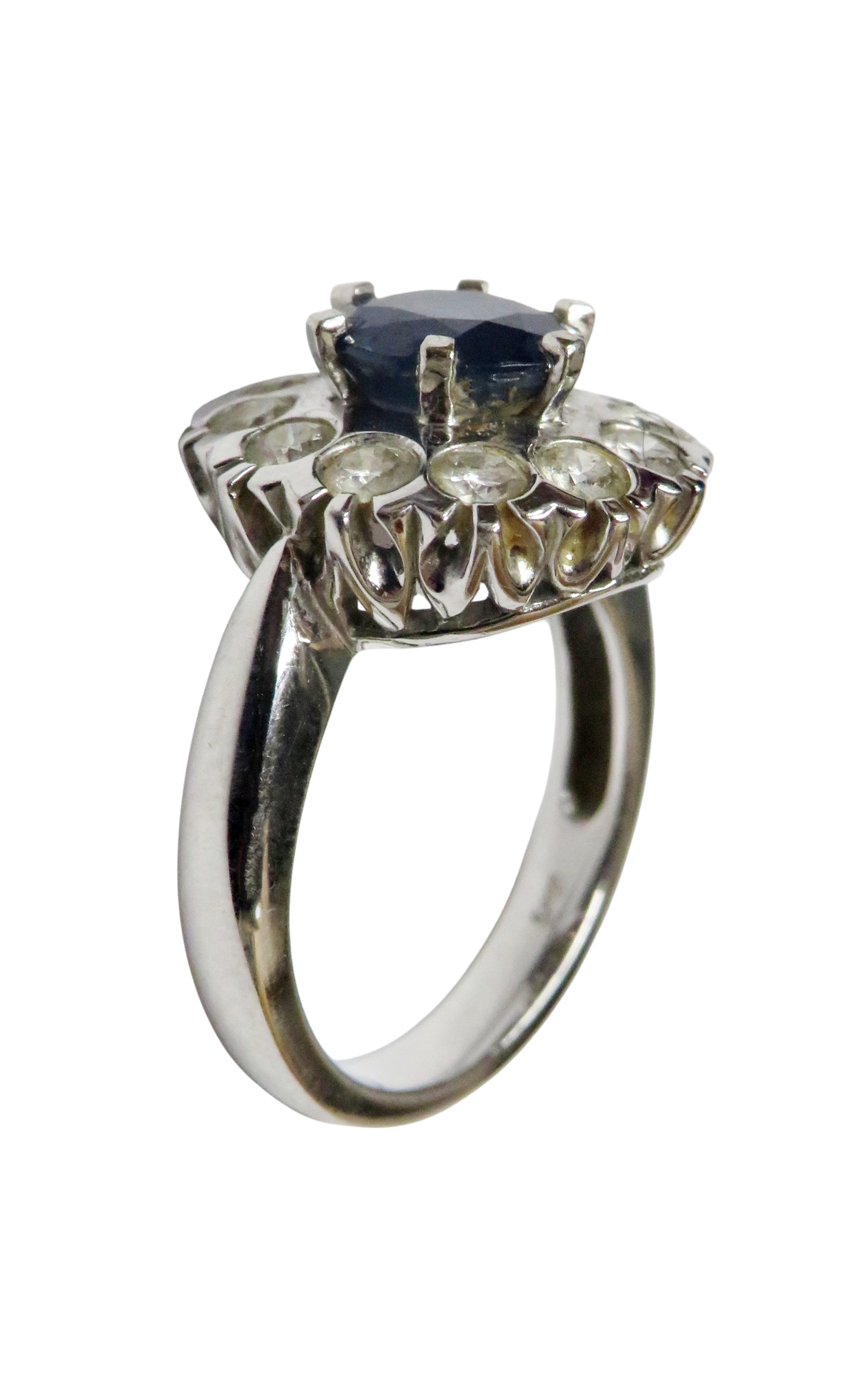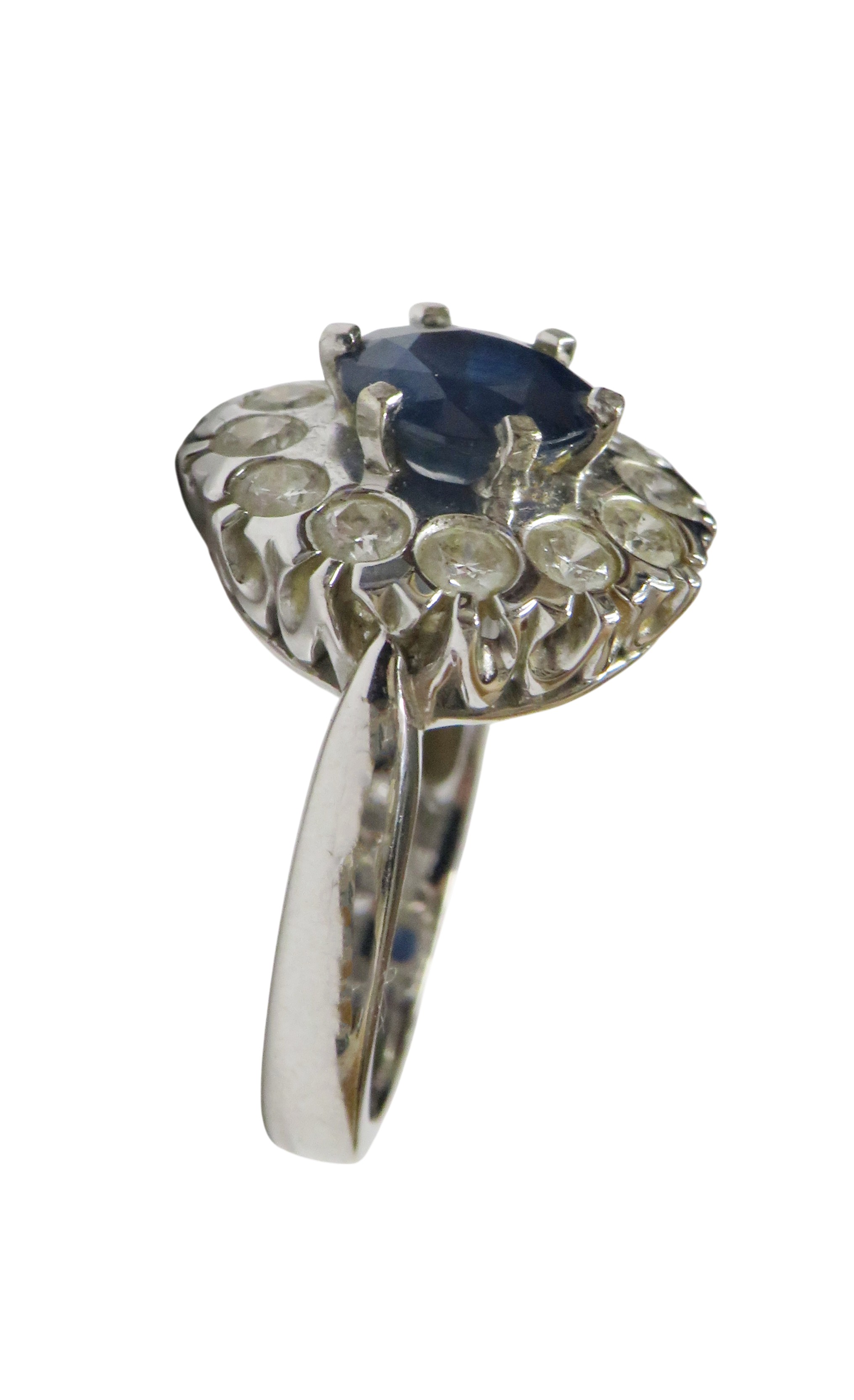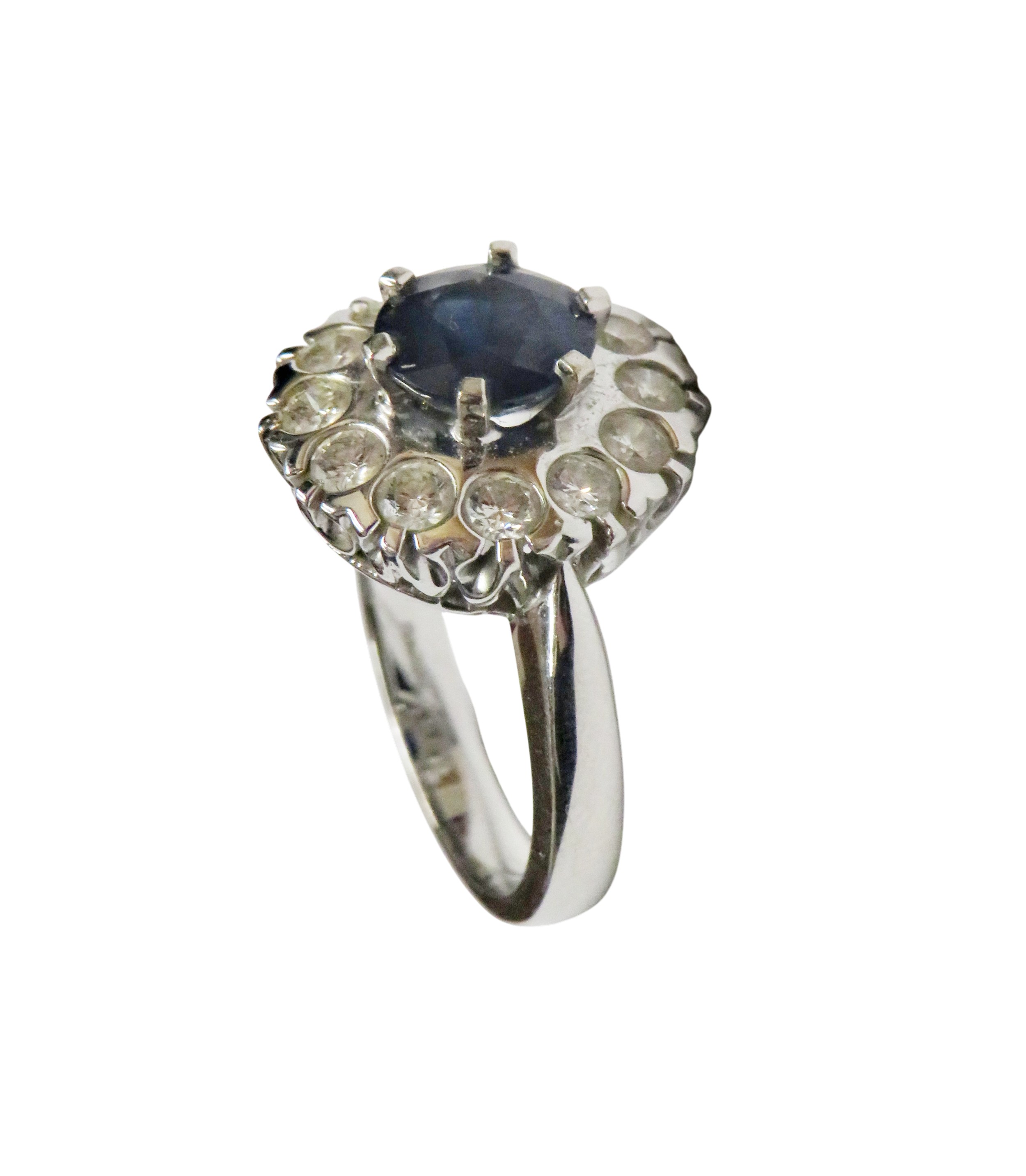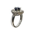 An 18ct white gold, sapphire and diamond cluster ring, centred with a round mixed-cut sapphire approx. 1.85cts, claw set within a round brilliant diamond 12 stone border, approx. 0.84cts total, on a D-section shank with post 2000 London convention hallmarks, size L+, approx. 6.7g gross