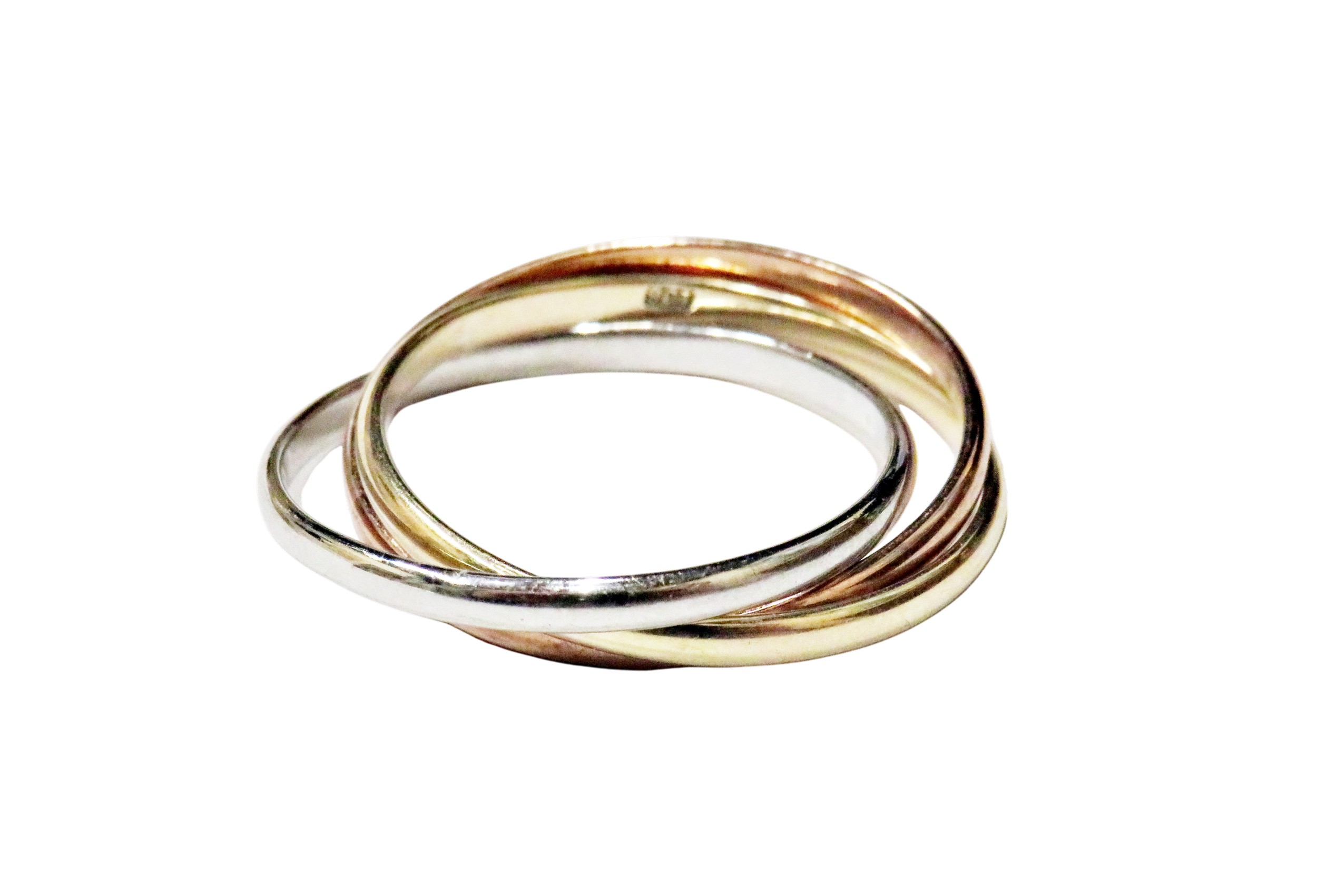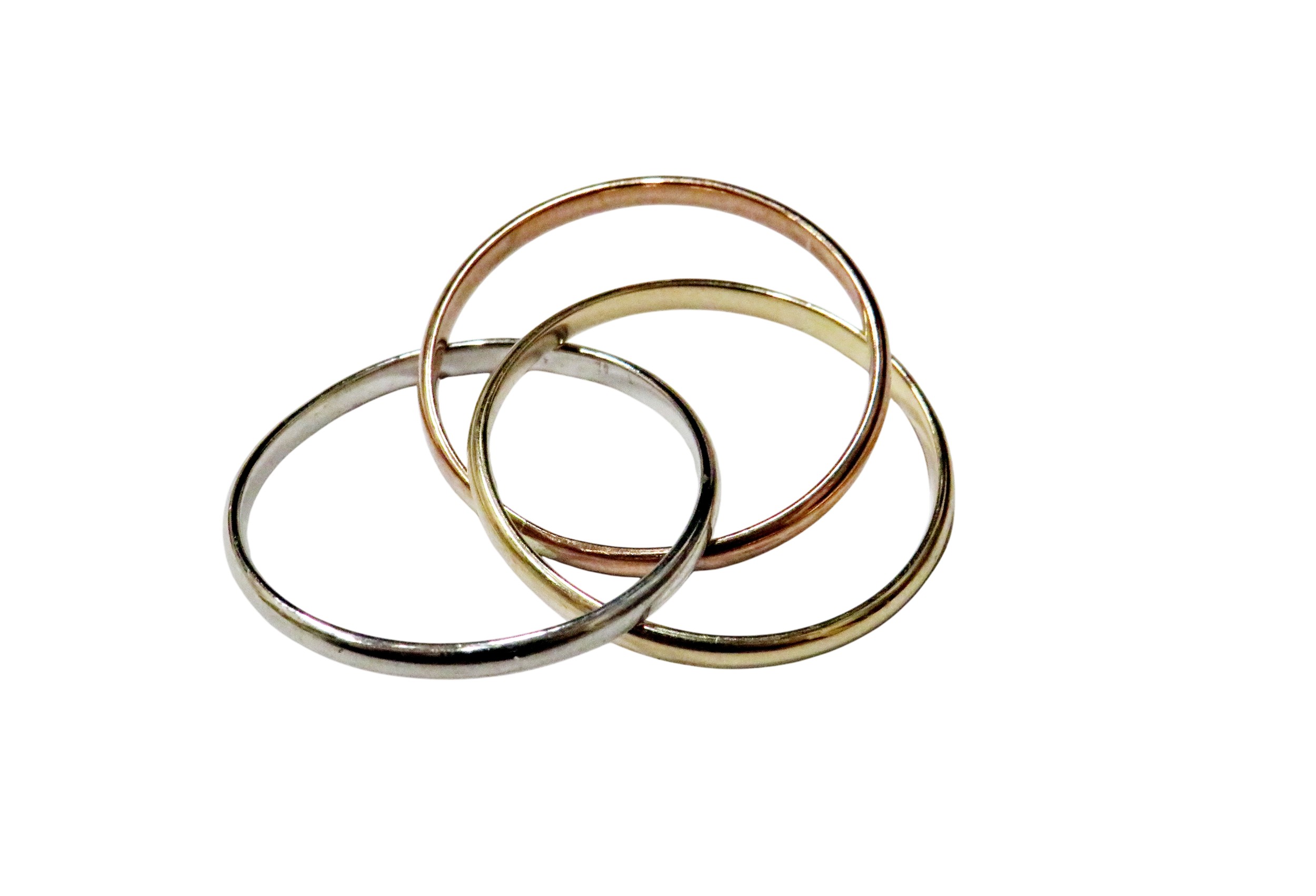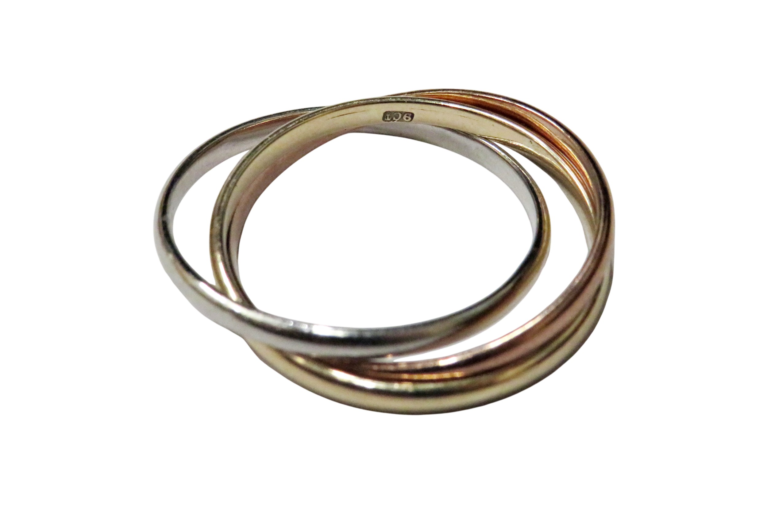 A vintage tri-colour gold trilogy or 'Russian' wedding band, stamped '9ct', each band 2.3mm wide, size about Z, 5.2g