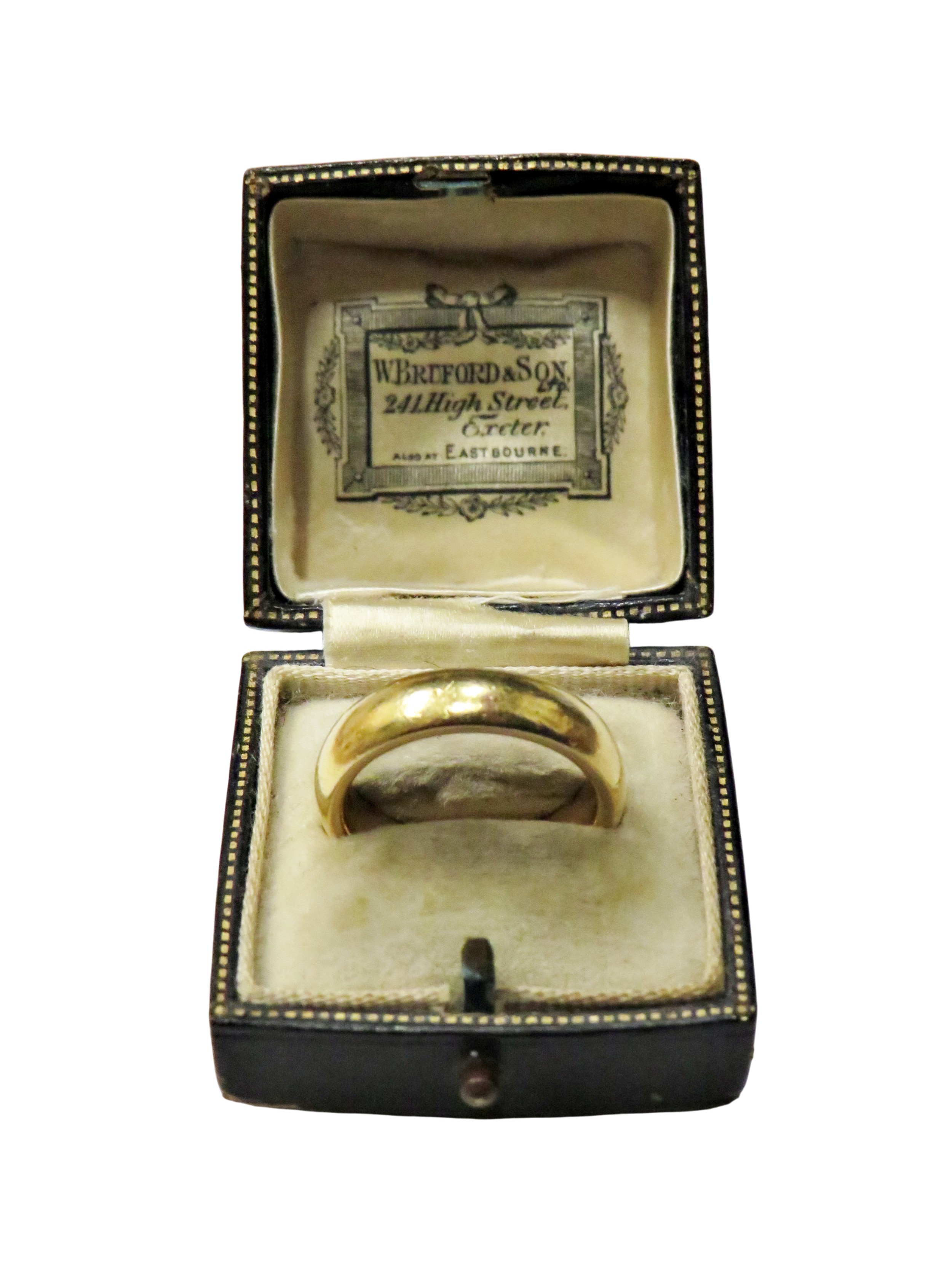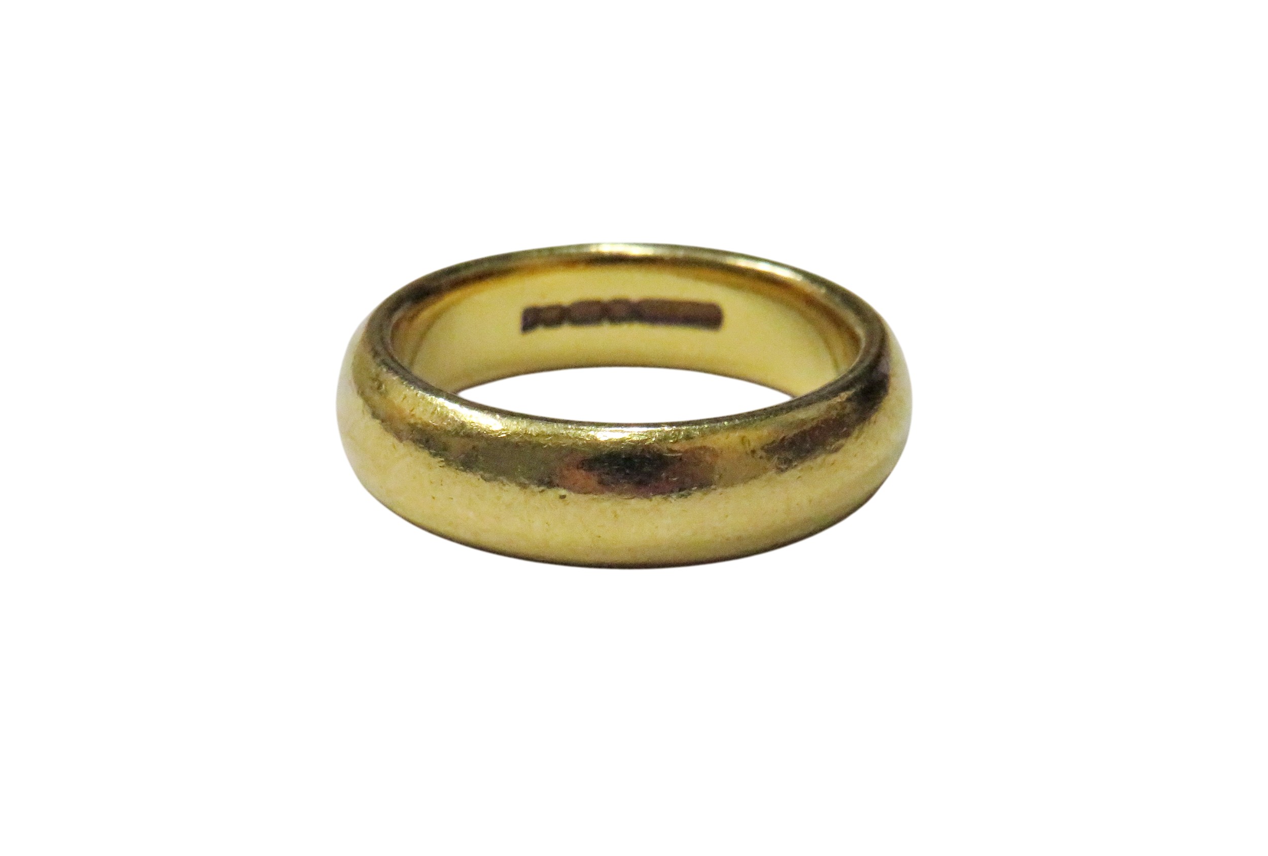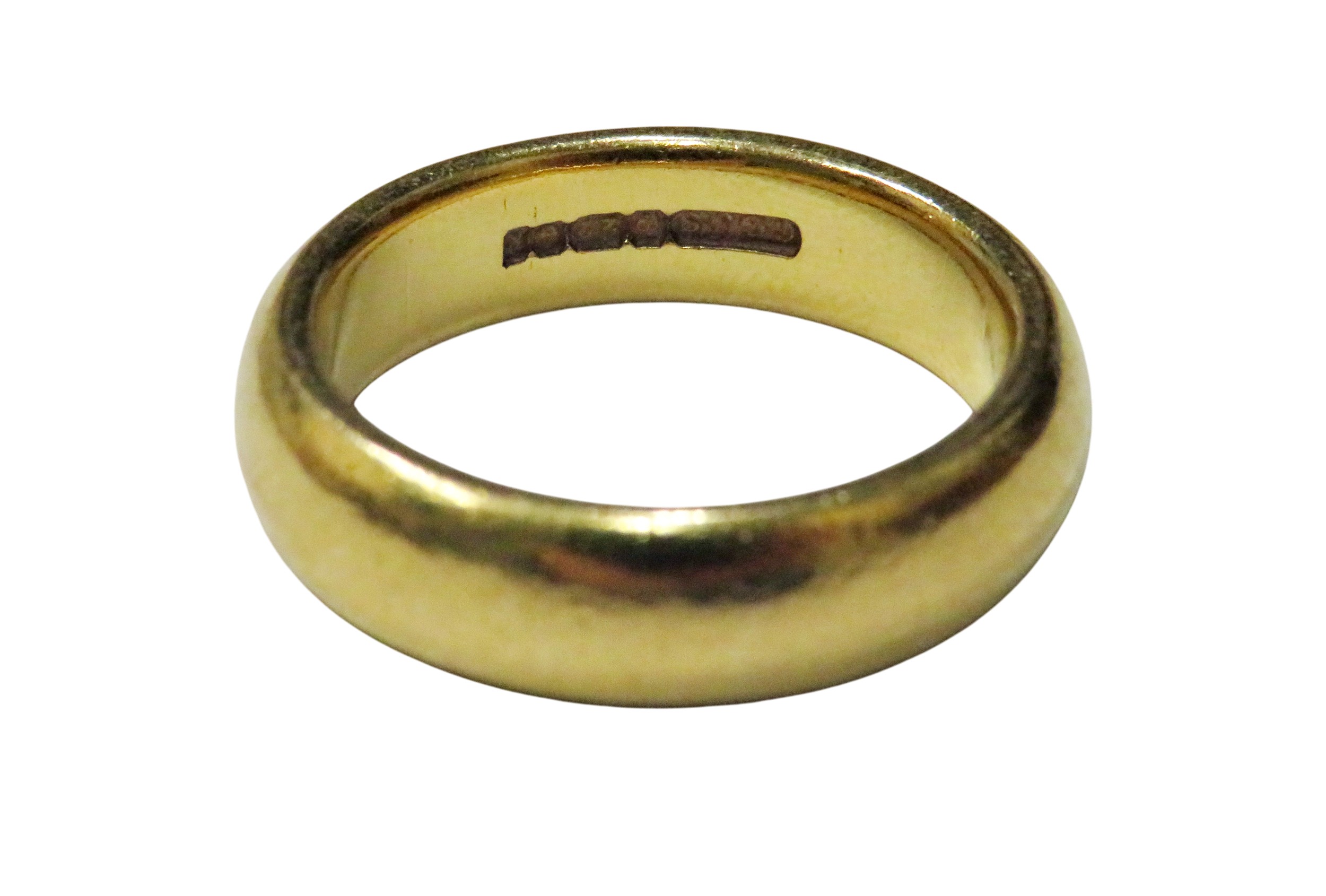 A vintage 22ct gold court shaped wedding band, hallmarks for Charles Green & Son Ltd, Birmingham 1984, 5.8mm wide, size N+, 13g; in a 'W Bruford & Son Ltd' Exeter box