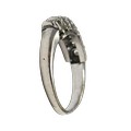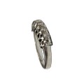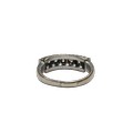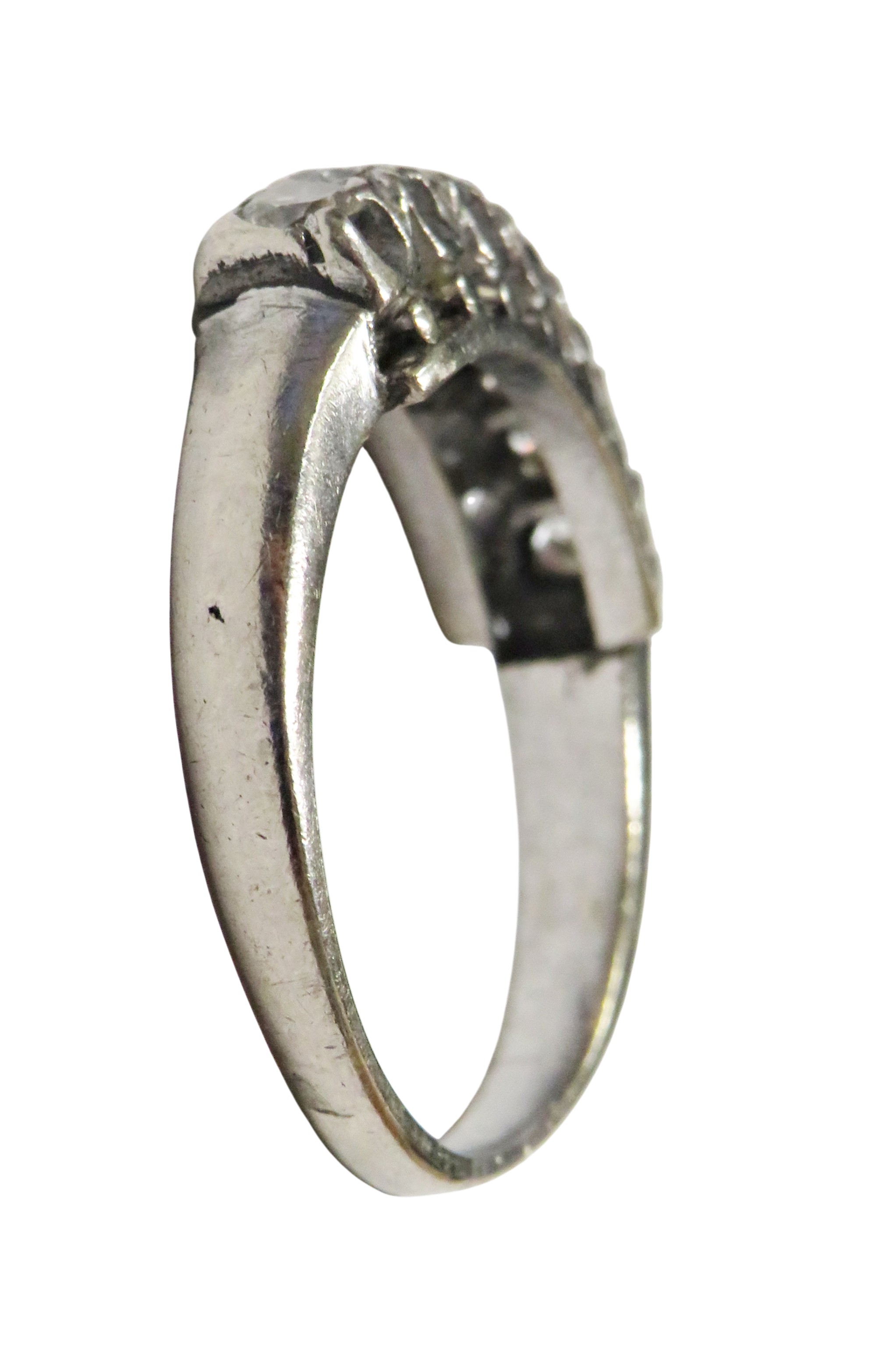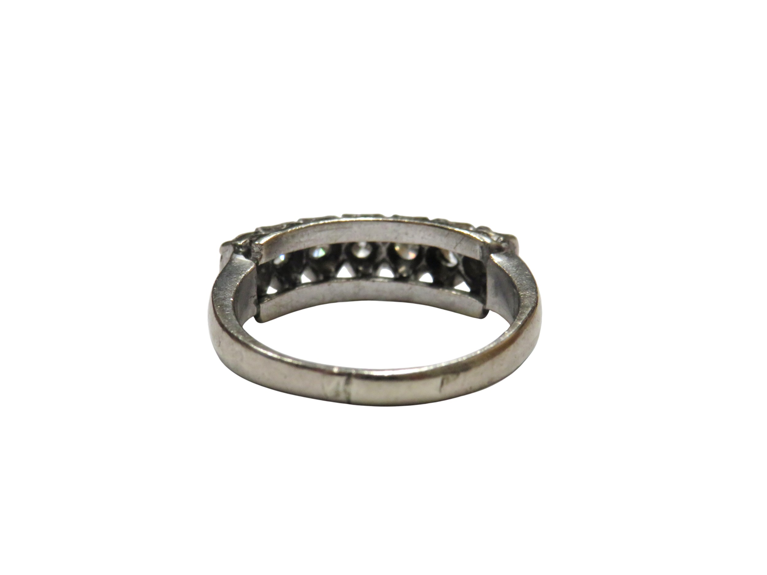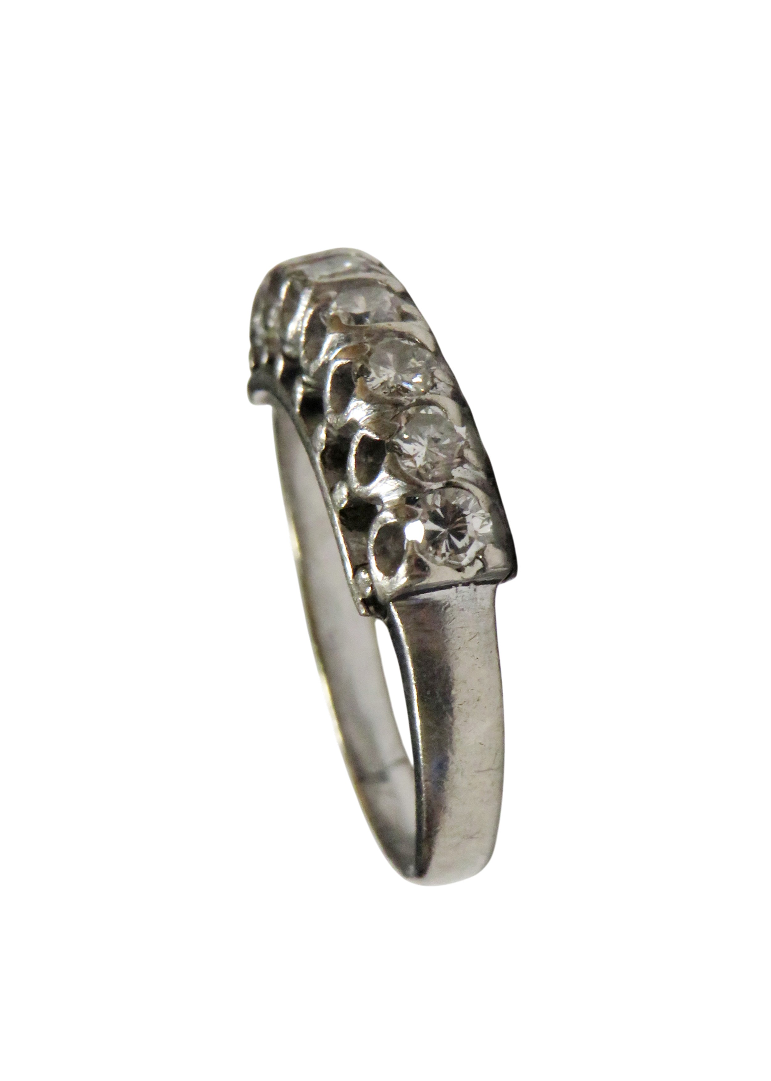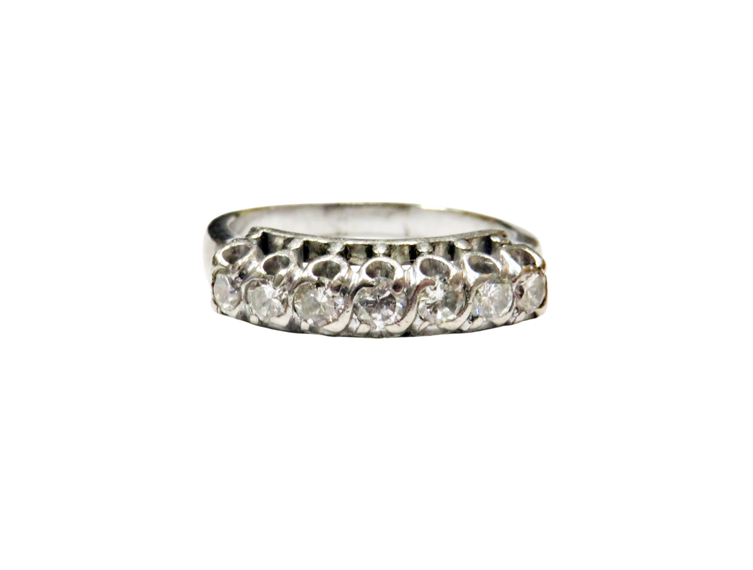 A diamond seven stone ring, the round brilliants approx. 0.70cts total, all claw set in white with scroll spacers, on a white tapering D-section shank, unmarked, size O, 3.8g gross