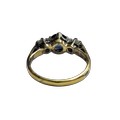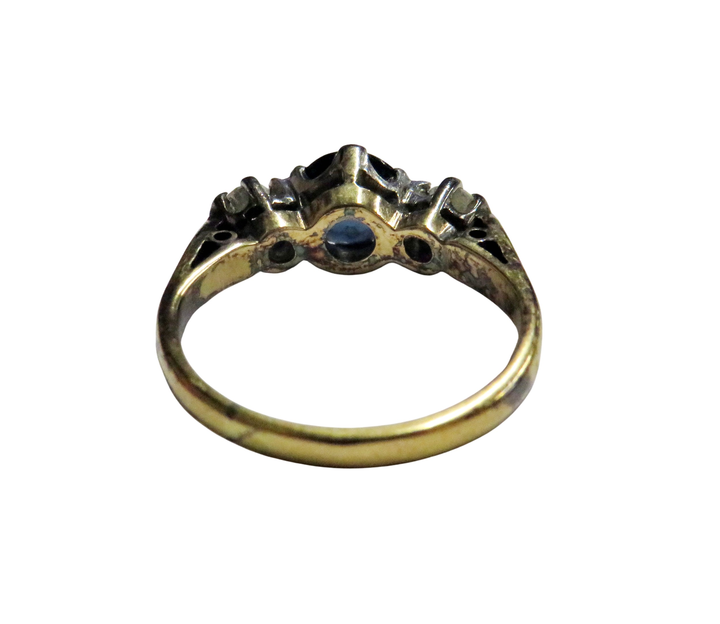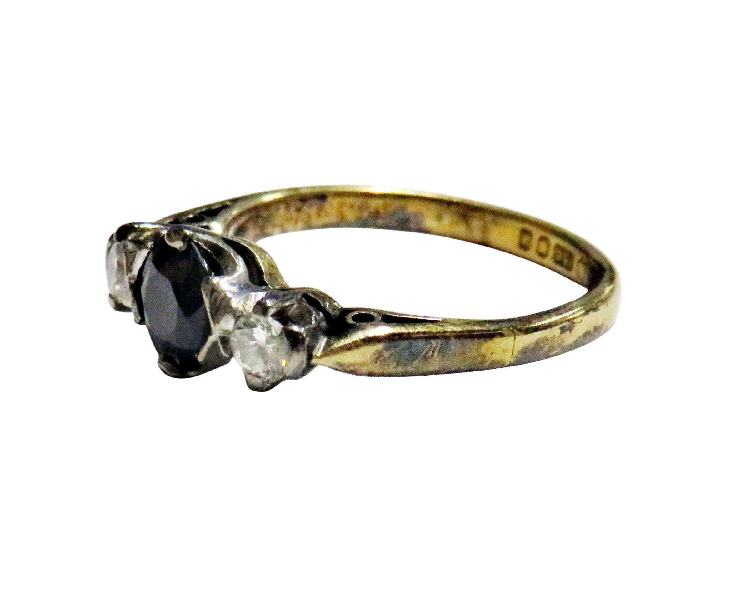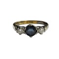 A vintage 18ct gold sapphire and diamond three stone ring, centred with a round mixed-cut green-ish blue sapphire approx. 0.64cts, between round brilliant diamonds, each approx. 0.07cts, all claw set in white on a yellow D-section shank with hallmarks for London 1975, size about J, 3g gross