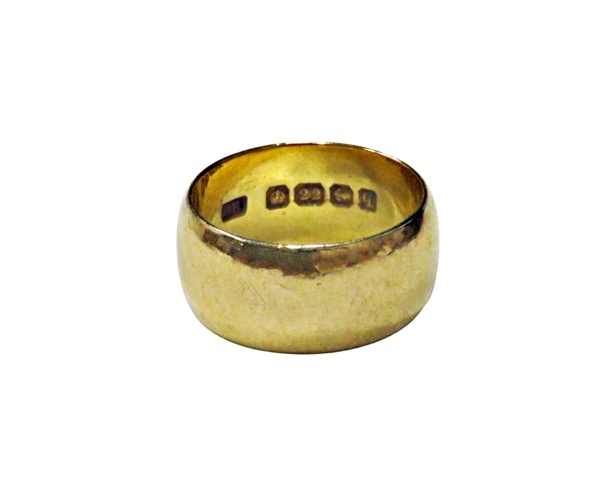 An early 20th century 22ct gold broad wedding band, hallmarks for Birmingham 1915, 9mm wide, size leading-edge L, 9g