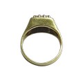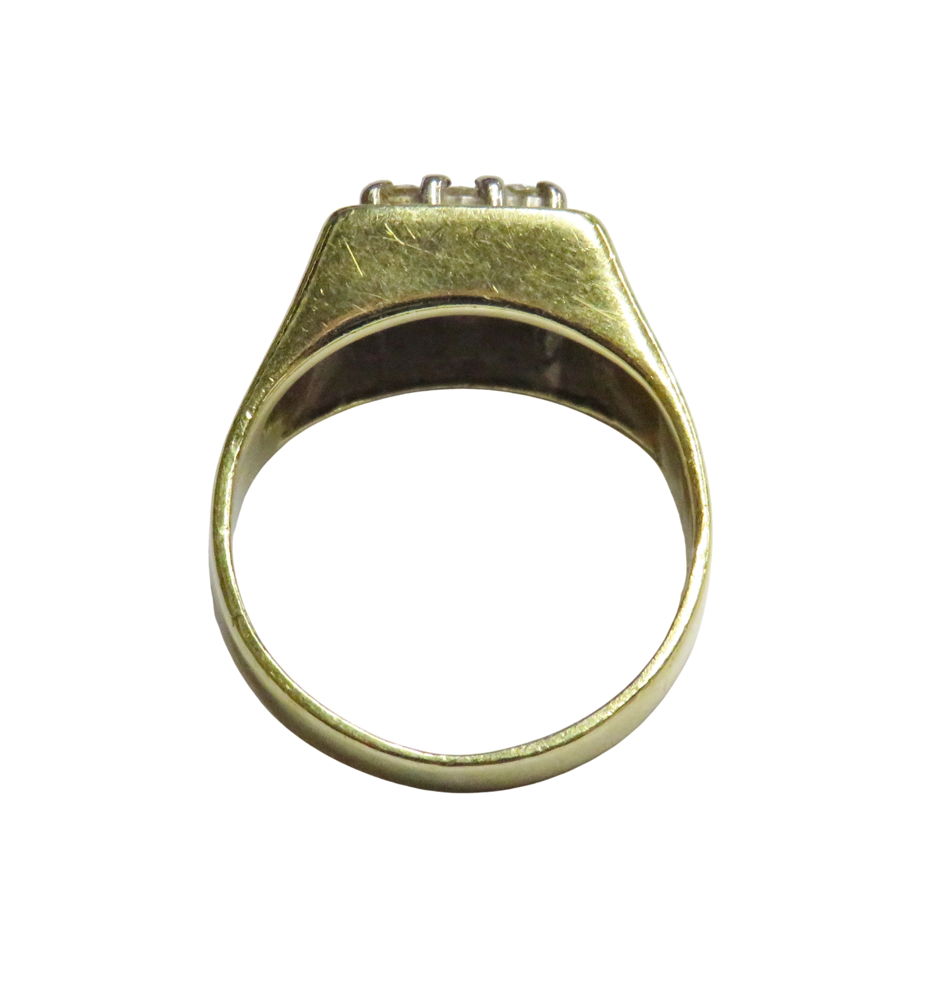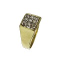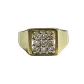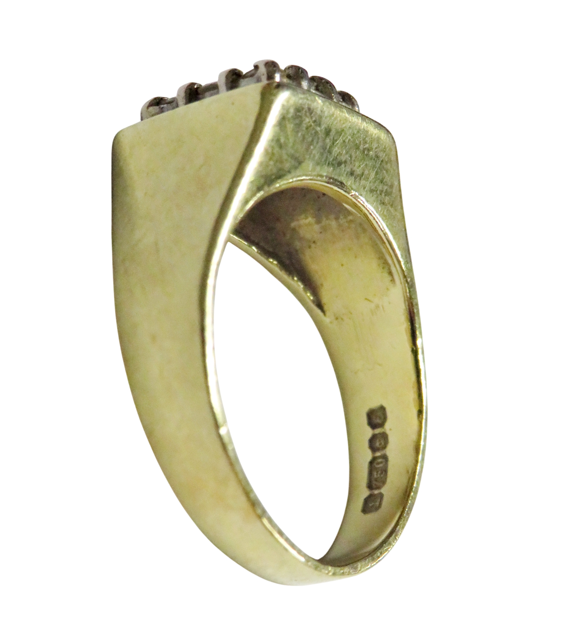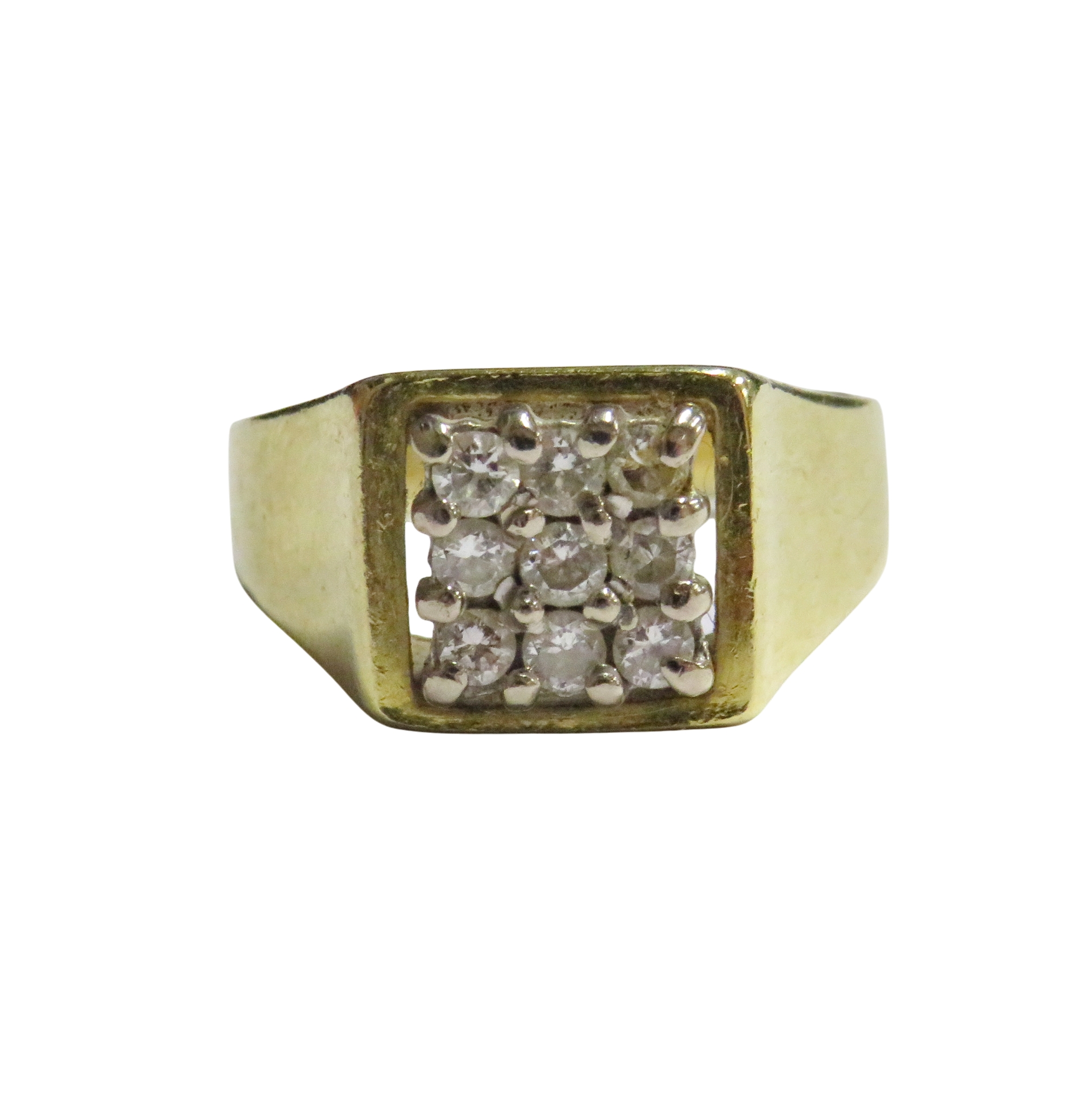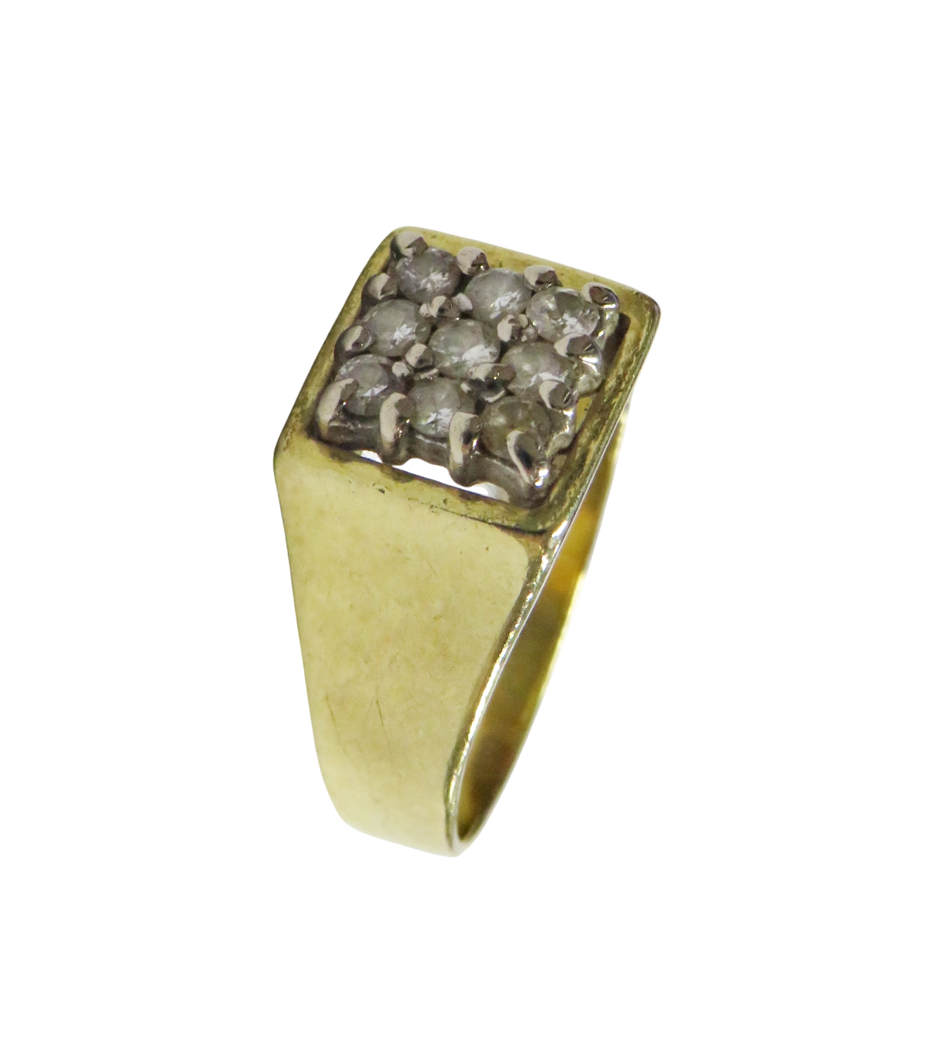 A vintage 18ct gold and small diamond square cluster ring, the nine small round brilliants claw set within a plain border, on a flat-section shank with tapering shoulders, hallmarks for London 1979, size I, 4.8g gross