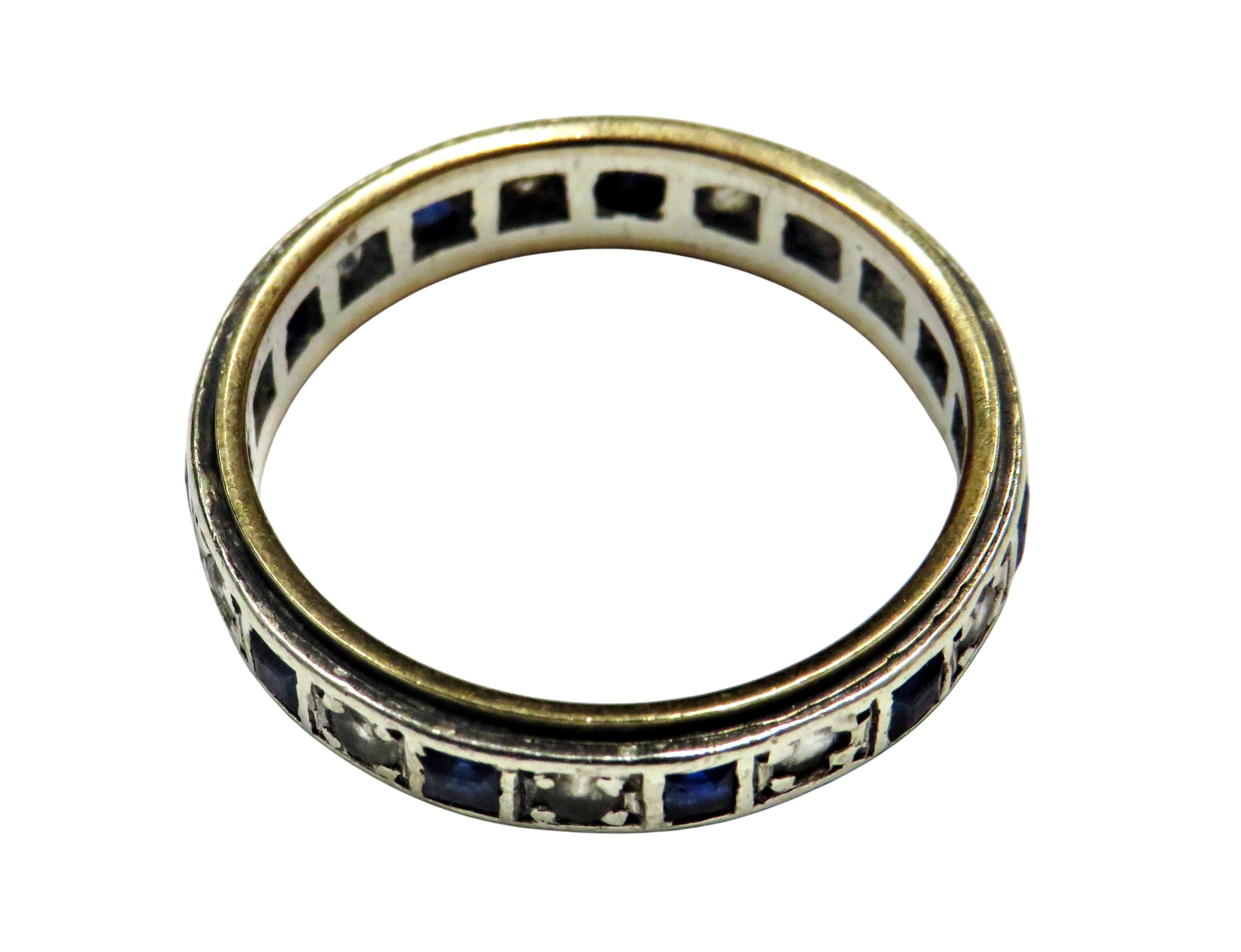 A vintage gold and synthetic blue and white spinel eternity ring, alternately set with square blue and round near-colourless stones, in bi-colour metal stamped '9ct', approx. 4.5mm wide, size N, 2.7g gross