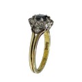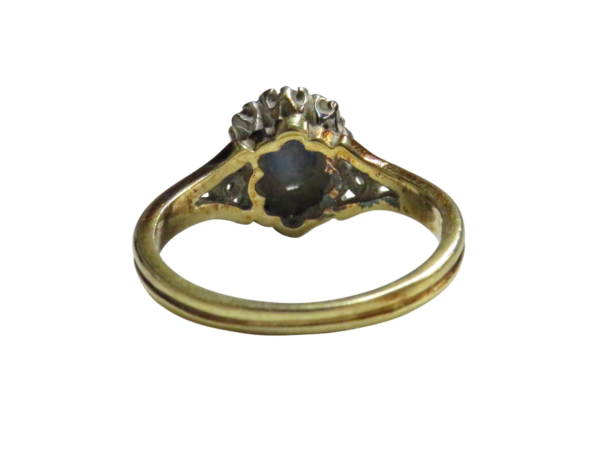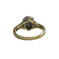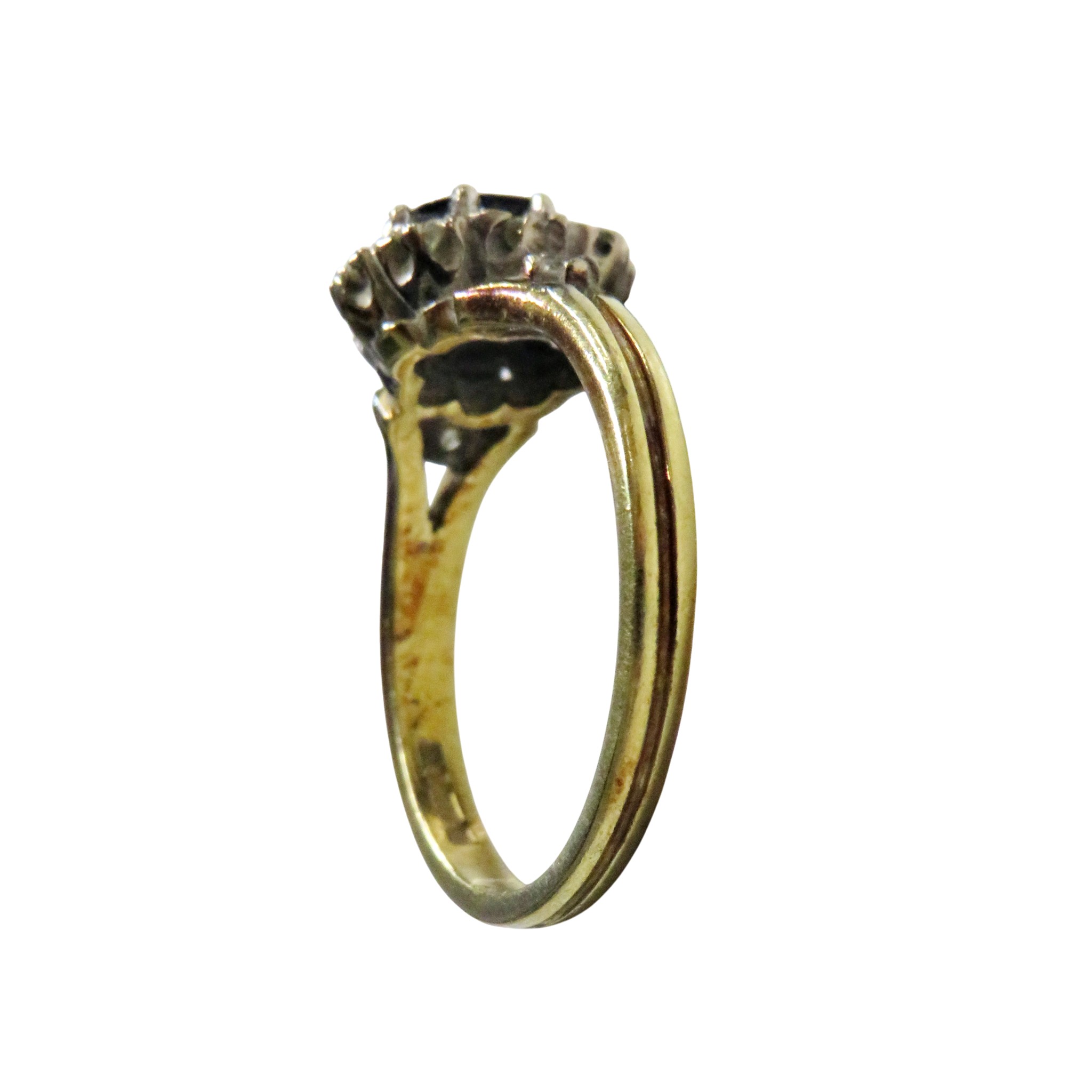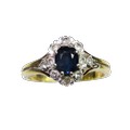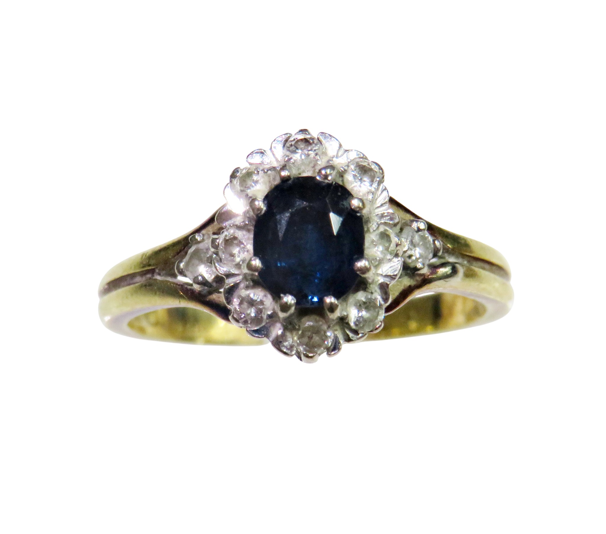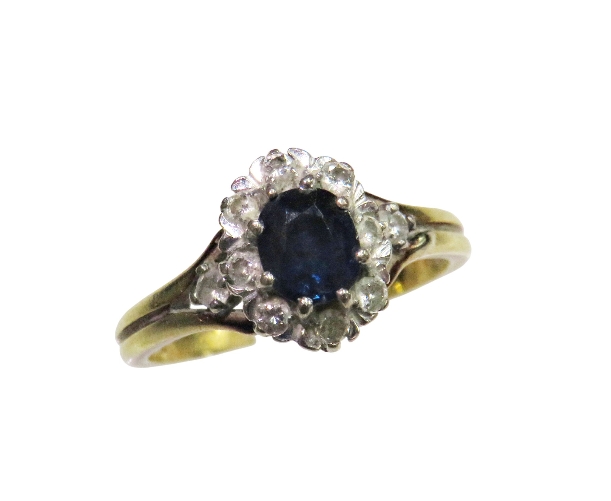 A vintage 18ct gold, sapphire and diamond oval cluster ring, centred with an oval mixed-cut sapphire within a small round brilliant diamond eight stone border, all claw set in white on a yellow D-section shank with diamond single stone shoulders, hallmarks for London 1978, size L, 3.4g gross